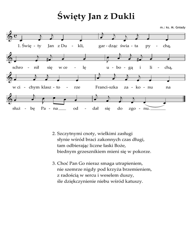 Święty Jan z Dukli &c œ j œ j œ 1. Świę ‐ ty &œ schro ‐ Jan z Du j #œ j œ nił &œ j œ &œ j œ œ œ w ci ‐ chym klasz ‐ to służ ‐ bę ‐ kli, œ Pa ‐ na ‐ œ ‐ lę œ rze j œ œ J j œ j œ j œ œ j œ ‐ dał j œ # œj u ‐ bo ‐ gą j œ Franci‐szka œ od j œ gar ‐ dząc świa ‐ ta œ w ce j œ œ J œ œ się j œ m.: ks. M. Gniady j œ się j œ j œ do py œ ‐ chą, œ i li j œ œ ‐ chą, œ œ za ‐ ko ‐ nu j œ œ zgo ‐ nu. 2. Szczytnymi cnoty, wielkimi zasługi słynie wśród braci zakonnych czas długi, tam odbierając liczne łaski Boże, biednym grzesznikiem mieni się w pokorze. 3. Choć Pan Go nieraz smaga utrapieniem, nie szemrze nigdy pod krzyża brzemieniem, z radością w sercu i weselem duszy, śle dziękczynienie niebu wśród katuszy. na œ
