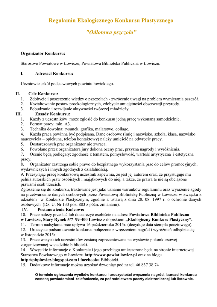 Regulamin Ekologicznego Konkursu Plastycznego "Odlotowa pszczoła” Organizator Konkursu: Starostwo Powiatowe w Łowiczu, Powiatowa Biblioteka Publiczna w Łowiczu. I. Adresaci Konkursu: Uczniowie szkół podstawowych powiatu łowickiego. II. Cele Konkursu: 1. Zdobycie i poszerzenie wiedzy o pszczołach - zwrócenie uwagi na problem wymierania pszczół. 2. Kształtowanie postaw proekologicznych, zdobycie umiejętności obserwacji przyrody. 3. Pobudzanie i rozwijanie aktywności twórczej młodzieży. III. Zasady Konkursu: 1. Każdy z uczestników może zgłosić do konkursu jedną pracę wykonaną samodzielnie. 2. Format pracy: min. A3. 3. Technika dowolna: rysunek, grafika, malarstwo, collage. 4. Każda praca powinna być podpisana. Dane osobowe (imię i nazwisko, szkoła, klasa, nazwisko nauczyciela – opiekuna, telefon kontaktowy) należy umieścić na odwrocie pracy. 5. Dostarczonych prac organizator nie zwraca. 6. Powołane przez organizatora jury dokona oceny prac, przyzna nagrody i wyróżnienia. 7. Ocenie będą podlegały: zgodność z tematem, pomysłowość, wartość artystyczna i estetyczna pracy. 8. Organizator zastrzega sobie prawo do bezpłatnego wykorzystania prac do celów promocyjnych, wydawniczych i innych zgodnych z działalnością. 9. Przesyłając pracę konkursową uczestnik zapewnia, że jest jej autorem oraz, że przysługuje mu pełnia autorskich praw osobistych i majątkowych do niej, a także, że prawa te nie są obciążone prawami osób trzecich. Zgłoszenie się do konkursu, traktowane jest jako uznanie warunków regulaminu oraz wyrażenie zgody na przetwarzanie danych osobowych przez Powiatową Bibliotekę Publiczną w Łowiczu w związku z udziałem w Konkursie Plastycznym, zgodnie z ustawą z dnia 28. 08. 1997 r. o ochronie danych osobowych (Dz. U. Nr 133 poz. 883 z późn. zmianami). IV. Postanowienia Końcowe: 10. Prace należy przesłać lub dostarczyć osobiście na adres: Powiatowa Biblioteka Publiczna w Łowiczu, Stary Rynek 5/7 99-400 Łowicz z dopiskiem „Ekologiczny Konkurs Plastyczny”. 11. Termin nadsyłania prac upływa 16 października 2015r. (decyduje data stempla pocztowego). 12. Uroczyste podsumowanie konkursu połączone z wręczeniem nagród i wyróżnień odbędzie się w listopadzie 2015r. 13. Prace wszystkich uczestników zostaną zaprezentowane na wystawie pokonkursowej zorganizowanej w siedzibie biblioteki. 14. Wszystkie informacje o Konkursie i jego przebiegu umieszczane będą na stronie internetowej Starostwa Powiatowego w Łowiczu http://www.powiat.lowicz.pl oraz na blogu http://pbplowicz.blogspot.com i facebooku Biblioteki. 15. Dodatkowe informacje można uzyskać dzwoniąc pod nr tel. 46 837 38 74 O terminie ogłoszenia wyników konkursu i uroczystości wręczenia nagród, laureaci konkursu zostaną powiadomieni telefonicznie, za pośrednictwem poczty elektronicznej lub listownie.