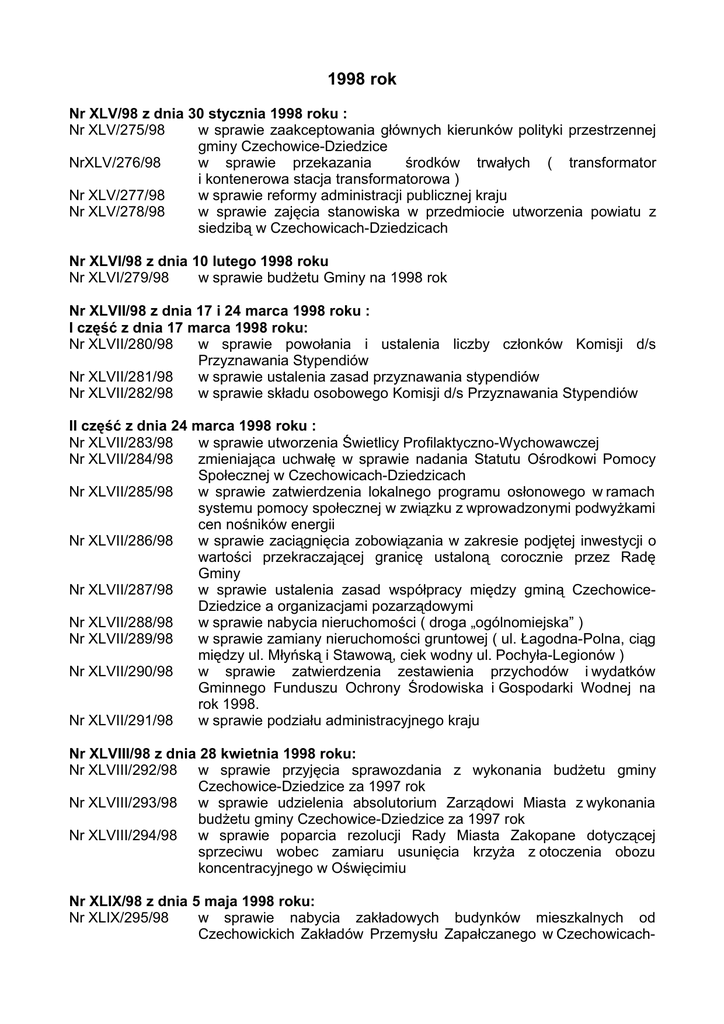 1998 rok Nr XLV/98 z dnia 30 stycznia 1998 roku : Nr XLV/275/98 w sprawie zaakceptowania głównych kierunków polityki przestrzennej gminy Czechowice-Dziedzice NrXLV/276/98 w sprawie przekazania środków trwałych ( transformator i kontenerowa stacja transformatorowa ) Nr XLV/277/98 w sprawie reformy administracji publicznej kraju Nr XLV/278/98 w sprawie zajęcia stanowiska w przedmiocie utworzenia powiatu z siedzibą w Czechowicach-Dziedzicach Nr XLVI/98 z dnia 10 lutego 1998 roku Nr XLVI/279/98 w sprawie budżetu Gminy na 1998 rok Nr XLVII/98 z dnia 17 i 24 marca 1998 roku : I część z dnia 17 marca 1998 roku: Nr XLVII/280/98 w sprawie powołania i ustalenia liczby członków Komisji d/s Przyznawania Stypendiów Nr XLVII/281/98 w sprawie ustalenia zasad przyznawania stypendiów Nr XLVII/282/98 w sprawie składu osobowego Komisji d/s Przyznawania Stypendiów II część z dnia 24 marca 1998 roku : Nr XLVII/283/98 w sprawie utworzenia Świetlicy Profilaktyczno-Wychowawczej Nr XLVII/284/98 zmieniająca uchwałę w sprawie nadania Statutu Ośrodkowi Pomocy Społecznej w Czechowicach-Dziedzicach Nr XLVII/285/98 w sprawie zatwierdzenia lokalnego programu osłonowego w ramach systemu pomocy społecznej w związku z wprowadzonymi podwyżkami cen nośników energii Nr XLVII/286/98 w sprawie zaciągnięcia zobowiązania w zakresie podjętej inwestycji o wartości przekraczającej granicę ustaloną corocznie przez Radę Gminy Nr XLVII/287/98 w sprawie ustalenia zasad współpracy między gminą CzechowiceDziedzice a organizacjami pozarządowymi Nr XLVII/288/98 w sprawie nabycia nieruchomości ( droga „ogólnomiejska” ) Nr XLVII/289/98 w sprawie zamiany nieruchomości gruntowej ( ul. Łagodna-Polna, ciąg między ul. Młyńską i Stawową, ciek wodny ul. Pochyła-Legionów ) Nr XLVII/290/98 w sprawie zatwierdzenia zestawienia przychodów i wydatków Gminnego Funduszu Ochrony Środowiska i Gospodarki Wodnej na rok 1998. Nr XLVII/291/98 w sprawie podziału administracyjnego kraju Nr XLVIII/98 z dnia 28 kwietnia 1998 roku: Nr XLVIII/292/98 w sprawie przyjęcia sprawozdania z wykonania budżetu gminy Czechowice-Dziedzice za 1997 rok Nr XLVIII/293/98 w sprawie udzielenia absolutorium Zarządowi Miasta z wykonania budżetu gminy Czechowice-Dziedzice za 1997 rok Nr XLVIII/294/98 w sprawie poparcia rezolucji Rady Miasta Zakopane dotyczącej sprzeciwu wobec zamiaru usunięcia krzyża z otoczenia obozu koncentracyjnego w Oświęcimiu Nr XLIX/98 z dnia 5 maja 1998 roku: Nr XLIX/295/98 w sprawie nabycia zakładowych budynków mieszkalnych od Czechowickich Zakładów Przemysłu Zapałczanego w Czechowicach- Nr XLIX/296/98 Nr XLIX/297/98 Nr XLIX/298/98 Nr XLIX/299/98 Nr XLIX/300/98 Nr XLIX/301/98 Nr XLIX/302/98 Nr XLIX/303/98 Nr XLIX/304/98 Dziedzicach w sprawie zamiany nieruchomości gruntowej ( ciąg pieszy miedzy Osiedlem Północ a ul. Narutowicza ) w sprawie zamiany nieruchomości gruntowej ( łącznik ul. Korfantego z ul. Objazdową ) w sprawie nabycia nieruchomości ( ul. Polna ) w sprawie ustalenia zasad zbywania i obciążania nieruchomości stanowiących własność Gminy, zamiany pomiędzy Gminą a osobami fizycznymi lub prawnymi oraz nabywania nieruchomości na rzecz Gminy w sprawie określenia zasad sprzedaży lokali mieszkalnych i użytkowych stanowiących własność Gminy Czechowice-Dziedzice oraz zasad udzielania bonifikat od ceny ich sprzedaży w sprawie przyjęcia ramowego harmonogramu działań związanych z realizacją gminnego programu profilaktyki i rozwiązywania problemów alkoholowych w Czechowicach-Dziedzicach w 1998 r. w sprawie ogłoszenia konkursu na stanowisko dyrektora Szkoły Podstawowej Nr 3 w Ligocie w sprawie powołania Komisji Konkursowej do wyłonienia kandydata na stanowisko dyrektora Szkoły Podstawowej Nr 3 w Ligocie w sprawie przekazania środków trwałych Nr L/98 z dnia 2 czerwca 1998 roku: Nr L/305/98 w sprawie uchwalenia studium uwarunkowań i kierunków zagospodarowania przestrzennego gminy Czechowice-Dziedzice Nr L/306/98 w sprawie ustalenia wysokości stawek czynszowych z tytułu dzierżawy gruntów stanowiących własność Gminy Czechowice-Dziedzice Nr L/307/98 w sprawie sprzedaży środków trwałych ( baraki socjalno-biurowe ) Nr L/308/98 w sprawie utworzenia jednostki budżetowej o nazwie Zespół Obsługi Placówek Oświatowych Nr L/309/98 w sprawie podziału administracyjnego kraju Nr L/310/98 w sprawie zmian w budżecie Gminy na rok 1998 Nr L/311/98 w sprawie określenia zakresu i zasad przyznawania dotacji dla jednostek gospodarki pozabudżetowej Nr L/312/98 w sprawie zaciągnięcia kredytu długoterminowego na dofinansowanie budowy zadania inwestycyjnego pn. „Szkoła Podstawowa Nr 1 Ligota – budowa sali gimnastycznej” Nr L/313/98 w sprawie szczegółowych zasad utrzymania czystości i porządku na terenie gminy Czechowice-Dziedzice Nr L/314/98 w sprawie opłat za składowanie i unieszkodliwianie odpadów na miejskim wysypisku śmieci w Czechowicach-Dziedzicach Nr L/315/98 w sprawie wspólnej inwestycji z Gminą Chybie pod nazwą „Budowa kolektora ścieków sanitarnych z Chybia i zachodniej części Gminy Czechowice-Dziedzice do oczyszczalni ścieków w CzechowicachDziedzicach Nr L/316/98 w sprawie oddanie Nadwiślańskiej Spółce Energetycznej Spółce z o.o. w Bieruniu w bezpłatne użytkowanie magistrali trójprzewodowej c.o. w celu realizacji zadań własnych Gminy w zakresie dostawy energii cieplnej Nr L/317/98 w sprawie nieodpłatnego przejęcia rurociągu ciepłowniczego od Fabryki Sprzętu Elektrotechnicznego „KONTAKT” S.A. w celu realizacji zadań własnych Gminy w zakresie dostawy energii cieplnej Nr L/318/98 w sprawie przekształcenia Żłobka w Ośrodku Małego Dziecka Nr L/319/98 zmieniająca uchwałę w sprawie nadania Statutu Ośrodkowi Pomocy Nr L/320/98 Nr L/321/98 Społecznej w Czechowicach-Dziedzicach w sprawie określenia limitu wydawania nowych zezwoleń na przewóz osób taksówką w gminie Czechowice-Dziedzice