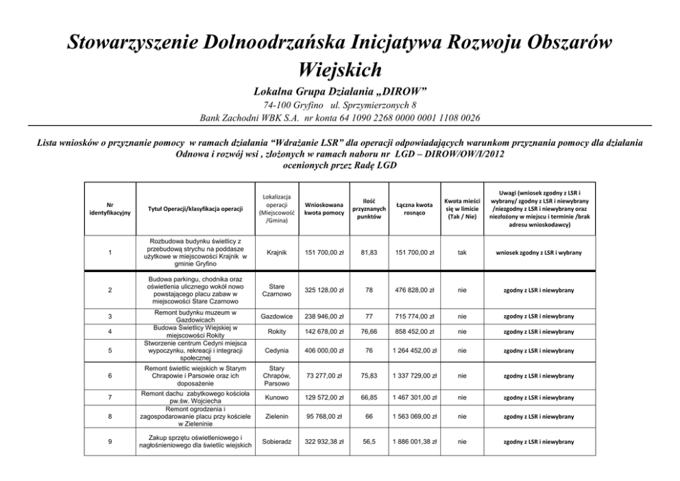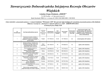 Stowarzyszenie Dolnoodrzańska Inicjatywa Rozwoju Obszarów Wiejskich Lokalna Grupa Działania „DIROW” 74-100 Gryfino ul. Sprzymierzonych 8 Bank Zachodni WBK S.A. nr konta 64 1090 2268 0000 0001 1108 0026 Lista wniosków o przyznanie pomocy w ramach działania “Wdrażanie LSR” dla operacji odpowiadających warunkom przyznania pomocy dla działania Odnowa i rozwój wsi , złożonych w ramach naboru nr LGD – DIROW/OW/I/2012 ocenionych przez Radę LGD Łączna kwota rosnąco Kwota mieści się w limicie (Tak / Nie) Uwagi (wniosek zgodny z LSR i wybrany/ zgodny z LSR i niewybrany /niezgodny z LSR i niewybrany oraz niezłożony w miejscu i terminie /brak adresu wnioskodawcy) Nr identyfikacyjny Tytuł Operacji/klasyfikacja operacji Lokalizacja operacji (Miejscowość /Gmina) 1 Rozbudowa budynku świetlicy z przebudową strychu na poddasze użytkowe w miejscowości Krajnik w gminie Gryfino Krajnik 151 700,00 zł 81,83 151 700,00 zł tak wniosek zgodny z LSR i wybrany 2 Budowa parkingu, chodnika oraz oświetlenia ulicznego wokół nowo powstającego placu zabaw w miejscowości Stare Czarnowo Stare Czarnowo 325 128,00 zł 78 476 828,00 zł nie zgodny z LSR i niewybrany Gazdowice 238 946,00 zł 77 715 774,00 zł nie zgodny z LSR i niewybrany Rokity 142 678,00 zł 76,66 858 452,00 zł nie zgodny z LSR i niewybrany Cedynia 406 000,00 zł 76 1 264 452,00 zł nie zgodny z LSR i niewybrany Stary Chrapów, Parsowo 73 277,00 zł 75,83 1 337 729,00 zł nie zgodny z LSR i niewybrany Kunowo 129 572,00 zł 66,85 1 467 301,00 zł nie zgodny z LSR i niewybrany Zielenin 95 768,00 zł 66 1 563 069,00 zł nie zgodny z LSR i niewybrany Sobieradz 322 932,38 zł 56,5 1 886 001,38 zł nie zgodny z LSR i niewybrany 3 4 5 6 7 8 9 Remont budynku muzeum w Gazdowicach Budowa Świetlicy Wiejskiej w miejscowości Rokity Stworzenie centrum Cedyni miejsca wypoczynku, rekreacji i integracji społecznej Remont świetlic wiejskich w Starym Chrapowie i Parsowie oraz ich doposażenie Remont dachu zabytkowego kościoła pw.św. Wojciecha Remont ogrodzenia i zagospodarowanie placu przy kościele w Zieleninie Zakup sprzętu oświetleniowego i nagłośnieniowego dla świetlic wiejskich Wnioskowana kwota pomocy Ilość przyznanych punktów