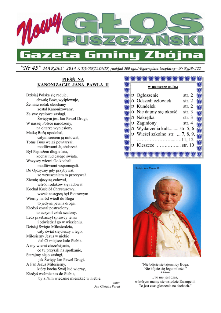 *Nr 45* MARZEC 2014 r. KWARTALNIK /nakład 300 egz./ Egzemplarz bezpłatny - Nr Rej.Pr.122 PIEŚŃ NA KANONIZACJĘ JANA PAWŁA II Dzisiaj Polska się raduje, chwałę Bożą wyśpiewuje, Że nasz rodak ukochany został Kanonizowany. Za swe życiowe zasługi, Świętym jest Jan Paweł Drugi, W naszej Polsce narodzony, na ołtarze wyniesiony. Matkę Bożą upodobał, całym sercem ją miłował, Totus Tuus wciąż powtarzał, modlitwami Ją obdarzał. Był Papieżem długie lata, kochał lud całego świata. Wszyscy wierni Go kochali, modlitwami wspomagali. Do Ojczyzny gdy przybywał, ze wzruszeniem to przeżywał. Ziemię ojczystą całował, wśród rodaków się radował. Kochał Kościół Chrystusowy, wszak następcą był Piotrowym. Wierny naród wiódł do Boga to jedyna pewna droga. Kiedyś został postrzelony, to uczynił człek szalony. Lecz przebaczył sprawcy temu i odwiedził go w więzieniu. Dzisiaj Święto Miłosierdzia, cały świat się cieszy z tego, Miłosierny Jezus w niebie dał Ci miejsce koło Siebie. A my wierni chrześcijanie, co tu przyszli na spotkanie, Starajmy się o zasługi, jak Święty Jan Paweł Drugi. A Pan Jezus Miłosierny, który kocha Swój lud wierny, Kiedyś weźmie nas do Siebie, by z Nim wiecznie mieszkać w niebie. autor Jan Gietek z Pored w numerze m.in.: Ogłoszenie str. 2 Odszedł człowiek str. 2 Kundelek str. 2 Nie dajmy się okraść str. 3 Nakrętka str. 3 Zaginiony str. 4 Wydarzenia kult........ str. 5, 6 Wieści szkolne str. ... 7, 8, 9, …………………....….11, 12 Kleszcze …….……... str. 10 Święty Jan Paweł II "Nie bójcie się tajemnicy Boga. Nie bójcie się Jego miłości." ***** „To nie jest czas, w którym mamy się wstydzić Ewangelii. To jest czas głoszenia na dachach.” OGŁOSZENIE o przystąpieniu do sporządzenia zmiany studium uwarunkowań i kierunków zagospodarowania przestrzennego Gminy Zbójna Na podstawie art. 11 pkt 1 ustawy z dnia 27 marca 2003r. o planowaniu i zagospodarowaniu przestrzennym (Dz.U. z 2012r. poz. 647 z późn. zm.) zawiadamiam o podjęciu przez Radę Gminy Zbójna uchwały Nr XXIV/129/13 z dnia 20 sierpnia 2013r w sprawie przystąpienia do sporządzenia zmiany studium uwarunkowań i kierunków zagospodarowania przestrzennego Gminy Zbójna. Zmiana studium uwarunkowań i kierunków zagospodarowania przestrzennego gminy dotyczy obszaru całej Gminy Zbójna. Zainteresowani mogą składać wnioski dotyczące zmiany studium. Wnioski mogą być składane na piśmie w siedzibie Urzędu Gminy Zbójna, 18-416 Zbójna, ul. Łomżyńska 64 w terminie do 30 kwietnia 2014 r. Wniosek powinien zawierać nazwisko, imię, nazwę i adres wnioskodawcy, przedmiot wniosku oraz oznaczenie nieruchomości, której dotyczy. Wójt Gminy Zbójna Zenon Białobrzeski ODSZEDŁ DOBRY CZŁOWIEK Odszedł od nas Dobry Człowiek. Odszedł na wieczysty dyżur w niebiańskim szpitalu wspaniały człowiek, doskonały lekarz, oddany przyjaciel wielu z nas. Stefan Iwanowski pełnił obowiązki ordynatora Oddziału Rehabilitacji Szpitala Wojewódzkiego w Łomży oraz spełniał się jako lekarz specjalista w ortopedii i traumatologii. Ironią losu jest fakt, że człowiek, który pomagał pacjentom po wylewach powracać do zdrowia zmarł w wyniku właśnie wylewu krwi do mózgu. Zaiste nieodgadniony jest Boski plan dotyczący obsady Niebios. Być może anielskim kręgosłupom potrzebny był dobry lekarz. Od kilku lat był de facto mieszkańcem naszej gminy, ponieważ tutaj właśnie zbudował sobie dom. Nigdy nie odmówił nikomu pomocy. Wiele osób ze Zbójnej i okolicy zawdzięcza Jemu zdrowie. Wszyscy, którzy znali Go bliżej wiedzą jak cudownym był człowiekiem i wszystkim tym osobom będzie Go naprawdę bardzo brakowało. Odszedł dobry, ciepły i pełen empatii człowiek. J. Zieliński KUNDELEK Prawie każdy, kto jeździ w stronę Nowogrodu, spotyka na poboczu drogi, na tzw. „Dębnickiej Górze” małego czarnego kundelka. Przemieszcza się wolno, wzdłuż drogi między szczytem wzniesienia, a Dębnikami, bacznie obserwując przejeżdżające samochody. Jest tutaj już około roku i cały czas sprawia wrażenie jakby na kogoś czekał. Czasem zrywa się gwałtownie, gdy warkot jakiegoś silnika wydaje mu się znajomy, ale zawsze to alarm fałszywy, bo skoro jego 2 właściciel tutaj go porzucił, to raczej już go stąd nie zabierze. Dobrzy ludzie czasem zatrzymują się i podrzucają kundelkowi jakieś jedzenie, ale on czeka przede wszystkim na swojego pana. Jakże ślepa i bezgraniczna potrafi być miłość zwierzęcia do człowieka, choć ów nie zawsze na nią zasługuje. Swoją drogą jak twarde musi mieć serce „ktoś” (mała litera z premedytacją), kto tak podłą rzecz uczynił. Sądzę, że dla takich „przyjaciół zwierząt” święty Franciszek przygotowuje specjalne sankcje. NOWY GŁOS PUSZCZAŃSKI - NR 45 - J.Z. NIE DAJMY SIĘ OKRAŚĆ! Apel Łomżyńskiej Policji Niezabezpieczone przez właściciela mienie jest łatwym łupem złodziei, dlatego apelujemy do Państwa – zabezpieczajmy nasze mienie i nie dajmy się okraść! Żyjemy w czasach gdzie włamania, kradzieże, niszczenie mienia są plagą, a rozległy charakter tego zjawiska sprawia, że szczególnie trudno jest z nim walczyć. Dlatego też Policja podejmuje działania profilaktycznoinformacyjne, mające na celu ograniczenie występowania tego typu zdarzeń. Należy jednak zauważyć, że skuteczność podejmowania wszelkich działań profilaktycznych wymaga aktywnego współdziałania na szczeblu Policja - Społeczeństwo, zarówno ze strony Policji, jak i mieszkańców danego terenu. Z przeprowadzanych na bieżąco analiz wynika, iż kradzieżom mienia czy też jego zniszczeniu można zapobiegać. Przyczyną wielu zdarzeń jest często niewłaściwy nadzór, utrata czujności właściciela lub zupełny brak za- bezpieczenia swojej własności. Złodziej wykorzystuje więc każdą z sytuacji, gdzie łatwo może dostać się na
