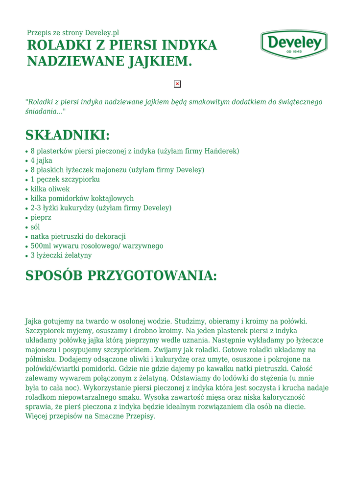Przepis ze strony Develey.pl ROLADKI Z PIERSI INDYKA NADZIEWANE JAJKIEM. "Roladki z piersi indyka nadziewane jajkiem będą smakowitym dodatkiem do świątecznego śniadania..." SKŁADNIKI: ● ● ● ● ● ● ● ● ● ● ● ● 8 plasterków piersi pieczonej z indyka (użyłam firmy Hańderek) 4 jajka 8 płaskich łyżeczek majonezu (użyłam firmy Develey) 1 pęczek szczypiorku kilka oliwek kilka pomidorków koktajlowych 2-3 łyżki kukurydzy (użyłam firmy Develey) pieprz sól natka pietruszki do dekoracji 500ml wywaru rosołowego/ warzywnego 3 łyżeczki żelatyny SPOSÓB PRZYGOTOWANIA: Jajka gotujemy na twardo w osolonej wodzie. Studzimy, obieramy i kroimy na połówki. Szczypiorek myjemy, osuszamy i drobno kroimy. Na jeden plasterek piersi z indyka układamy połówkę jajka którą pieprzymy wedle uznania. Następnie wykładamy po łyżeczce majonezu i posypujemy szczypiorkiem. Zwijamy jak roladki. Gotowe roladki układamy na półmisku. Dodajemy odsączone oliwki i kukurydzę oraz umyte, osuszone i pokrojone na połówki/ćwiartki pomidorki. Gdzie nie gdzie dajemy po kawałku natki pietruszki. Całość zalewamy wywarem połączonym z żelatyną. Odstawiamy do lodówki do stężenia (u mnie była to cała noc). Wykorzystanie piersi pieczonej z indyka która jest soczysta i krucha nadaje roladkom niepowtarzalnego smaku. Wysoka zawartość mięsa oraz niska kaloryczność sprawia, że pierś pieczona z indyka będzie idealnym rozwiązaniem dla osób na diecie. Więcej przepisów na Smaczne Przepisy.