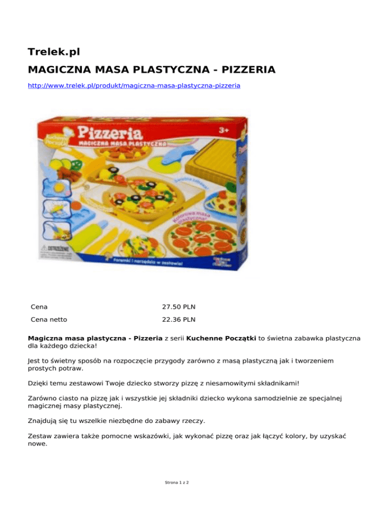 Trelek.pl MAGICZNA MASA PLASTYCZNA - PIZZERIA http://www.trelek.pl/produkt/magiczna-masa-plastyczna-pizzeria Cena 27.50 PLN Cena netto 22.36 PLN Magiczna masa plastyczna - Pizzeria z serii Kuchenne Początki to świetna zabawka plastyczna dla każdego dziecka! Jest to świetny sposób na rozpoczęcie przygody zarówno z masą plastyczną jak i tworzeniem prostych potraw. Dzięki temu zestawowi Twoje dziecko stworzy pizzę z niesamowitymi składnikami! Zarówno ciasto na pizzę jak i wszystkie jej składniki dziecko wykona samodzielnie ze specjalnej magicznej masy plastycznej. Znajdują się tu wszelkie niezbędne do zabawy rzeczy. Zestaw zawiera także pomocne wskazówki, jak wykonać pizzę oraz jak łączyć kolory, by uzyskać nowe. Strona 1 z 2 ZAWARTOŚĆ: - magiczna masa plastyczna: niebieska 10g, żółta 10g, szary 10g, czerwony 10g, - pudełko do pizzy, - łopatka do pizzy, - nóż do pizzy, - nóż i widelec, - wałek, - talerz, - forma standardowa, - przyrząd do formowania masy. WIEK: 3+ WYMIARY: opakowania: 23 x 18 x 5,5 cm WAGA: ok 220 g UWAGI: Nieodpowiednie dla dzieci poniżej 3 roku życia. Ryzyko udławienia - małe części. Strona 2 z 2