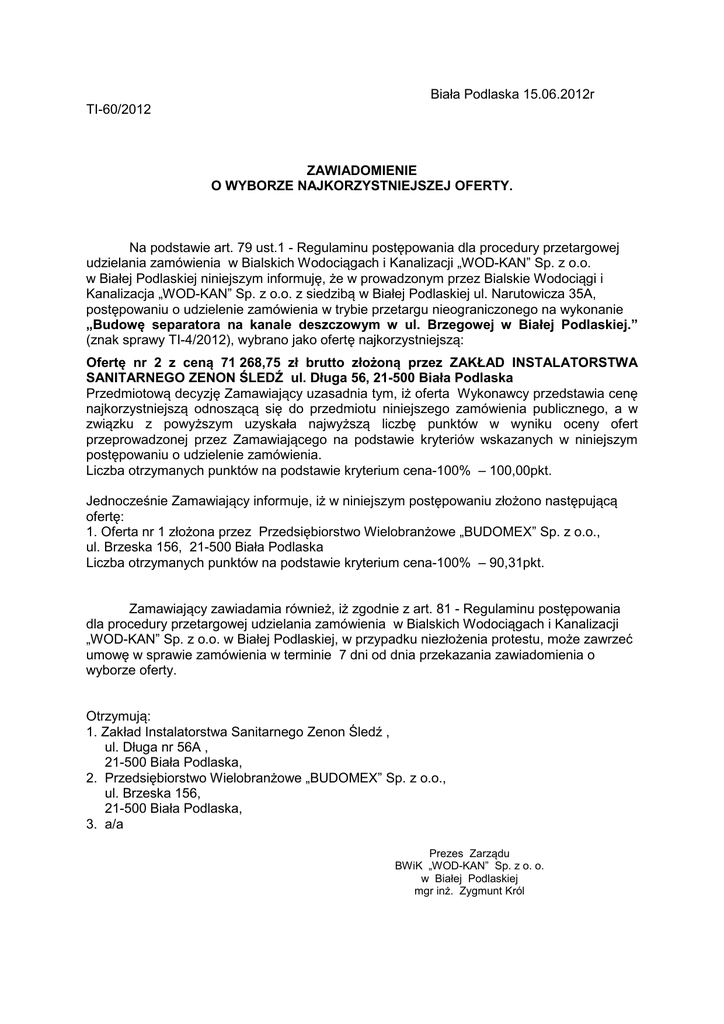 Biała Podlaska 15.06.2012r TI-60/2012 ZAWIADOMIENIE O WYBORZE NAJKORZYSTNIEJSZEJ OFERTY. Na podstawie art. 79 ust.1 - Regulaminu postępowania dla procedury przetargowej udzielania zamówienia w Bialskich Wodociągach i Kanalizacji „WOD-KAN” Sp. z o.o. w Białej Podlaskiej niniejszym informuję, że w prowadzonym przez Bialskie Wodociągi i Kanalizacja „WOD-KAN” Sp. z o.o. z siedzibą w Białej Podlaskiej ul. Narutowicza 35A, postępowaniu o udzielenie zamówienia w trybie przetargu nieograniczonego na wykonanie „Budowę separatora na kanale deszczowym w ul. Brzegowej w Białej Podlaskiej.” (znak sprawy TI-4/2012), wybrano jako ofertę najkorzystniejszą: Ofertę nr 2 z ceną 71 268,75 zł brutto złożoną przez ZAKŁAD INSTALATORSTWA SANITARNEGO ZENON ŚLEDŹ ul. Długa 56, 21-500 Biała Podlaska Przedmiotową decyzję Zamawiający uzasadnia tym, iż oferta Wykonawcy przedstawia cenę najkorzystniejszą odnoszącą się do przedmiotu niniejszego zamówienia publicznego, a w związku z powyższym uzyskała najwyższą liczbę punktów w wyniku oceny ofert przeprowadzonej przez Zamawiającego na podstawie kryteriów wskazanych w niniejszym postępowaniu o udzielenie zamówienia. Liczba otrzymanych punktów na podstawie kryterium cena-100% – 100,00pkt. Jednocześnie Zamawiający informuje, iż w niniejszym postępowaniu złożono następującą ofertę: 1. Oferta nr 1 złożona przez Przedsiębiorstwo Wielobranżowe „BUDOMEX” Sp. z o.o., ul. Brzeska 156, 21-500 Biała Podlaska Liczba otrzymanych punktów na podstawie kryterium cena-100% – 90,31pkt. Zamawiający zawiadamia również, iż zgodnie z art. 81 - Regulaminu postępowania dla procedury przetargowej udzielania zamówienia w Bialskich Wodociągach i Kanalizacji „WOD-KAN” Sp. z o.o. w Białej Podlaskiej, w przypadku niezłożenia protestu, może zawrzeć umowę w sprawie zamówienia w terminie 7 dni od dnia przekazania zawiadomienia o wyborze oferty. Otrzymują: 1. Zakład Instalatorstwa Sanitarnego Zenon Śledź , ul. Długa nr 56A , 21-500 Biała Podlaska, 2. Przedsiębiorstwo Wielobranżowe „BUDOMEX” Sp. z o.o., ul. Brzeska 156, 21-500 Biała Podlaska, 3. a/a Prezes Zarządu BWiK „WOD-KAN” Sp. z o. o. w Białej Podlaskiej mgr inż. Zygmunt Król