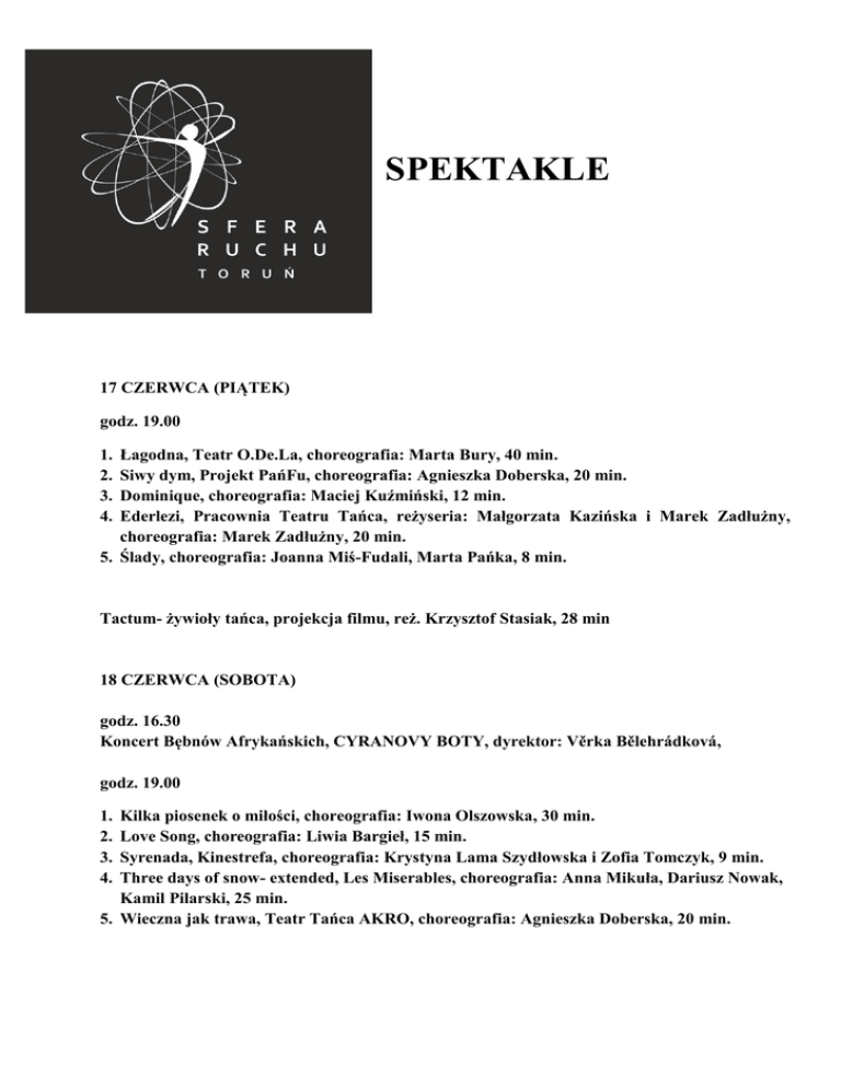 SPEKTAKLE 17 CZERWCA (PIĄTEK) godz. 19.00 Łagodna, Teatr O.De.La, choreografia: Marta Bury, 40 min. Siwy dym, Projekt PańFu, choreografia: Agnieszka Doberska, 20 min. Dominique, choreografia: Maciej Kuźmiński, 12 min. Ederlezi, Pracownia Teatru Tańca, reżyseria: Małgorzata Kazińska i Marek Zadłużny, choreografia: Marek Zadłużny, 20 min. 5. Ślady, choreografia: Joanna Miś-Fudali, Marta Pańka, 8 min. 1. 2. 3. 4. Tactum- żywioły tańca, projekcja filmu, reż. Krzysztof Stasiak, 28 min 18 CZERWCA (SOBOTA) godz. 16.30 Koncert Bębnów Afrykańskich, CYRANOVY BOTY, dyrektor: Věrka Bělehrádková, godz. 19.00 Kilka piosenek o miłości, choreografia: Iwona Olszowska, 30 min. Love Song, choreografia: Liwia Bargieł, 15 min. Syrenada, Kinestrefa, choreografia: Krystyna Lama Szydłowska i Zofia Tomczyk, 9 min. Three days of snow- extended, Les Miserables, choreografia: Anna Mikuła, Dariusz Nowak, Kamil Pilarski, 25 min. 5. Wieczna jak trawa, Teatr Tańca AKRO, choreografia: Agnieszka Doberska, 20 min. 1. 2. 3. 4.