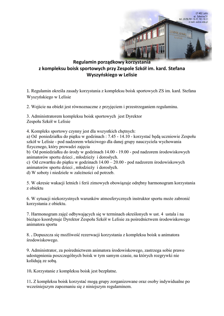 Regulamin porządkowy korzystania z kompleksu boisk sportowych przy Zespole Szkół im. kard. Stefana Wyszyńskiego w Lelisie 1. Regulamin określa zasady korzystania z kompleksu boisk sportowych ZS im. kard. Stefana Wyszyńskiego w Lelisie 2. Wejście na obiekt jest równoznaczne z przyjęciem i przestrzeganiem regulaminu. 3. Administratorem kompleksu boisk sportowych jest Dyrektor Zespołu Szkół w Lelisie 4. Kompleks sportowy czynny jest dla wszystkich chętnych: a) Od poniedziałku do piątku w godzinach : 7.45 - 14.10 - korzystać będą uczniowie Zespołu szkół w Lelisie - pod nadzorem właściwego dla danej grupy nauczyciela wychowania fizycznego, który prowadzi zajęcia b) Od poniedziałku do środy w godzinach 14.00 - 19.00 - pod nadzorem środowiskowych animatorów sportu dzieci , młodzieży i dorosłych. c) Od czwartku do piątku w godzinach 14.00 – 20.00 - pod nadzorem środowiskowych animatorów sportu dzieci , młodzieży i dorosłych. d) W soboty i niedziele w zależności od potrzeb. 5. W okresie wakacji letnich i ferii zimowych obowiązuje odrębny harmonogram korzystania z obiektu 6. W sytuacji niekorzystnych warunków atmosferycznych instruktor sportu może zabronić korzystania z obiektu. 7. Harmonogram zajęć odbywających się w terminach określonych w ust. 4 ustala i na bieżąco koordynuje Dyrektor Zespołu Szkół w Lelisie za pośrednictwem środowiskowego animatora sportu 8. . Dopuszcza się możliwość rezerwacji korzystania z kompleksu boisk u animatora środowiskowego. 9. Administrator, za pośrednictwem animatora środowiskowego, zastrzega sobie prawo udostępnienia poszczególnych boisk w tym samym czasie, na których rozgrywki nie kolidują ze sobą. 10. Korzystanie z kompleksu boisk jest bezpłatne. 11. Z kompleksu boisk korzystać mogą grupy zorganizowane oraz osoby indywidualne po wcześniejszym zapoznaniu się z niniejszym regulaminem. 12. Osoby korzystające z boiska: a) ponoszą odpowiedzialność za bezpieczeństwo we własnym zakresie b) mogą korzystać z pomieszczeń socjalnych 13. Administrator kompleksu boisk nie ponosi odpowiedzialności za rzeczy pozostawione w obiekcie. 14. Osoby prowadzące zajęcia z dziećmi w ramach godzin wychowania fizycznego, o których mowa w pkt.4a są odpowiedzialne za bezpieczeństwo oraz właściwą organizację zajęć, porządek i dyscyplinę ćwiczących 15. W przypadku zajęć pozalekcyjnych i treningów odbywających się w kompleksie boisk sportowych za bezpieczeństwo uczestników odpowiada: trener, instruktor, animator sportu 16. Warunkiem korzystania z kompleksu boisk jest posiadanie odpowiedniego stroju i obuwia sportowego. Na boisku piłkarskim dopuszcza się obuwie piłkarskie z małymi korkami z tworzywa sztucznego oraz obuwie typu halowego. 17. Wyposażenie i sprzęt sportowy znajdujący się na obiekcie należy użytkować zgodnie z jego przeznaczeniem. 18. Administrator nie ponosi odpowiedzialności za wypadki powstałe w czasie korzystania z obiektu przez użytkowników. 19. Korzystający z obiektu zobowiązani są do zgłaszania każdego zauważonego uszkodzenia sprzętu sportowego animatorowi środowiskowemu. 20. Za zniszczenia powstałe podczas korzystania z boisk odpowiedzialność materialną ponoszą osoby korzystające 21. Teren jest objęty ciągłym monitoringiem 22. Przepisy porządkowe: 1) W celu zapewnienia bezpieczeństwa użytkownikom i korzystania z boisk zgodnie z ich przeznaczeniem zabrania się: a) korzystania z boisk bez zgody trenera środowiskowego b) przeszkadzania w zajęciach lub grze c) wprowadzania i użytkowania sprzętu nie odpowiadającego przeznaczeniu boisk, np. roweru, motoroweru, deskorolki, rolek, itp. d) niszczenia urządzeń sportowych i płyty boiska e) palenia tytoniu, spożywania alkoholu f) przebywania osób, których stan wskazuje na spożycie alkoholu lub środków odurzających g) zaśmiecania obiektu h) zakłócania porządku i używania słów wulgarnych 23. Wyposażenie i sprzęt sportowy znajdujący się na obiekcie należy użytkować zgodnie z jego przeznaczeniem 24. Podczas zajęć szkolnych za obiekt odpowiada nauczyciel prowadzący, a podczas zajęć pozalekcyjnych instruktor sportu 25. Sprzęt sportowy wydaje instruktor sportu lub nauczyciel. Korzystający z obiektów po skończonych zajęciach zobowiązany jest zdać ww. sprzęt instruktorowi sportu. . 26. Przed każdymi zajęciami prowadzący ma obowiązek sprawdzić stan udostępnionych urządzeń oraz sprzętu sportowego . 27. Osoby niepełnoletnie mogą korzystać z kompleksu boisk jedynie w obecności i pod nadzorem osób dorosłych (instruktor sportu, trener, nauczyciel, rodzic). Opiekun opuszcza obiekt ostatni po wyjściu całej grupy, za którą był odpowiedzialny. 28. Rozstrzygnięcia dotyczące korzystania z boisk podejmuje instruktor sportu, który w zależności od sytuacji może: a. nakazać zmianę obuwia sportowego i stroju, b. zwrócić uwagę na niewłaściwe, niezgodne z regulaminem zachowanie, c. nakazać opuszczenie terenu boisk i szkoły. 29.Niestosowanie się do poleceń instruktora będzie skutkowało wezwaniem policji i wprowadzenia zakazu wstępu na zespół boisk. TELEFONY ALARMOWE Telefon ratunkowy..................................112 Pogotowie Ratunkowe............................999 Straż Pożarna...........................................998 Policja......................................................997 Pogotowie energetyczne.........................991 W SPRAWIE REZERWACJI KONTAKT Z INSTRUKTOREM SPORTU: Tel. Maciej Brzeski- 534100103 lub administratorem obiektu tel.29-7611027