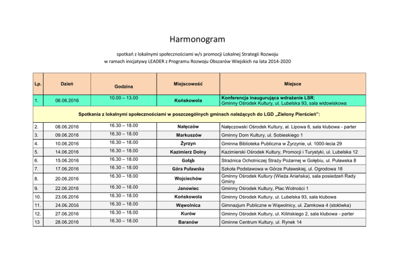 Harmonogram spotkań z lokalnymi społecznościami w/s promocji Lokalnej Strategii Rozwoju w ramach inicjatywy LEADER z Programu Rozwoju Obszarów Wiejskich na lata 2014-2020 Lp. 1. Dzień Godzina 06.06.2016 10.00 – 13.00 Miejscowość Końskowola Miejsce Konferencja inaugurująca wdrażanie LSR; Gminny Ośrodek Kultury, ul. Lubelska 93, sala widowiskowa Spotkania z lokalnymi społecznościami w poszczególnych gminach należących do LGD „Zielony Pierścień”: 2. 08.06.2016 16.30 – 18.00 Nałęczów Nałęczowski Ośrodek Kultury, al. Lipowa 6, sala klubowa - parter 3. 09.06.2016 16.30 – 18.00 Markuszów Gminny Dom Kultury, ul. Sobieskiego 1 4. 10.06.2016 16.30 – 18.00 Żyrzyn 5. 14.06.2016 16.30 – 18.00 Kazimierz Dolny Kazimierski Ośrodek Kultury, Promocji i Turystyki, ul. Lubelska 12 6. 15.06.2016 16.30 – 18.00 Gołąb Strażnica Ochotniczej Straży Pożarnej w Gołębiu, ul. Puławska 8 7. 17.06.2016 16.30 – 18.00 Góra Puławska 16.30 – 18.00 Wojciechów 8. 20.06.2016 9. 22.06.2016 16.30 – 18.00 Janowiec 10. 23.06.2016 16.30 – 18.00 Końskowola 11. 24.06.2016 16.30 – 18.00 Wąwolnica 12. 27.06.2016 16.30 – 18.00 Kurów 13 28.06.2016 16.30 – 18.00 Baranów Gminna Biblioteka Publiczna w Żyrzynie, ul. 1000-lecia 29 Szkoła Podstawowa w Górze Puławskiej, ul. Ogrodowa 18 Gminny Ośrodek Kultury (Wieża Ariańska), sala posiedzeń Rady Gminy Gminny Ośrodek Kultury, Plac Wolności 1 Gminny Ośrodek Kultury, ul. Lubelska 93, sala klubowa Gimnazjum Publiczne w Wąwolnicy, ul. Zamkowa 4 (stołówka) Gminny Ośrodek Kultury, ul. Kilińskiego 2, sala klubowa - parter Gminne Centrum Kultury, ul. Rynek 14