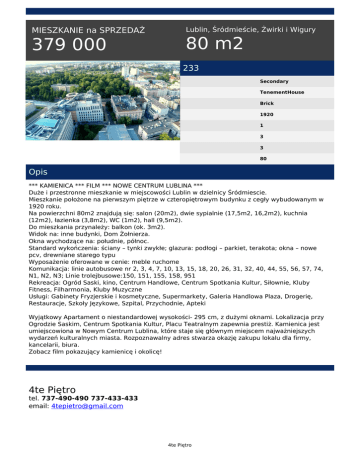 MIESZKANIE na SPRZEDAŻ 379 000 Lublin, Śródmieście, Żwirki i Wigury 80 m2 233 Secondary TenementHouse Brick 1920 1 3 3 80 Opis *** KAMIENICA *** FILM *** NOWE CENTRUM LUBLINA *** Duże i przestronne mieszkanie w miejscowości Lublin w dzielnicy Śródmiescie. Mieszkanie położone na pierwszym piętrze w czteropiętrowym budynku z cegły wybudowanym w 1920 roku. Na powierzchni 80m2 znajdują się: salon (20m2), dwie sypialnie (17,5m2, 16,2m2), kuchnia (12m2), łazienka (3,8m2), WC (1m2), hall (9,5m2). Do mieszkania przynależy: balkon (ok. 3m2). Widok na: inne budynki, Dom Żołnierza. Okna wychodzące na: południe, północ. Standard wykończenia: ściany – tynki zwykłe; glazura: podłogi – parkiet, terakota; okna – nowe pcv, drewniane starego typu Wyposażenie oferowane w cenie: meble ruchome Komunikacja: linie autobusowe nr 2, 3, 4, 7, 10, 13, 15, 18, 20, 26, 31, 32, 40, 44, 55, 56, 57, 74, N1, N2, N3; Linie trolejbusowe:150, 151, 155, 158, 951 Rekreacja: Ogród Saski, kino, Centrum Handlowe, Centrum Spotkania Kultur, Siłownie, Kluby Fitness, Filharmonia, Kluby Muzyczne Usługi: Gabinety Fryzjerskie i kosmetyczne, Supermarkety, Galeria Handlowa Plaza, Drogerię, Restauracje, Szkoły Językowe, Szpital, Przychodnie, Apteki Wyjątkowy Apartament o niestandardowej wysokości- 295 cm, z dużymi oknami. Lokalizacja przy Ogrodzie Saskim, Centrum Spotkania Kultur, Placu Teatralnym zapewnia prestiż. Kamienica jest umiejscowiona w Nowym Centrum Lublina, które staje się głównym miejscem najważniejszych wydarzeń kulturalnych miasta. Rozpoznawalny adres stwarza okazję zakupu lokalu dla firmy, kancelarii, biura. Zobacz film pokazujący kamienicę i okolicę! 4te Piętro tel. 737-490-490 737-433-433 email: [email protected] 4te Piętro Powered by TCPDF (www.tcpdf.org)