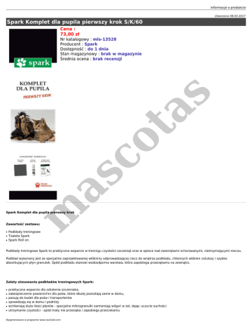Informacje o produkcie Utworzono 08-03-2017 Spark Komplet dla pupila pierwszy krok S/K/60 Cena : 73,00 zł m as co ta s Nr katalogowy : mls-13528 Producent : Spark Dostępność : do 1 dnia Stan magazynowy : brak w magazynie Średnia ocena : brak recenzji Spark Komplet dla pupila pierwszy krok Zawartość zestawu: ● ● ● Podkłady treningowe Toaleta Spark Spark Roll on Podkłady treningowe Spark to praktyczne wsparcie w treningu czystości szczeniąt oraz w opiece nad zwierzętami schorowanymi, nietrzymającymi moczu. Podkład wykonany jest ze specjalnie zaprojektowanej włókniny odprowadzającej ciecz do wnętrza podkładu, chłonnych włókien celulozy i szybko absorbujących płyn granulek. Spód podkładu stanowi wodoodporna warstwa, która zapobiega przesiąkaniu na zewnątrz. Zalety stosowania podkładów treningowych Spark: ● ● ● ● ● ● praktyczne wsparcie dla szkolenia szczeniaka, zabezpieczenie powierzchni dla psów, które dłużej pozostają same w domu, pasują do toalet dla psów i transporterów sprawdzają się w domu i podróży wchłaniają duże ilości płynów - specjalne mikrogranulki zamieniają wilgoć w żel, dając uczucie suchości utrzymanie czystości - spód maty nie przesiąka i zapobiega przeciekaniu Wygenerowano w programie www.oscGold.com ● ● system Odour Control eliminuje nieprzyjemny zapach pielęgnacja schorowanych zwierząt Toaleta Spark Toaleta dla zwierząt SPARK to unikalne na rynku rozwiązanie przy pielęgnacji małych zwierząt (psów, kotów, świnek morskich, królików itp.). Wykonana jest ze specjalnego materiału, który pozwala na zwinięcie jej w rulon, co jest bardzo pomocne w podróży. Toaleta nie odkształca się i po rozłożeniu wraca do pierwotnej formy. Inne zalety Toalety dla zwierząt SPARK: ● ● ● ● unikalny system mocowania podkładu łatwość czyszczenia nie przecieka (brak łączeń, wykonana z jednego kawałka materiału) bezzapachowa antypoślizgowa Spark Roll On co ta Olejek SPARK ROLL ON ułatwia naukę czystości u zwierząt. s ● Jego zapach zachęca szczenięta i kocięta do załatwiania się w odpowiednim miejscu. Skoncentrowana formuła olejku sprawia, że niewielka ilość wystarczy, aby osiągnąć efekt. Idealny do stosowania w domu na Podkładzie Treningowym Spark oraz Toalecie Spark. Sposób użycia: ● ● ● Zakreślić linię o długości min. 10 cm na podkładzie SPARK. Czynność powtarzać kilka razy dziennie, aż do czasu wyrobienia nawyku u pupila. W razie konieczności należy zasięgnąć porady lekarza. Produkt przeznaczony tylko dla zwierząt. Chroń przed dziećmi. m as ●