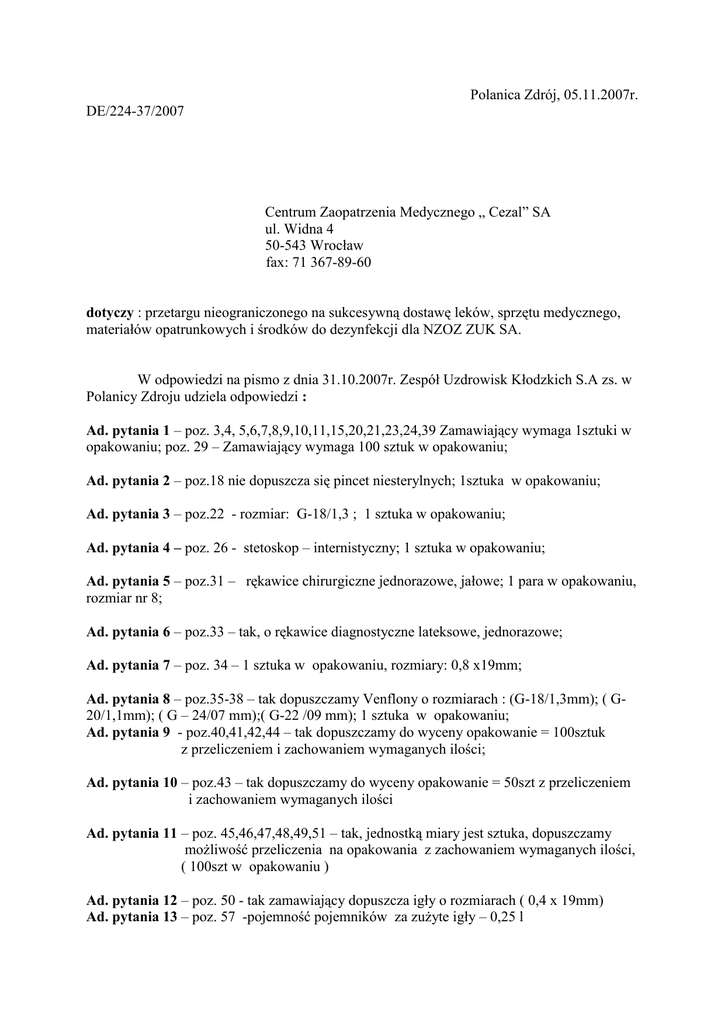 Polanica Zdrój, 05.11.2007r. DE/224-37/2007 Centrum Zaopatrzenia Medycznego „ Cezal” SA ul. Widna 4 50-543 Wrocław fax: 71 367-89-60 dotyczy : przetargu nieograniczonego na sukcesywną dostawę leków, sprzętu medycznego, materiałów opatrunkowych i środków do dezynfekcji dla NZOZ ZUK SA. W odpowiedzi na pismo z dnia 31.10.2007r. Zespół Uzdrowisk Kłodzkich S.A zs. w Polanicy Zdroju udziela odpowiedzi : Ad. pytania 1 – poz. 3,4, 5,6,7,8,9,10,11,15,20,21,23,24,39 Zamawiający wymaga 1sztuki w opakowaniu; poz. 29 – Zamawiający wymaga 100 sztuk w opakowaniu; Ad. pytania 2 – poz.18 nie dopuszcza się pincet niesterylnych; 1sztuka w opakowaniu; Ad. pytania 3 – poz.22 - rozmiar: G-18/1,3 ; 1 sztuka w opakowaniu; Ad. pytania 4 – poz. 26 - stetoskop – internistyczny; 1 sztuka w opakowaniu; Ad. pytania 5 – poz.31 – rękawice chirurgiczne jednorazowe, jałowe; 1 para w opakowaniu, rozmiar nr 8; Ad. pytania 6 – poz.33 – tak, o rękawice diagnostyczne lateksowe, jednorazowe; Ad. pytania 7 – poz. 34 – 1 sztuka w opakowaniu, rozmiary: 0,8 x19mm; Ad. pytania 8 – poz.35-38 – tak dopuszczamy Venflony o rozmiarach : (G-18/1,3mm); ( G20/1,1mm); ( G – 24/07 mm);( G-22 /09 mm); 1 sztuka w opakowaniu; Ad. pytania 9 - poz.40,41,42,44 – tak dopuszczamy do wyceny opakowanie = 100sztuk z przeliczeniem i zachowaniem wymaganych ilości; Ad. pytania 10 – poz.43 – tak dopuszczamy do wyceny opakowanie = 50szt z przeliczeniem i zachowaniem wymaganych ilości Ad. pytania 11 – poz. 45,46,47,48,49,51 – tak, jednostką miary jest sztuka, dopuszczamy możliwość przeliczenia na opakowania z zachowaniem wymaganych ilości, ( 100szt w opakowaniu ) Ad. pytania 12 – poz. 50 - tak zamawiający dopuszcza igły o rozmiarach ( 0,4 x 19mm) Ad. pytania 13 – poz. 57 -pojemność pojemników za zużyte igły – 0,25 l