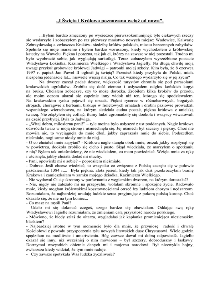 „I Święta i Królowa poznawana wciąż od nowa”. ...Byłem bardzo zmęczony po wycieczce pierwszokomunijnej: tyle ciekawych rzeczy się wydarzyło i zobaczyłem po raz pierwszy mnóstwo nowych miejsc: Wadowice, Kalwarię Zebrzydowską a zwłaszcza Kraków- siedzibę królów polskich, miasto bezcennych zabytków. Spełniło się moje marzenie i byłem bardzo wzruszony, kiedy wychodziłem z królewskiej katedry na Wawelu. Piękna i potężna, tak jak ci, którzy na zawsze w niej pozostali. Trudno mi było wyobrazić sobie, jak wyglądają sarkofagi. Teraz zobaczyłem wyrzeźbione postacie Władysława Łokietka, Kazimierza Wielkiego i Władysława Jagiełły. Na długą chwilę moją uwagę przykuł grobowiec królowej Jadwigi – patronki mojej szkoły. Kim była, że 8 czerwca 1997 r. papież Jan Paweł II ogłosił ją świętą? Przecież kiedy przybyła do Polski, miała niespełna jedenaście lat... niewiele więcej niż ja. Co tak ważnego wydarzyło się w jej życiu? Na dworze zaczął padać deszcz, większość turystów chroniła się pod parasolami krakowskich ogródków. Zrobiło się dość ciemno i usłyszałem odgłos końskich kopyt na bruku. Chciałem zobaczyć, czy to może dorożka. Zrobiłem kilka kroków do przodu, ale moim oczom ukazał się zupełnie inny widok niż ten, którego się spodziewałem. Na krakowskim rynku pojawił się orszak. Piękni rycerze w różnobarwnych, bogatych strojach, chorągwie z herbami, biskupi w fioletowych ornatach i drobni paziowie prowadzili wspaniałego wierzchowca, na którym siedziała cudna postać, piękna królowa z anielską twarzą. Nie zdążyłem się cofnąć, tłumy ludzi zgromadziły się dookoła i wszyscy wiwatowali na cześć przybyłej. Była to Jadwiga. - „Witaj dobra, miłosierna pani!” – tyle można było usłyszeć z ust poddanych. Nagle królowa odwróciła twarz w moją stronę i uśmiechnęła się. Jej uśmiech był szczery i piękny. Choć nie mówiła nic, to wyciągnęła do mnie dłoń, jakby zapraszała mnie do siebie. Podszedłem nieśmiało, nogi same niosły mnie do niej. - O co chciałeś mnie zapytać? - Królowa nagle stanęła obok mnie, orszak jakby rozpłynął się w powietrzu, dookoła zrobiło się cicho i pusto. Skąd wiedziała, że marzyłem o spotkaniu z nią? Byłem tak onieśmielony, że nie wiedziałem, co mam powiedzieć. Wzięła mnie za rękę i uścisnęła, jakby chciała dodać mi otuchy. - Pani, opowiedz mi o sobie? – poprosiłem nieśmiało. - Dobrze. Jeśli chcesz wiedzieć, to wszystko co związane z Polską zaczęło się w połowie października 1384 r.... Była piękna, złota jesień, kiedy tak jak dziś przekroczyłam bramę Krakowa i zamieszkałam w zamku mojego dziadka, Kazimierza Wielkiego. - Nie wydawał Ci się skromny w porównaniu z węgierskim dworem, na którym dorastałaś? - Nie, nigdy nie zależało mi na przepychu, wolałam skromne i spokojne życie. Radowało mnie, kiedy mogłam królewskimi kosztownościami otrzeć łzy ludziom chorym i nędzarzom. Rozumiałam, że najbardziej uraduję ludzkie serca przyjmując z pokorą polską koronę. Choć okazało się, że nie na tym koniec... - Co masz na myśli Pani? - Udało mi się dokonać czegoś, czego bardzo się obawiałam. Oddając swą rękę Władysławowi Jagielle rozumiałam, że zmieniam całą przyszłość narodu polskiego. - Mówiono, że kiedy szłaś do ołtarza, wyglądałaś jak kapłanka promieniejąca nieziemskim blaskiem? - Najbardziej istotne w tym momencie było dla mnie, że przyniosę radość i chwałę Kościołowi z powodu przysporzenia tylu nowych litewskich dusz Chrystusowi. Wiele godzin spędziłam na modlitwie i umartwieniu. Bóg zawsze dawał mi dobrą odpowiedź. Jagiełło okazał się inny, niż wcześniej o nim mówiono – był szczery, dobroduszny i łaskawy. Dotrzymał wszystkich obietnic danych mi i mojemu narodowi. Był niezwykle hojny, zwłaszcza kiedy widział, że tym mnie raduje. - Czy zawsze spotykała Was ludzka życzliwość? - Pamiętam naszą podróż do Wielkopolski...W Gnieźnie odmówiono nam wszelkich zapasów żywności. Mój mąż był niezwykle rozgniewany i kazał siłą odebrać ludziom wszystko dla królewskiego dworu. Czułam wielki ból w sercu, widząc ludzką krzywdę. Król zrozumiał swój błąd – kazał oddać wszystko i straty wszelkie wynagrodzić. Ale jak ciężko mu było zrozumieć moją gorycz i słowa, że powrócono im dobytek, ale któż im ich łzy powróci. Zaczynałem rozumieć, dlaczego prosty lud w każdym zakątku błogosławił swoją panią. - Poczułam wielką ulgę, gdy na Litwie runął posąg Perkuna – pogańskiego bożka. Modliłam się za tych biedaków czczących dotąd martwe głazy, prosiłam Boga, aby się nad nimi ulitował. Z tych samych głazów i kamieni powstała wspaniała świątynia, i z wielką radością ja i Władysław ustawiliśmy w niej krzyż Chrystusowy. Twarz Jadwigi znów zmieniła się nie do poznania, łza potoczyła się po jej policzku. - Chciałam dobrą wieścią podzielić się z moją matką, ale stało się inaczej...odeszła, nie z własnej woli, ta, którą najbardziej kochałam. Pogrążyła mnie na długo w ciężkiej żałobie, smutku i rozpaczy. - To bardzo smutne. Opowiedz mi Pani jak udało Ci się odzyskać Ruś Czerwoną? - Kiedy wraz z hufcami przekroczyłam San, wydałam przywilej w Jarosławiu, który potwierdził i pomnażał swobody ziemi przemyskiej. W następstwie tego aktu łaski królewskiej przybyło do mnie ruskie poselstwo, z prośbą o przyłączenie do Rusi Polski. Zgotowano mi wspaniałe przyjęcie, dlatego powróciłam mieszkańcom Lwowa dawne swobody i przywileje nadane im przez mego dziada, wszystkie zaś cła i podatki uchyliłam. Tak więc bez żadnego gwałtu, spokojnie i zgodnie odbyło się włączenie Rusi Czerwonej do Polski. - Kochali Cię wszyscy, zwłaszcza ludzie biedni? - Nie mogłam pozostać obojętna na głód i nędzę, kiedy wid