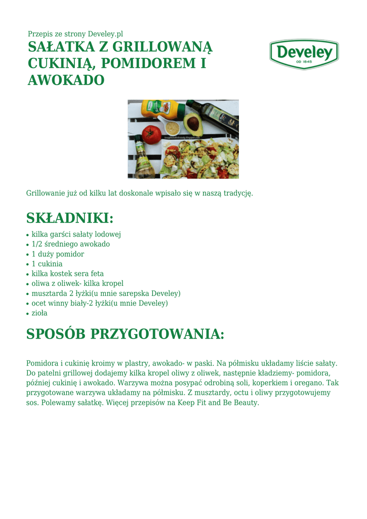 Przepis ze strony Develey.pl SAŁATKA Z GRILLOWANĄ CUKINIĄ, POMIDOREM I AWOKADO Grillowanie już od kilku lat doskonale wpisało się w naszą tradycję. SKŁADNIKI: ● ● ● ● ● ● ● ● ● kilka garści sałaty lodowej 1/2 średniego awokado 1 duży pomidor 1 cukinia kilka kostek sera feta oliwa z oliwek- kilka kropel musztarda 2 łyżki(u mnie sarepska Develey) ocet winny biały-2 łyżki(u mnie Develey) zioła SPOSÓB PRZYGOTOWANIA: Pomidora i cukinię kroimy w plastry, awokado- w paski. Na półmisku układamy liście sałaty. Do patelni grillowej dodajemy kilka kropel oliwy z oliwek, następnie kładziemy- pomidora, później cukinię i awokado. Warzywa można posypać odrobiną soli, koperkiem i oregano. Tak przygotowane warzywa układamy na półmisku. Z musztardy, octu i oliwy przygotowujemy sos. Polewamy sałatkę. Więcej przepisów na Keep Fit and Be Beauty.