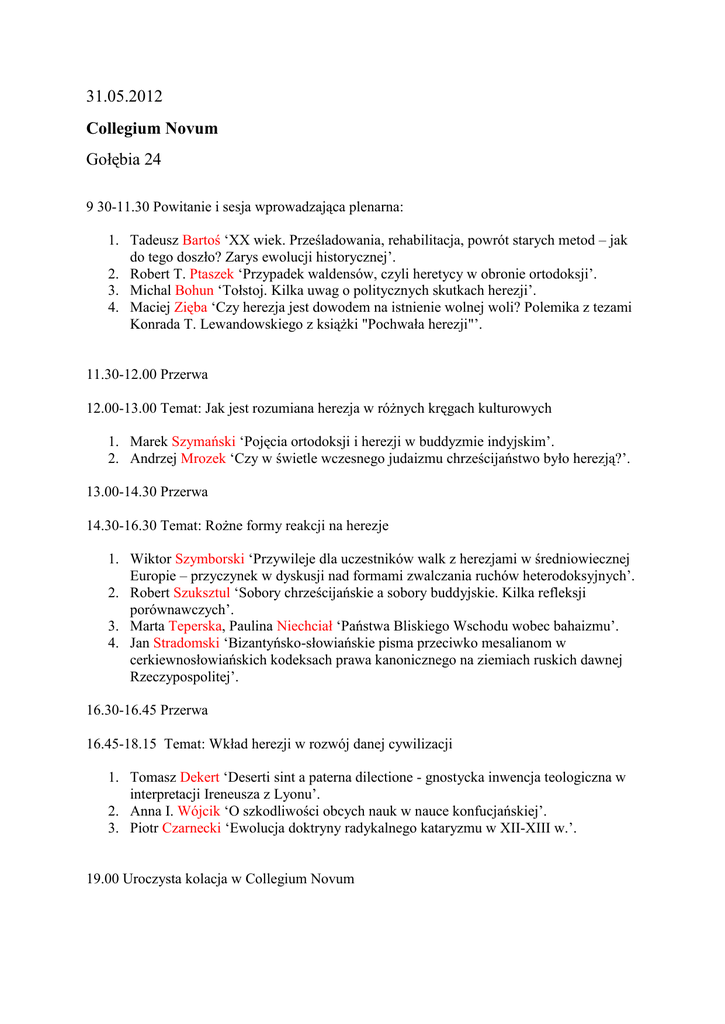 31.05.2012 Collegium Novum Gołębia 24 9 30-11.30 Powitanie i sesja wprowadzająca plenarna: 1. Tadeusz Bartoś ‘XX wiek. Prześladowania, rehabilitacja, powrót starych metod – jak do tego doszło? Zarys ewolucji historycznej’. 2. Robert T. Ptaszek ‘Przypadek waldensów, czyli heretycy w obronie ortodoksji’. 3. Michal Bohun ‘Tołstoj. Kilka uwag o politycznych skutkach herezji’. 4. Maciej Zięba ‘Czy herezja jest dowodem na istnienie wolnej woli? Polemika z tezami Konrada T. Lewandowskiego z książki "Pochwała herezji"’. 11.30-12.00 Przerwa 12.00-13.00 Temat: Jak jest rozumiana herezja w różnych kręgach kulturowych 1. Marek Szymański ‘Pojęcia ortodoksji i herezji w buddyzmie indyjskim’. 2. Andrzej Mrozek ‘Czy w świetle wczesnego judaizmu chrześcijaństwo było herezją?’. 13.00-14.30 Przerwa 14.30-16.30 Temat: Rożne formy reakcji na herezje 1. Wiktor Szymborski ‘Przywileje dla uczestników walk z herezjami w średniowiecznej Europie – przyczynek w dyskusji nad formami zwalczania ruchów heterodoksyjnych’. 2. Robert Szuksztul ‘Sobory chrześcijańskie a sobory buddyjskie. Kilka refleksji porównawczych’. 3. Marta Teperska, Paulina Niechciał ‘Państwa Bliskiego Wschodu wobec bahaizmu’. 4. Jan Stradomski ‘Bizantyńsko-słowiańskie pisma przeciwko mesalianom w cerkiewnosłowiańskich kodeksach prawa kanonicznego na ziemiach ruskich dawnej Rzeczypospolitej’. 16.30-16.45 Przerwa 16.45-18.15 Temat: Wkład herezji w rozwój danej cywilizacji 1. Tomasz Dekert ‘Deserti sint a paterna dilectione - gnostycka inwencja teologiczna w interpretacji Ireneusza z Lyonu’. 2. Anna I. Wójcik ‘O szkodliwości obcych nauk w nauce konfucjańskiej’. 3. Piotr Czarnecki ‘Ewolucja doktryny radykalnego kataryzmu w XII-XIII w.’. 19.00 Uroczysta kolacja w Collegium Novum 01.06.2012 KPSC Pałac Spiski, Rynek Główny 34, III piętro Godz.9-11 Sesje A1 4 ref Sesja B1 4 ref Sesja C1 4 ref judaizm/wczesne chrześcijaństwo1 filozofia1 literatura/inne Sala 32 Sala 33 Sala 31 Godz. 11.30-14.30 Sesja A2 6 ref Sesja B2 6 ref Sesja C2 6 ref Sesja D2 chrześcijaństwo2 filozofia2 islam chrześcijaństwo3 Sala 32 Sala 33 Sala 31 Schemat sesji: Wprowadz 5 min 1 Ref 20 min 2. ref 20 min 3. ref 20 min 4 ref 20 min Dyskusja 20 minut Godz. 9.oo – 11.oo Sesja A1 Judaizm/wczesne chrześcijaństwo 1. Wojciech Kosior ‘ Herezja w judaizmie. Elisza ben Abuja, heretyk czy zacny rabin?’ 2. Grzegorz M. Baran ‘Herezje małoazjatyckie (I - II w. po Chr.) oraz ich wpływ na powstanie Drugiego Listu św. Piotra’. 3. Kamil Mańka ‘Wczesnochrześcijańska herezja jako twórczy światopogląd konkurencyjny względem ortodoksji’. 4. Bogna Kosmulska ‘Nowatorstwo czy nowinkarstwo – zagadnienie twórczości w tradycji wczesnochrześcijańskiej i bizantyjskiej’. Sesja B1 Filozofia 1. Tomasz Stępień ‘Filozofia kultury wobec sporu wokół Spenglerowskiej koncepcji kosmos atheos’. 2. Paweł Perka ‘Rola herezji jako mechanizmu adaptacyjnego w ujęciu systemowym ‘. 3. Adam Kubiak ‘Trzy próby spojrzenia: powrót do ortodoksji, konserwatywna rewolucja, widmowa ortodoksja’. 4. Maria Jarmuszczak ‘Heretyk Jan Patočka: Jak filozof rozumie herezję? Czy jest to rozumienie europocentryczne?’. Sesja C1 Literatura + inne 1. Magdalena Piotrowska-Grot ‘Poetyckie odnowienie wszechrzeczy. Wpływ apokatastazy na polską poezję współczesną’. 2. Małgorzata Kostuchowska ‘Kulturotwórcza rola herezji. Wspólnota myśli wyklętego teologa i wybitnego poety romantycznego’. 3. Anna Grochowska ‘Herezje świętego Wawelu w wieku XIX ‘. 4. Piotr Kalicki ‘Środkowy Horyzont w Andach- świadectwo herezji czy pluralizmu wierzeń?’. 5. Adam Anczyk ‘Heretycy wśród heretyków. Rozumienie pojęcia ortodoksji we współczesnym neopoganizmie’. Godz. 11.30-14.30 A2. Gnoza/wczesne chrześcijaństwo: 1. Dorota Jedlikowska ‘Koncepcje ciała w świetle wybranych herezji – próba charakterystyki z perspektywy tożsamości zsomatyzowanej’. 2. Jadwiga Skrzypek-Faluszczak ‘Gnostyckie związki z herezjami we wczesnym chrześcijaństwie’. 3. Karolina Kochańczyk-Bonińska ‘Monofizytyzm i monoteletyzm a antropologia Ojców Kościoła na przykładzie Maksyma Wyznawcy’. 4. Witali Michalczuk ‘Kryterium herezji w sporze eunomiańskim drugiej połowy IV w.’. 5. Tomasz Niezgoda ‘Polityczny wymiar gnozy’. Sesja B2 Filozofia 1. Dawid Nowakowski ‘Herezja i granice tolerancji w myśl poglądów Erazma z Rotterdamu’. 2. Anna Kołos ‘Fides quaerens intellectum? Herezje rozumu w XVI i XVII wieku’. 3. Maciej Banasik ‘Filozofia Schopenhauera jako herezja - próba interpretacji’. 4. Maciej Kostyra ‘Heretycki wymiar samokształcenia (Bildung)’. 5. Elżbieta Olzacka ‘Antysystemowy potencjał rosyjskich herezji’. Sesja C2 Islam 1. Tomasz Wiśniewski ‘Herezja w herezji. O przemianach wizerunku ruchu ismailickiego’. 2. Monika Matysek ‘Bid’ah – herezja czy reforma? Na pograniczu teologii i polityki islamu’. 3. Łukasz Piątak ‘Kufr i bid'a jako muzułmańskie ekwiwalenty pojęcia herezja. Jak kreślono kryteria ortodoksyjności w islamie?’. 4. Kamil Pawluk ‘Nowoczesność jako współczesna herezja w islamie na przykładzie fundamentalizmu islamskiego w Algierii’. 5. Małgorzata Kniaź ‘Czy język może być herezją? O "dialektalnej propagandzie" w Egipcie wobec językowej ortodoksji’. Sesja D2 Chrześcijaństwo3: 1. Bożena Gierek ‘„Celtycka duchowość” a „panteistyczna” koncepcja Jana Szkota Eriugeny’. 2. Marcin Trepczyński ‘Herezje w średniowiecznej Europie Zachodniej - tragiczna gra, w której każdy coś ugrał’. 3. Łukasz Rządzik ‘Mariawityzm jako alternatywa dla Kościoła Katolickiego’. 4. Anna Maliszewska ‘W poszukiwaniu współczesnego heretyka. Przypadek Elizabeth A. Johnson’. 5. Maria Nejman ‘Modernizacja w Kościele – dobrodziejstwo czy herezja? Analiza zmian w Kościele Katolicki