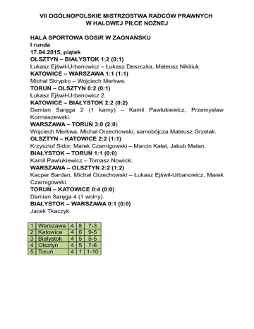 VII OGÓLNOPOLSKIE MISTRZOSTWA RADCÓW PRAWNYCH W HALOWEJ PIŁCE NOŻNEJ HALA SPORTOWA GOSiR W ZAGNAŃSKU I runda 17.04.2015, piątek OLSZTYN – BIAŁYSTOK 1:2 (0:1) Łukasz Ejświł-Urbanowicz – Łukasz Deszczka, Mateusz Nikitiuk. KATOWICE – WARSZAWA 1:1 (1:1) Michał Skrypko – Wojciech Merkwa. TORUŃ – OLSZTYN 0:2 (0:1) Łukasz Ejświł-Urbanowicz 2. KATOWICE – BIAŁYSTOK 2:2 (0:2) Damian Saręga 2 (1 karny) – Kamil Pawlukiewicz, Przemysław Kormaszewski. WARSZAWA – TORUŃ 3:0 (2:0) Wojciech Merkwa, Michał Orzechowski, samobójcza Mateusz Grzelak. OLSZTYN – KATOWICE 2:2 (1:1) Krzysztof Sidor, Marek Czarnigowski – Marcin Kałat, Jakub Matan. BIAŁYSTOK – TORUŃ 1:1 (0:0) Kamil Pawlukiewicz – Tomasz Nowicki. WARSZAWA – OLSZTYN 2:2 (1:2) Kacper Bardan, Michał Orzechowski – Łukasz Ejświł-Urbanowicz, Marek Czarnigowski. TORUŃ – KATOWICE 0:4 (0:0) Damian Saręga 4 (1 wolny). BIAŁYSTOK – WARSZAWA 0:1 (0:0) Jacek Tkaczyk. 1 2 3 4 5 Warszawa Katowice Białystok Olsztyn Toruń 4 4 4 4 4 8 7-3 6 9-5 5 5-5 5 7-6 1 1-10 Grupa B BYDGOSZCZ – SZCZECIN 1:0 (0:0) Leszek Główczewski. KRAKÓW – GDAŃSK 0:1 (0:0) Krzysztof Romczykowski. BYDGOSZCZ – KRAKÓW 4:0 (3:0) Aleksander Skorecki 2, Jan Burker, Jan Poczwardowski. SZCZECIN – GDAŃSK 1:2 (0:1) Łukasz Soswa - Sławomir Hajduczenia wolny, Krzysztof Ramczykowski. GDAŃSK – BYDGOSZCZ 1:3 (0:0) Sebastian Fischer – Sławomir Rutka, Bartosz Sołtysiuk, Aleksander Skorecki. KRAKÓW – SZCZECIN 3:2 (3:1) Kamil Kosior, Marek Wszołek, samobójcza Radosław Jagodziński – Krystian Makowski, Bartosz Jakóbczyk. 1 Bydgoszc z 2 Gdańsk 3 Kraków 4 Szczecin 3 9 8-1 3 6 4-4 3 3 3-7 3 0 3-6 Grupa C KIELCE – ŁÓDŹ 0:1 (0:0) Paweł Nowacki. RZESZÓW – LUBLIN 0:0 WROCŁAW – KIELCE 2:2 (2:0) Tomasz Markowski, Andrzej Jaskowski – Arkadiusz Zawada, Bartłomiej Czyż. RZESZÓW – ŁÓDŹ 1:1 (1:1) Marcin Zabłocki – Wojciech Płóciennik. LUBLIN – WROCŁAW 2:0 (0:0) Miłosz Borowiecki, Łukasz Bańkowski. KIELCE – RZESZÓW 1:0 (1:0) Bartłomiej Czyż wolny. ŁÓDŹ – WROCŁAW 1:2 (1:0) Jakub Gajownik – Tomasz Markowski 2. LUBLIN – KIELCE 1:0 (0:0) Miłosz Borowiecki. WROCŁAW – RZESZÓW 2:0 (1:0) Tomasz Markowski, Andrzej Jaskowski wolny. ŁÓDŹ – LUBLIN 0:0 1 2 3 4 5 Lublin Wrocław Łódź Kielce Rzeszów 4 4 4 4 4 8 7 5 4 2 3-0 6-5 3-3 3-4 1-4 TABELA POMOCNICZA DRUŻYN, KTÓRE ZAJĘŁY 2 MIEJSCA W I RUNDZIE (do wyłonienia jednej drużyny rozstawionej z pierwszego koszyka w ćwierćfinałach ) 1. Wrocław 3 2-3 – drużyna wyłoniona do rozstawienia poprzez losowanie – taki sam bilans punktowy i bramkowy, jak drużyna z Gdańska) 2. Gdańsk 3 2-3 3. Katowice 2 3-3 TABELA POMOCNICZA DRUŻYN, KTÓRE ZAJĘŁY 3 MIEJSCA W I RUNDZIE ( do wyłonienia jednej drużyny, która uzyska bezpośredni awans do ćwierćfinału rozgrywek ) 1. Białystok 1 2-3 2. Łódź 1 1-2 3. Kraków 0 0-5 18.04.2015, sobota Mecze o miejsca 12-14 TORUŃ – SZCZECIN 4:0 (1:0) Mateusz Grzelak 3, Sławomir Drapała. SZCZECIN – RZESZÓW 2:1 (1:1) Rafał Janicki, Bartłomiej Jakóbczyk – Adrian Pieróg. RZESZÓW – TORUŃ 3:1 (2:1) Marek Cyrek, Witold Ochenduszkiewicz, Marcin Zabłocki – Tomasz Nowicki. 1 2 1 3 1 4 Toruń 2 3 5-3 Rzeszów 2 3 4-3 Szczecin 2 3 2-5 Repasaże (celem wyłonienia jednej drużyny, która zagra w ćwierćfinale rozgrywek) KIELCE – KRAKÓW 1:1 (1:0), karne 5:4 Adam Rybka – Wojciech Stachowicz-Szczepanik. Karne: Rokicki 1:0, Wszołek 1:1, Domagała obrona bramkarza, Wiewiórski 1:2, Kozioł 2:2, Kiełbowicz nie trafił w bramkę, Zawada 3:2, Bałaziński 3:3, Czyż 4:3, Sacha 4:4, Czerwiak 5:4, Wąsik obrona bramkarza. ŁÓDŹ – OLSZTYN 1:1 (0:0), karne 3:2 Wojciech Płóciennik – Łukasz Ejświł-Urbanowicz. Karne: Czarnigowski obrona bramkarza, Zawalski 1:0, Szymonajcz nie trafił w bramkę, Kos 2:0, Sidor 2:1, Nowacki obrona bramkarza, Mackiewicz 2:2, Gałwiaczek 3:2, Ejświł-Urbanowicz poprzeczka. KIELCE – ŁÓDŹ 0:1 (0:0) Paweł Nowacki. KRAKÓW – OLSZTYN 2:1 (0:1) Maciej Bałaziński, Kamil Kosior – Łukasz Ejświł-Urbanowicz. Ćwierćfinały WROCŁAW – GDAŃSK 3:0 (0:0) Paweł Art, Wojciech Basiewicz, Tomasz Markowski. WARSZAWA – ŁÓDŹ 1:1 (1:0), karne 4:5 Robert Bartosiak – Paweł Nowacki. Karne: Bartosiak 1:0, Zawalski 1:1, Merkwa 2:1, Kos 2:2, Tkaczyk 3:2, Nowacki 3:3 Orzechowski 4:3, Gałwiaczek 4:4, Rasała obrona bramkarza, Płóciennik 4:5. BYDGOSZCZ – KATOWICE 0:3 (0:1) Michał Skrypko, Damian Saręga, samobójcza Wojciech Jaszczyczyn. LUBLIN – BIAŁYSTOK 3:0 (2:0) Sławomir Bereza (wolny), Miłosz Borowiecki, Konrad Sokół. Półfinały WROCŁAW – ŁÓDŹ 1:1 (1:0), karne 2:4 Tomasz Markowski – Paweł Nowacki. KATOWICE – LUBLIN 3:0 (2:0) Damian Saręga 2 (1 karny), Mariusz Nawrot. Mecz o 3 miejsce LUBLIN – WROCŁAW 4:0 (1:0) Miłosz Borowiecki 2, Patryk Łysakowski, Łukasz Bańkowski. Finał KATOWICE – ŁÓDŹ 1:0 (1:0) Marcin Kałat.