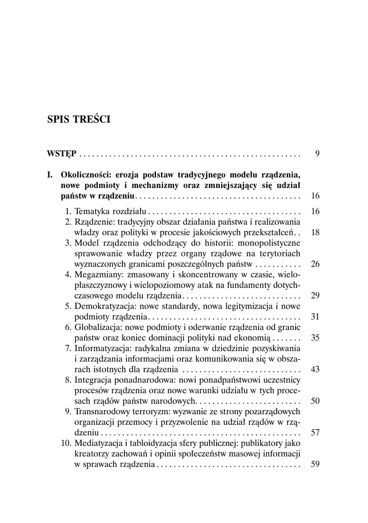 SPIS TREŚCI WSTĘP . . . . . . . . . . . . . . . . . . . . . . . . . . . . . . . . . . . . . . . . . . . . . . . . . . . . 9 I.Okoliczności: erozja podstaw tradycyjnego modelu rządzenia, nowe podmioty i mechanizmy oraz zmniejszający się udział państw w rządzeniu . . . . . . . . . . . . . . . . . . . . . . . . . . . . . . . . . . . . . . 16 1.Tematyka rozdziału . . . . . . . . . . . . . . . . . . . . . . . . . . . . . . . . . . . 2.Rządzenie: tradycyjny obszar działania państwa i realizowania władzy oraz polityki w procesie jakościowych przekształceń . 3.Model rządzenia odchodzący do historii: monopolistyczne sprawowanie władzy przez organy rządowe na terytoriach wyznaczonych granicami poszczególnych państw . . . . . . . . . . . 4.Megazmiany: zmasowany i skoncentrowany w czasie, wielopłaszczyznowy i wielopoziomowy atak na fundamenty dotychczasowego modelu rządzenia . . . . . . . . . . . . . . . . . . . . . . . . . . . 5.Demokratyzacja: nowe standardy, nowa legitymizacja i nowe podmioty rządzenia . . . . . . . . . . . . . . . . . . . . . . . . . . . . . . . . . . . 6.Globalizacja: nowe podmioty i oderwanie rządzenia od granic państw oraz koniec dominacji polityki nad ekonomią . . . . . . 7.Informatyzacja: radykalna zmiana w dziedzinie pozyskiwania i zarządzania informacjami oraz komunikowania się w obszarach istotnych dla rządzenia . . . . . . . . . . . . . . . . . . . . . . . . . . . . 8.Integracja ponadnarodowa: nowi ponadpaństwowi uczestnicy procesów rządzenia oraz nowe warunki udziału w tych procesach rządów państw narodowych . . . . . . . . . . . . . . . . . . . . . . . . 9.Transnarodowy terroryzm: wyzwanie ze strony pozarządowych organizacji przemocy i przyzwolenie na udział rządów w rządzeniu . . . . . . . . . . . . . . . . . . . . . . . . . . . . . . . . . . . . . . . . . . . . . . 10.Mediatyzacja i tabloidyzacja sfery publicznej: publikatory jako kreatorzy zachowań i opinii społeczeństw masowej informacji w sprawach rządzenia . . . . . . . . . . . . . . . . . . . . . . . . . . . . . . . . . 16 18 26 29 31 35 43 50 57 59 Rządzenie w świecie megazmian 11.Generalna przesłanka zmian w rządzeniu: otwarty charakter procesu rządzenia oraz jego silne korelacje ze zmianami w środowisku społecznym . . . . . . . . . . . . . . . . . . . . . . . . . . . . . . 61 12.Zarys kształtującego się nowego wzorca rządzenia: wielopoziomowość, wielopodmiotowość i wielopłaszczyznowość rządzenia . . . . . . . . . . . . . . . . . . . . . . . . . . . . . . . . . . . . . . . . . . . . . . . 63 13.Konkluzje . . . . . . . . . . . . . . . . . . . . . . . . . . . . . . . . . . . . . . . . . . . 66 II.Charakter zmian w rządzeniu: między rewolucją i ewolucją, nasycenie zmianami jakościowymi oraz zjawiskami i sytuacjami niemającymi swoich odpowiedników w historii . . . . . . . . . . . . . . . . . . 69 1. Tematyka rozdziału . . . . . . . . . . . . . . . . . . . . . . . . . . . . . . . . . . . 2. Kontekst aksjologiczny rządzenia: wielowartościowość, gwał towne zderzenie systemów wartości wyrosłych w różnych warunkach i odzwierciedlających różne poziomy rozwoju . . . 3. Kontekst społeczny rządzenia: konflikt perspektywy lokalnej i globalnej oraz stosowanie obcych miar do własnych postulatów i oczekiwań dotyczących rządzenia . . . . . . . . . . . . . . . . . . . 4. Kontekst polityczny rządzenia: wzrost dysproporcji w zakresie kontroli politycznej i społecznej w wypadku różnych podmiotów uczestniczących w rządzeniu oraz nowa architektura zaplecza politycznego rządzenia . . . . . . . . . . . . . . . . . . . . . . . . . 5. Kontekst ustrojowo-prawny rządzenia: wzmocnienie pozycji władz wykonawczych w systemie państwowych organów publicznych oraz zróżnicowanie skali rygoryzmu normatywnego w stosunku do poszczególnych podmiotów aktywnych w systemie rządzenia . . . . . . . . . . . . . . . . . . . . . . . . . . . . . . . . . . . . . . . . 6. Kontekst ekonomiczny rządzenia: postępująca deregulacja i autonomizacja sfery ekonomicznej wymuszająca zmiany dostosowawcze w dziedzinie rządzenia . . . . . . . . . . . . . . . . . . . 7. Kontekst prakseologiczny rządzenia: zmiany w kierunku wielokryterialności ocen rządzenia połączonej ze wzrostem znaczenia kryteriów pragmatycznych kosztem kryteriów ideologicznych . . . . . . . . . . . . . . . . . . . . . . . . . . . . . . . . . . . . . . . . . . . . . 8.Zmiany w dziedzinie rządzenia w ujęciu modelowym: transformacyjne zaburzenie mechanizmów wewnętrznych w warunkach naruszonej równowagi otoczenia . . . . . . . . . . . . . . . . . . . 9.Mechanizm zmian w dziedzinie rządzenia: od zasadniczych napięć między elementami politycznymi, ekonomicznymi, 69 71 74 78 83 87 90 93 Spis treści integracyjnymi i stabilizacyjnymi układu rządzenia do przewartościowań o charakterze jakościowym . . . . . . . . . . . . . . . . . 10.Przesłanki różnicowania i unifikacji zmian w rządzeniu w poszczególnych państwach: zderzenie uwarunkowań tożsamościowych o charakterze historycznym, społecznym, geograficznym i terytorialnym z czynnikami wymuszającymi konwergencję w zakresie systemów rządzenia . . . . . . . . . . . . . . . . . . . . . . . . . 11.Dynamika w dziedzinie rządzenia w różnych ujęciach metodologicznych: jakościowe zmiany rejestrowane bez względu na przyjęte założenia teoretyczne . . . . . . . . . . . . . . . . . . . . . . . . . . 12.Konkluzje . . . . . . . . . . . . . . . . . . . . . . . . . . . . . . . . . . . . . . . . . . . 97 102 105 112 III.Rządy i administracje rządowe państw członkowskich Unii Europejskiej w procesie zmian: przyjęcie perspektywy prakseologicznej oraz próby nadążania za pojawiającymi się wyzwaniami i wykorzystywania nowych możliwości wynikających z przekształceń zachodzących w otoczeniu . . . . . . . . . . . . . . . . . . . . . . . . . . . . . . . . . 115 1. Tematyka rozdziału . . . . . . . . . . . . . . . . . 