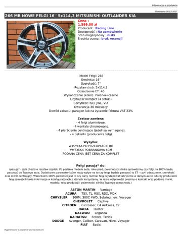 Informacje o produkcie Utworzono 08-03-2017 266 MB NOWE FELGI 16'' 5x114,3 MITSUBISHI OUTLANDER KIA Cena : 1.599,00 zł Producent : Racing Line Dostępność : Na zamówienie Stan magazynowy : niski Średnia ocena : brak recenzji Model Felgi: 266 Średnica: 16" Szerokość: 7" Rozstaw śrub: 5x114,3 Odsadzenie ET: 40 Wykończenie (kolor): Polerka+czarne Licytujesz komplet (4 sztuki) Certyfikat: ISO, JWL, VIA Gwarancja 36 miesięcy Dowód zakupu: paragon lub na życzenie faktura VAT 23% Zestaw zawiera: - 4 felgi aluminiowe, - 4 wentyle chromowane, - 4 pierścienie centrujące (jeżeli są wymagane), - 4 dekielki (producenta felg) Wysyłka: WYSYŁKA PO PRZEDPŁACIE 0zł WYSYŁKA POBRANIOWA 50zł PODANA CENA JEST CENĄ ZA KOMPLET Felgi pasują* do: (pasują* - jeśli chodzi o rozstaw szpilek. Po podaniu modelu auta, roku prod, pojemności silnika sprawdzimy czy felgi na 100% będą pasować do Twojego auta. Dodatkowe parametry które mają wpływ na to czy felga będzie pasować to ET - czyli odsadzenie, szerokość oraz otwór centrujący. Warunkiem 100% pewności jest to czy dany rozmiar felgi występował fabrycznie w danym aucie lub czy producenci felg zamieścili takie informacje w konfiguratorach z których korzystamy. W razie wątpliwości prosimy o kontakt oraz podanie marki, modelu, roku produkcji i pojemności silnika Twojego samochodu.) ASTON MARTIN Vantage ACURA TSX, TL, RSX, RDX, MDX CHRYSLER 300M, 300C 4WD, Sebring new, Voyager CHEVROLET Captiva CITROEN C-Crosser, C4 AirCross, C7 DACIA Duster DAEWOO Leganza DAIHATSU Feroza, Terios DODGE Avenger, Caliber, Caravan, Nitro, Voyager FIAT Sedici Wygenerowano w programie www.oscGold.com FORD Escape, Maverick, Probe HONDA Accord (>03), Accord Coupe (>98) + Type R, Civic, Civic Sport (>04) + TypeR, Civic Tourer (2014-), CR-V, CR-Z, HR-V, FR-V, Integra Type-R, NSX, S200, Odyssey, Prelude (4WS, BB6, BB8) (97-02), Shuttle, Stream HYUNDAI Coupe Tiburon (>02), Elantra, Genesis Coupe, Grandeur, I30, I30 Coupe, I40, IX20, IX35, IX35 Facelift, IX55, Santa Fe, Grand Santa Fe, Sonata new, Trajet, Tucson, XG25/XG30, Veloster INFINITI FX35, FX45, EX35, G35, G37, I30, M35, M45, Q45, Q50 JEEP Grand Cherokee (92-99), Patriot, Compass KIA Carnival, Carens, Ceed, Ceed SW, Magentis new, Opirus, Optima, Pro Ceed, Sedeona, Soul, Sorento II (09-), Sorento III, Sprotage II, Sportage III, Venga LANCIA Flavia LAND ROVER Freelander LEXUS GS 300/430 (>98), IS 200/300 (>98), IS250, IS220d, LS 400, LS 430, RX300, SC 430 MAZDA 3, 5, 6, CX5, CX7, CX9, 323 F (>00), 626 (97-03), MPV, MX-6, Premacy, RX8, Tribute, Xedos 6, Xedos 9 MITSUBISHI ASX, Eclipse (D20, D30), Grandis, Lancer neu, Outlander, Pajero Pinin, Sigma, Space Gear NISSAN 200SX (97-00), 350Z, Almera Tino, Altima, e-NV200, Juke, Maxima (95-00), Maxima QX (>00), Murano, Primera (02-), Qashqai, Primastar (15-), Pulsar, X-Trail, Opel Antara, Cascada, Sintra, Vivaro B PEUGEOT 4007, 4008, RENAULT Fluence, Koleos, Laguna III, Latitute, Megane III(cabrio), Scenic III, Grand Scenic III, Trafic III SUBARU Impreza STI, Tribeca SUZUKI Grand Vitara new, Kizashi, Swift Sport, SX 4 TOYOTA Auris, Auris Touring Sports, Avensis Verso, Camry (>96), Corolla Verso new, Hiace, Picnic (XM1), Previa, Prius+, RAV4, Supra, Verso Zgodnie z Kodeksem PWP art.156 ust 3, emblematy widoczne na felgach mają charakter wyłącznie informacyjny i nie należy się tym sugerować, że jest to produkt oryginalny danego producenta samochodu. Alufelgi dobieramy wg parametrów katalogowych producentów. W przypadku niektórych modeli aut lub felg zachodzi konieczność zastosowania dystansów, śrub/nakrętek ampułkowych. Ponieważ, zawsze może zajść taka sytuacja w której katalog/konfigurator wprowadzi w błąd sprzedawcę zaleca się przed montażem opon przyłożyć felgę na piastę i sprawdzić czy felga nigdzie nie będzie obcierać. Po założeniu opon zwrot felg będzie nie możliwy.