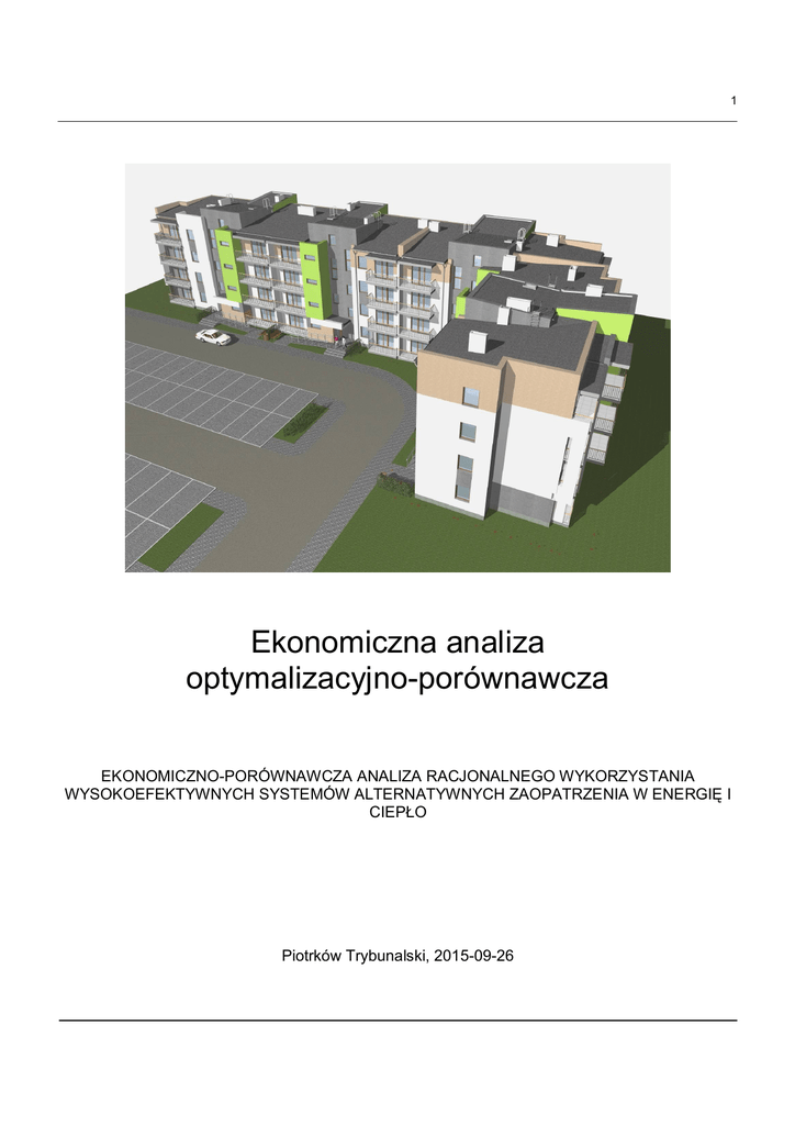 1 Ekonomiczna analiza optymalizacyjno-porównawcza EKONOMICZNO-PORÓWNAWCZA ANALIZA RACJONALNEGO WYKORZYSTANIA WYSOKOEFEKTYWNYCH SYSTEMÓW ALTERNATYWNYCH ZAOPATRZENIA W ENERGIĘ I CIEPŁO Piotrków Trybunalski, 2015-09-26 2 Spis treści: 1. Dane budynku 2. Zestawienie rocznego zapotrzebowania na energię użytkową 3. Zestawienie użytych cen jednostkowych na poszczególne paliwa 4. Opis systemów zapotrzebowania w energię do analizy porównawczej 5. Charakterystyka źródeł energii systemu ogrzewania i wentylacji 6. Charakterystyka źródeł energii systemu przygotowania ciepłej wody 7. Wykresy porównawcze zużycia nośników energii 3 1. Dane budynku 1.1. Dane adresowe: Nazwa budynku: BUDOWA BUDYNKU MIESZKALNEGO WIELORODZINNEGO "C" Adres budynku: Piotrków Trybunalski, ul. Broniewskiego nr ewid. działek: 123/9, 212/1, 124/7, 214/1, 125/7, 215/1, 126/7,216/1, 127/12, 218/1 - obręb 20; jednostka ewid. 106201_1. Nazwa inwestora: TOWARZYSTWO BUDOWNICTWA SPOŁECZNEGO Sp.z o.o. Adres inwestora: 97-300 Piotrków Trybunalski, AL. 3 MAJA 31 1.2. Dane geometryczne: Przeznaczenie budynku: Mieszkalny Strefa klimatyczna: III Stacja meteorologiczna: Sulejów Powierzchnia zabudowy Az=930,80 m 2 Powierzchnia o regulowanej temperaturze Af=2361,25 m 2 Powierzchnia netto A=3049,46 m 2 Kubatura po obrysie zewnętrznym Ve=12900 m 3 Liczba kondygnacji: 4 2. Zestawienie rocznego zapotrzebowania na energię użytkową 2.1. Zestawienie rocznego zapotrzebowania na energię użytkową dla systemu ogrzewania i wentylacji 2.1.1. System projektowany Lp. Rodzaj paliwa Udział % QH,nd [kWh/rok] 1 Ciepło z ciepłowni węglowej 100,0 115101,0 Zapotrzebowanie na energię elektryczną - produkcji mieszanej od urządzeń pomocniczych systemu ogrzewania i wentylacji: 1102,00 kWh/rok 2.1.2. System alternatywny Lp. Rodzaj paliwa Udział % QH,nd [kWh/rok] 1 Ciepło z kogeneracji - gaz ziemny 100,0 115101,0 Zapotrzebowanie na energię elektryczną - produkcji mieszanej od urządzeń pomocniczych systemu ogrzewania i wentylacji: 256,00 kWh/rok 4 2.2. Zestawienie rocznego zapotrzebowania na energię użytkową dla systemu przygotowania ciepłej wody 2.2.1. System projektowany Lp. Rodzaj paliwa Udział % QW,nd [kWh/rok] 1 Ciepło z ciepłowni węglowej 100,0 53680,2 Zapotrzebowanie na energię elektryczną - produkcji mieszanej od urządzeń pomocniczych systemu przygotowania ciepłej wody: 1580,00 kWh/rok 2.2.2. System alternatywny Lp. Rodzaj paliwa Udział % QW,nd [kWh/rok] 1 Ciepło z kogeneracji - gaz ziemny 100,0 53680,2 Zapotrzebowanie na energię elektryczną - produkcji mieszanej od urządzeń pomocniczych systemu przygotowania ciepłej wody: 630,00 kWh/rok 3. Zestawienie użytych cen jednostkowych na poszczególne paliwa 3.1 Budynek projektowany Lp. Rodzaj paliwa Cena jedn. Jedn. Uwagi 1 Ciepło z ciepłowni węglowej 0.70 zł/kg 2 Energia elektryczna - produkcja mieszana 0.50 zł/kWh 3.2 Budynek z alternatywnymi źródłami energii Lp. Rodzaj paliwa Cena jedn. Jedn. Uwagi 3 1 Ciepło z kogeneracji - gaz ziemny 2.41 zł/m 2 Energia elektryczna - produkcja mieszana 0.50 zł/kWh 5 4. Opis systemów zapotrzebowania w energię do analizy porównawczej Lp. Nazwa systemu Wariant projektowany Wariant alternatywny 1 System ogrzewania TAK, Źródło 'Nowe źródło ogrzewania' o udziale procentowym 100,00 % na paliwo Ciepło z ciepłowni węglowej o wH=1,30, typu Węzeł cieplny kompaktowy z obudową do 100kW . Ogrzewanie wodne z grzejnikami członowymi lub płytowymi z regulacją centralną adaptacyjną i . Ogrzewanie mieszkaniowe miniwęzeł . Bufor w systemie grzewczym o o parametrach 70/55 C wewnątrz osłony termicznej budynku. TAK, Źródło o udziale procentowym 100,00 % na paliwo Ciepło z kogeneracji gaz ziemny, typu Węzeł cieplny kompaktowy z obudową do . Ogrzewanie wodne z grzejnikami członowymi lub płytowymi w przypadku regulacji centralnej . Ogrzewanie mieszkaniowe (kocioł gazowy lub miniwęzeł) . 2 System wentylacji TAK, z przewagą wentylacji typu 'Wentylacja grawitacyjna' o strumieniu 3 powietrza Vo=694,83 m /h. TAK, z przewagą wentylacji typu 'Wentylacja grawitacyjna' o strumieniu 3 powietrza Vo=694,83 m /h. System ciepłej wody TAK, Źródło 'Nowe źródło ciepłej wody' o udziale procentowym 100,00 % na paliwo Ciepło z ciepłowni węglowej o wW=1,30, typu Węzeł cieplny kompaktowy z obudową (ogrzewanie i ciepła woda) . Centralne przygotowanie c.w.u., instalacja z cyrkulacją i pełną izolacją przewodów . TAK, Źródło o udziale procentowym 100,00 % na paliwo Ciepło z kogeneracji gaz ziemny, typu Węzeł cieplny kompaktowy z . Centralne przygotowanie c.w.u., instalacja z cyrkulacją i pełną izolacją przewodów . 3 6 5. Charakterystyka źródeł energii systemu ogrzewania i wentylacji 5.1. Budynek projektowany Rodzaj paliwa Udział % H,tot Hu Jedn. Ciepło z ciepłowni węglowej 100,0 0,95 7,70 kWh/kg 121158,9 QK,H [kWh/rok] Zużycie paliwa Jedn. B 15734,9 kg/rok Zapotrzebowanie na energię elektryczną - produkcji mieszanej od urządzeń pomocniczych systemu ogrzewania i wentylacji: 1102,00 kWh/rok 5.2. Budynek z alternatywnymi źródłami energii Rodzaj paliwa Udział % Ciepło z kogeneracji - gaz ziemny 100,0 H,tot Hu Jedn. 0,95 9,97 kWh/m 3 QK,H [kWh/rok] Zużycie paliwa Jedn. B 121158,9 12152,4 3 m /rok Zapotrzebowanie na energię elektryczną - produkcji mieszanej od urządzeń pomocniczych systemu ogrzewania i wentylacji: 256,00 kWh/rok 5.3. Porównanie zużycia nośników energii dla budynku projektowanego i źródła alternatywnego Wykres porównawczy zużycia nośników energii dla systemu ogrzewania i wentylacji 7 6. Charakterystyka źródeł energii systemu przygotowania ciepłej wody 6.1. Budynek projektowany Rodzaj paliwa Udział % W,tot Hu Jedn. Ciepło z ciepłowni węglowej 100,0 0,92 7,70 kWh/kg 58348,0 QK,W [kWh/rok] Zużycie paliwa Jedn. B 7577,7 kg/rok Zapotrzebowanie na energię elektryczną - produkcji mieszanej od urządzeń pomocniczych systemu przygotowania c