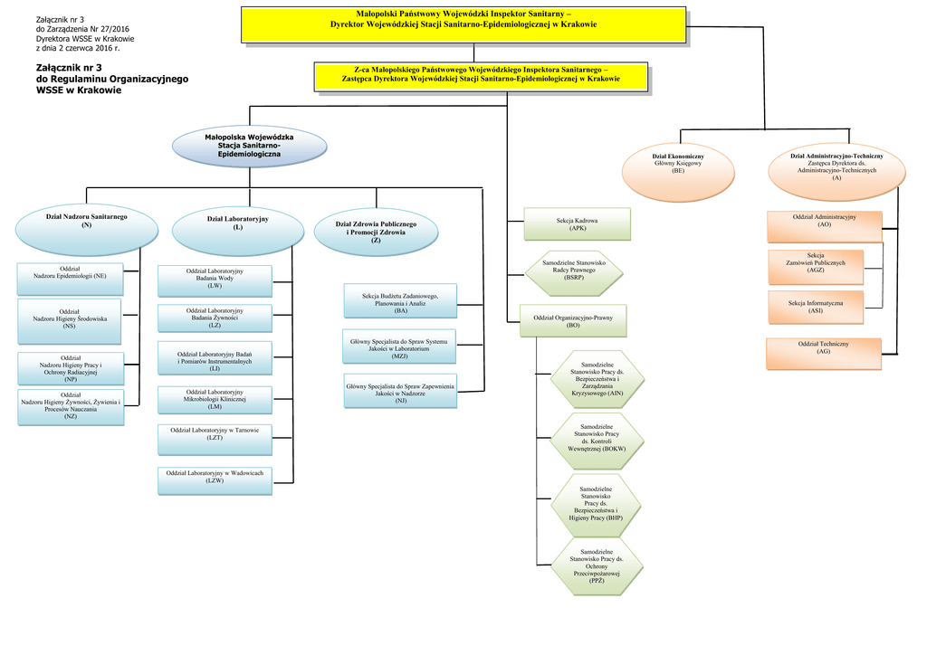 Małopolski Państwowy Wojewódzki Inspektor Sanitarny – Dyrektor Wojewódzkiej Stacji Sanitarno-Epidemiologicznej w Krakowie Załącznik nr 3 do Zarządzenia Nr 27/2016 Dyrektora WSSE w Krakowie z dnia 2 czerwca 2016 r. Załącznik nr 3 do Regulaminu Organizacyjnego WSSE w Krakowie Z-ca Małopolskiego Państwowego Wojewódzkiego Inspektora Sanitarnego – Zastępca Dyrektora Wojewódzkiej Stacji Sanitarno-Epidemiologicznej w Krakowie Małopolska Wojewódzka Stacja SanitarnoEpidemiologiczna Dział Nadzoru Sanitarnego (N) Oddział Nadzoru Epidemiologii (NE) Oddział Nadzoru Higieny Środowiska (NS) Oddział Nadzoru Higieny Pracy i Ochrony Radiacyjnej (NP) Oddział Nadzoru Higieny Żywności, Żywienia i Procesów Nauczania (NZ) Dział Laboratoryjny (L) Dział Ekonomiczny Główny Księgowy (BE) Dział Zdrowia Publicznego i Promocji Zdrowia (Z) Samodzielne Stanowisko Radcy Prawnego (BSRP) Oddział Laboratoryjny Badania Wody (LW) Oddział Laboratoryjny Badania Żywności (LZ) Oddział Laboratoryjny Badań i Pomiarów Instrumentalnych (LI) Oddział Laboratoryjny Mikrobiologii Klinicznej (LM) Oddział Laboratoryjny w Tarnowie (LZT) Sekcja Kadrowa (APK) Sekcja Budżetu Zadaniowego, Planowania i Analiz (BA) Dział Administracyjno-Techniczny Zastępca Dyrektora ds. Administracyjno-Technicznych (A) Oddział Administracyjny (AO) Sekcja Zamówień Publicznych (AGZ) Sekcja Informatyczna (ASI) Oddział Organizacyjno-Prawny (BO) Główny Specjalista do Spraw Systemu Jakości w Laboratorium (MZJ) Główny Specjalista do Spraw Zapewnienia Jakości w Nadzorze (NJ) Oddział Techniczny (AG) Samodzielne Stanowisko Pracy ds. Bezpieczeństwa i Zarządzania Kryzysowego (AIN) Samodzielne Stanowisko Pracy ds. Kontroli Wewnętrznej (BOKW) Oddział Laboratoryjny w Wadowicach (LZW) Samodzielne Stanowisko Pracy ds. Bezpieczeństwa i Higieny Pracy (BHP) Samodzielne Stanowisko Pracy ds. Ochrony Przeciwpożarowej (PPŻ)