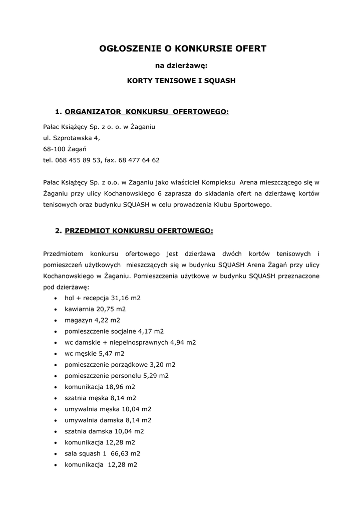 OGŁOSZENIE O KONKURSIE OFERT na dzierżawę: KORTY TENISOWE I SQUASH 1. ORGANIZATOR KONKURSU OFERTOWEGO: Pałac Książęcy Sp. z o. o. w Żaganiu ul. Szprotawska 4, 68-100 Żagań tel. 068 455 89 53, fax. 68 477 64 62 Pałac Książęcy Sp. z o.o. w Żaganiu jako właściciel Kompleksu Arena mieszczącego się w Żaganiu przy ulicy Kochanowskiego 6 zaprasza do składania ofert na dzierżawę kortów tenisowych oraz budynku SQUASH w celu prowadzenia Klubu Sportowego. 2. PRZEDMIOT KONKURSU OFERTOWEGO: Przedmiotem konkursu ofertowego jest dzierżawa dwóch kortów tenisowych i pomieszczeń użytkowych mieszczących się w budynku SQUASH Arena Żagań przy ulicy Kochanowskiego w Żaganiu. Pomieszczenia użytkowe w budynku SQUASH przeznaczone pod dzierżawę: hol + recepcja 31,16 m2 kawiarnia 20,75 m2 magazyn 4,22 m2 pomieszczenie socjalne 4,17 m2 wc damskie + niepełnosprawnych 4,94 m2 wc męskie 5,47 m2 pomieszczenie porządkowe 3,20 m2 pomieszczenie personelu 5,29 m2 komunikacja 18,96 m2 szatnia męska 8,14 m2 umywalnia męska 10,04 m2 umywalnia damska 8,14 m2 szatnia damska 10,04 m2 komunikacja 12,28 m2 sala squash 1 66,63 m2 komunikacja 12,28 m2 sala squash 2 66,63 m2 Łączna powierzchnia przeznaczona pod dzierżawę- 292,34 m kw. Rzut ogólny budynku z zaznaczonym przedmiotem dzierżawy stanowi załącznik nr 1. Minimalna cena, którą Oferent zobowiązany jest określić w swojej ofercie wynosi: korty tenisowe- 500 zł netto miesięcznie / płatne przez okres 6 miesięcy w roku od 1 kwietnia do 30 września/ SQUASH- 2000 zł netto miesięcznie / płatne przez okres 12 miesięcy w roku/ 3. WARUNKI UDZIAŁU W KONKURSIE OFERTOWYM: 1) Do udziału w konkursie ofertowym mogą ubiegać się Oferenci, którzy spełniają następujące warunki: a) posiadają uprawnienia do występowania w obrocie gospodarczym w zakresie objętym ofertą (mają zarejestrowaną działalność we właściwym rejestrze lub zaświadczenie o wpisie do ewidencji działalności gospodarczej). b) znajdują się w sytuacji ekonomicznej i finansowej zapewniającej płynność prowadzenia usług bez możliwości ubiegania się o wcześniejsze zaliczki od Organizatora konkursu na rozpoczęcie działalności. Oferent składa oświadczenia na załączonym druku (załącznik nr 3). c) Nie zalegają z płatnościami podatków i składek ZUS. 2) Warunkiem uczestnictwa w konkursie ofert jest: a) złożenie oferty b) wniesienia przez Oferenta wadium w wysokości 2 000,00 PLN (słownie: dwa tysiące złotych) na konto 0254 1534 0001 BPS S.A o/Legnica 23 1930 1044 2280 w terminie do 25.05.2015 r. do godz. 10.30 w z dopiskiem „Wadium - oferta na dzierżawę kortów tenisowych i SQUASHA”. Kserokopię dowodu wpłaty należy dołączyć do oferty. Wpłacone wadium stanowi gwarancję przystąpienia Oferenta do podpisania umowy. Wadium wpłacone przez Oferenta, którego oferta została wybrana zostanie zaliczone na poczet przyszłych zobowiązań czynszowych. Pozostałym Oferentom wadium zostanie zwrócone w terminie 7 dni roboczych od daty zakończenia przetargu i dokonania wyboru najkorzystniejszej oferty. W przypadku uchylania się Oferenta, którego oferta została wybrana zwrotowi. od zawarcia umowy w wyznaczonym terminie - wadium nie będzie podlegać 4. WARUNKI DOTYCZĄCE OFERTY: 1. Wzór oferty stanowi załącznik nr 2 do niniejszego ogłoszenia. Za ważną uznaje się jedynie ofertę złożoną wg wzoru formularza stanowiącego załącznik nr 2 do niniejszego zaproszenia. 2. Do oferty należy dołączyć: a) Komplet dokumentów rejestracyjnych firmy: (aktualny wypis z właściwego rejestru lub zaświadczenie o wpisie do ewidencji działalności gospodarczej potwierdzający dopuszczenie do obrotu gospodarczego w zakresie objętym ofertą, NIP, REGON); b) Oświadczenie Oferenta, że znajduje się w sytuacji ekonomicznej i finansowej zapewniającej płynność prowadzenia usług bez możliwości ubiegania się o wcześniejsze zaliczki od Wydzierżawiającego na rozpoczęcie działalności. Oferent składa oświadczenia na załączonym wzorze (załącznik nr 3); c) Kserokopia potwierdzenia przelewu na kwotę 2 000 PLN (słownie: dwa tysiące złotych); d) Zaświadczenie z Urzędu Skarbowego i Zakładu Ubezpieczeń Społecznych o niezaleganiu w podatkach i składkach ZUS ( nie starsze niż 3 miesiące od daty złożenia oferty). Brak jakiegokolwiek dokumentu spowoduje niedopuszczenie Oferenta do konkursu. Dokumenty są składane w formie oryginału lub kopii poświadczonej: „za zgodność z oryginałem” przez Oferenta. 5. PROCEDURA POSTĘPOWANIA I PRZEPROWADZENIA KONKURSU 1) Wyboru oferty dokonuje Komisja Konkursowa powołana przez Prezesa Zarządu Spółki Pałac Książęcy w Żaganiu. 2) Kryterium oceny ofert: Komisja Konkursowa dokonując oceny ofert bierze pod uwagę wyłącznie proponowana wysokość miesięcznego czynszu w kwocie netto. 3) Organizator konkursu ofert zastrzega sobie prawo do zamknięcia konkursu bez wybrania którejkolwiek z ofert, bez podania przyczyny na każdym jego etapie. 4) Oferent jest związany ofertą w ciągu 30 dni od dnia otwarcia ofert. 5) Konkurs może się odbyć pod warunkiem, że wpłynie przynajmniej jedna oferta spełniająca wymogi formalne konkursu. 6. OBOWIĄZKI DZIERŻAWCY: 1) Dzierżawca jest zobowiązany do prowadzenia w wydzierżawianych obiektach usług rekreacyjno- sportowych. 2) Dzierżawca oprócz miesięcznego czynszu zobowiązany jest uiszczać miesięczne opłaty za używanie mediów: a) Energia elektryczna na podstawie zużycia według licznika ( około 1.000,00 zł netto miesięcznie); b) woda według ryczałtu ( zimna woda i ścieki: 4m³ x 11,66 netto, ciepła woda i ścieki: 2 m³ x 21,66 netto)- 89,96 zł netto. 3) Dzierżawca jest zobowiązany do uzyskania własnym staraniem wszystkich pozwoleń i koncesji niezbędnych do prowadzenia działalności. 4) Dzierżawca jest zobowiązany do wykupienia ubezpieczenia od odpowiedzialności cywilnej z sumą gwarantowaną 