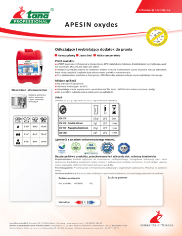 Informacja techniczna • DE N • DE ON NFECT IO SI SI APESIN oxydes NFECT I Odkażający i wybielający dodatek do prania ■ Usuwa plamy ■ Jasna biel ■ Niska temperatura Profil produktu ■ APESIN oxydes dezynfekuje już w temperaturze 20°C i działa bakteriobójczo, drożdżobójczo i grzybobójczo, zgodnie z normami EN 1276, EN 1650 i EN 13697. ■ Receptura produktu oparta na nadtlenku wodoru i kwasie nadoctowym usuwa wszystkie rodzaje zabrudzeń, które można wybielić, i wybiela białe płótno nawet w niskich temperaturach. ■ Przy zastosowaniu produktu w fazie prania, APESIN oxydes pozwala uniknąć użycia wybielacza chlorowego. Miejsce aplikacji Stosowanie i dozowaniemas Zalecane jest korzystanie z automatycznych systemów dozujących. ■ Do pralek profesjonalnych. ■ Działanie wybielające: od 40°C. ■ Dezynfekcja prania: w połączeniu z produktami ACTIV liquid i SYSTEM alca (zobacz poniższą tabelę) ■ Do wszystkich rodzajów prania odpornych na wybielanie. Skład Składniki na 100 gr: 5g PERACETIC ACID, 26g HYDROGEN PEROXIDE Zgodność z zasadami zrównoważonego rozwoju Bezpieczeństwo produktu, przechowywanie i zalecenia dot. ochrony środowiska Bezpieczeństwo: Produkt wyłącznie do zastosowania profesjonalnego. Szczegółowe informacje patrz karta techniczna. Produktów biobójczych należy używać z zachowaniem środków ostrożności. Przed każdym użyciem należy przeczytać etykietę i informacje dotyczące produktu. Przechowywanie: Przechowywać w temperaturze pokojowej w oryginalnym opakowaniu. Wrażliwy na działanie mrozu. Ochrona środowiska:Wyrzucać tylko całkowicie opróżnione opakowania do właściwego pojemnika na odpady. Zaufany partner Dostępne opakowania Kod produktu.: 0712850 Wartość pH 20 L 1 tana-Chemie GmbH | Rheinallee 96 | D 55120 Mainz | Germany | www.wmprof.com | + 49 (0)6131 964 03 Werner & Mertz Professional Vertriebs GmbH | Neualmerstr. 13 | A 5400 Hallein | Österreich | www.wmprof.com | + 43 (0)6245 87286 Werner & Mertz Polska sp. z o.o. | ul. Krakowiaków 50 | 02-255 Warszawa | Polska | www.werner-mertz.pl | + 48 22 771 46 71