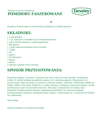 Przepis ze strony Develey.pl POMIDORY FASZEROWANE Pomidory faszerowane są niezawodną przekąską na każdej imprezie. SKŁADNIKI: ● ● ● ● ● ● ● ● ● ● ● ● 5 pomidorków 1 op. tuńczyka w kawałkach po śródziemnomorsku 100 g oliwek zielonych z pastą paprykową 80g kapary 1 łyżka majonezu(użyłam firmy Develey) 3 jajka sól pieprz Do dekoracji : kapary oliwki majonez (użyłam firmy Develey) SPOSÓB PRZYGOTOWANIA: Pomidory myjemy, osuszamy i odcinamy ok.7mm część od strony ogonka. Wydrążamy środki. W środek każdego pomidorka sypiemy sól i odrobinę pieprzu. Odstawiamy, by puściły wodę. Jajka gotujemy na twardo w osolonej wodzie. Obieramy. Oddzielamy żółtka od białek. Żółtka rozcieramy widelcem z 1 łyżką majonezu. Dodajemy odsączone kapary i oliwki przekrojone na pół oraz kawałki tuńczyka. Mieszamy i doprawiamy do smaku solą i pieprzem. Przygotowanym farszem wypełniamy pomidorki. Na wierzchu każdego rozsmarowujemy majonez. Dodajemy oliwki i kapary. Odstawiamy na 1-2 godziny do lodówki do schłodzenia. Smacznego. Więcej przepisów na Smaczne przepisy.