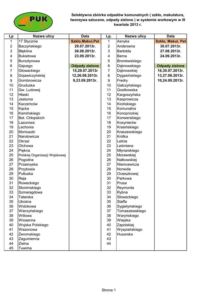 Selektywna zbiórka odpadów komunalnych ( szkło, makulatura, tworzywa sztuczne, odpady zielone ) w systemie workowym w III kwartale 2013 r. Lp 1 2 3 4 5 6 7 8 9 10 11 12 13 14 15 16 17 18 19 20 21 22 23 24 25 26 27 28 29 30 31 32 33 34 35 36 37 38 39 40 41 42 43 44 45 Nazwa ulicy 17 Stycznia Baczyńskiego Błękitna Bukietowa Bursztynowa Gajcego Głowackiego Gojawiczyńskiej Gombrowicza Gruduska Gw. Ludowej Hłaski Jasturna Kaczeńców Kącka Kamińskiego Bat. Chłopskich Lazurowa Lechonia Moniuszki Narutowicza Okrzei Olchowa Piękna Polskiej Organizacji Wojskowej Pogodna Przasnyska Przybosia Pułtuska Reja Roweckiego Słonimskiego Szmaragdowa Tatarska Ukośna Widokowa Wierzyńskiego Willowa Wiosenna Wojska Polskiego Wazonowa Żeromskiego Zagumienna Zielna Tuwima Data Szkło,Makul,Pet 29.07.2013r. 26.08.2013r. 23.09.2013r. Odpady zielone 15,29.07.2013r 12,26.08.2013r. 9,23.09.2013r. Lp. 1 2 3 4 5 6 7 8 9 10 11 12 13 14 15 16 17 18 19 20 21 22 23 24 25 26 27 28 29 30 31 32 33 34 35 36 37 38 39 40 41 42 43 44 Strona 1 Nazwa ulicy Asnyka Andersena Bartołda Bema Broniewskiego Dąbrowskiego Dąbrowskiej Dygasińskiego Fredry Gałczyńskiego Gostkowska Kargoszyńska Kasprowicza Kicińskiego Komunalna Konopnickiej Konwerskiego Kosynierów Krasińskiego Kraszewskiego Krótka Letnia Leśmiana Młynarskiego Morawskiej Nałkowskiej Niemcewicza Norwida Orzeszkowej Parkowa Prusa Reymonta Rybna Słowackiego Staffa Sygietyńskiego Tomaszewskiego Waryńskiego Wiejska Zapolskiej Wyspiańskiego Husarska Data Szkło, Makul, Pet 30.07.2013r. 27.08.2013r. 24.09.2013r. Odpady zielone 16,30.07.2013r. 13,27.08.2013r. 10,24.09.2013r. Selektywna zbiórka odpadów komunalnych ( szkło, makulatura, tworzywa sztuczne, odpady zielone ) w systemie workowym w III kwartale 2013 r. Lp 1 2 3 4 5 6 7 8 9 10 11 12 13 14 15 16 17 18 19 20 21 22 23 24 25 26 27 28 29 30 31 32 33 34 35 36 37 38 39 40 Nazwa ulicy 11-Pułku Ułanów Leg. 11 Listopada 3 Maja Akacjowa Augustiańska Bony Jesionowa Juranda Kilińskiego Klonowa Kmicica Kopernika Ks. Janusza Małgorzacka Nadrzeczna Nowozagumienna Orylska Pijanowskiego Pl. Kościuszki Rycerska Rynek Sierakowskiego Ściegiennego Śląska Skrzetuskiego Topolowa Warszawska Witosa Zacisze Zagłoby Zamkowa Zbyszka i Danusi Zielona Zielona Ścieżka Polna Strażacka Grodzka Data Szkło,Makul,Pet 31.07.2013r. 28.08.2013r. 25.09.2013r. Odpady zielone 17,31.07.2013r 14,28.08.2013r. 11,25.09.2013r. Lp. 1 2 3 4 5 6 7 8 9 10 11 12 13 14 15 16 17 18 19 20 21 22 23 24 25 26 27 28 29 30 31 32 33 34 35 36 37 38 39 40 41 42 Strona 2 Nazwa ulicy Data Andersa Szkło, Makul, Pet Armii Krajowej 1.08.2013r Bielińska 29.08.2013r. Ceramiczna 26.09.2013r. Dobra Kasprzaka Odpady zielone Krubińska 18.07.2013r. Krucza 1,16,29.08.2013r. Księcia Konrada 12,26.09.2013r. Kolonijna Ludowa Łąkowa Łuksiewicza Malinowa Okopowa Piwna Płońska Ptasia Ranieckiej Reutta Rzeczkowska Sezamkowa Skłodowskiej Słońskiego Sońska Spacerowa Szwanke Wędkarska Wrzosowa Żurawia Żytnia Chabrowa – HENKEL Sosnowa Jaśminowa Św. Marka Św. Anny Św. Franciszka Św. Stanisława Kostki Św. Floriana Nizinna Długa Zagrodowa Selektywna zbiórka odpadów komunalnych ( szkło, makulatura, tworzywa sztuczne, odpady zielone ) w systemie workowym w III kwartale 2013 r. Lp 1 2 3 4 5 6 7 8 9 10 11 12 13 14 15 16 17 18 19 20 21 22 23 24 25 26 27 28 29 30 31 32 33 34 35 36 37 38 39 40 41 42 43 44 45 46 47 48 49 50 51 52 53 Nazwa ulicy Astrowa Boczna Cicha Cukrownicza Działkowa Fabryczna Gąsecka Górna Graniczna Jasna Konwaliowa Krzywa Kwiatowa Lawendowa Leśna Mleczarska Mławska Młynarska Niechodzka Nowokolejowa Nużewska Obozowa Ogrodowa Os. Fabryczna Ostatni Grosz Partyzantów Płocka Powstańców Warszawskich Pęchcińska Równa Różana Rumiankowa Sienkiewicza Skrajna Sopkojna Starowiejska Szczurzynek Szumna Śmiecińska Towarowa Ułańska Wąska Wesoła Widna Wierzbowa Wiklinowa Wiśniowa Wyzwolenia Kolonia Niechodzka Spółdzielcza Dębowa Mazowiecka Perłowa Data Szkło,Makul,Pet 2.08.2013r. 30.08.2013r. 27.09.2013r. Odpady zielone 19.07.2013r 2,17,30.08.2013r. 13,27.09.2013r. Lp. 1 2 3 4 5 6 7 8 9 10 11 12 13 14 15 16 17 18 19 20 21 22 23 24 25 26 27 28 29 30 31 32 33 34 35 36 37 38 39 40 41 42 43 44 45 46 47 48 Strona 3 Nazwa ulicy Baranowskiego Bąkowskiej Bogusławskiego Boh. Września Boh. Westerplatte Biegasa Chełmońskiego Chopina Czarneckiego Dywizjonu 305 Dziedzica Dziubińskiej E.Plater Gwiazdowicza Grzelakowej Hubala Jaracza Jureckiego Klonowskiego Kolbego Kolberga Krasickiego Kuny Kurpińskiego Lelewela Matejki Monte Casino Nodzykowskiego Ogińskiego Osterwy Paderewskiego Patriotów Przyleśna Puławskiego Rajkowskiego Różyckiego Sempołowskiej Skrajna Solskiego Szymanowskiego Traugutta Węgrzyna Wieniawskiego Wita Stwosza Wolskiego Zelwerowicza Zielone Wzgórze Data Szkło, Makul, Pet 5.08.2013r. 2.09.2013r 30.09.2013r. Odpady zielone 22.07.2013r 5,19.08.2013r 2,16,30.09.2013r.