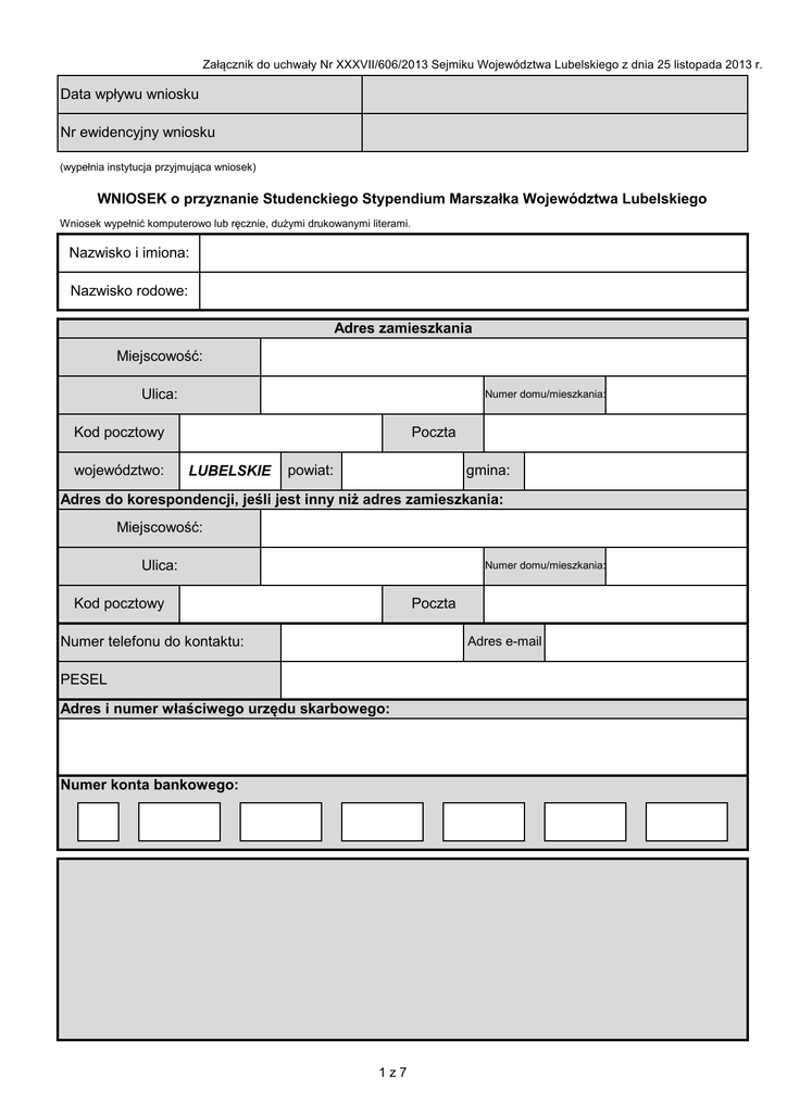 Załącznik do uchwały Nr XXXVII/606/2013 Sejmiku Województwa Lubelskiego z dnia 25 listopada 2013 r. Data wpływu wniosku Nr ewidencyjny wniosku (wypełnia instytucja przyjmująca wniosek) WNIOSEK o przyznanie Studenckiego Stypendium Marszałka Województwa Lubelskiego Wniosek wypełnić komputerowo lub ręcznie, dużymi drukowanymi literami. Nazwisko i imiona: Nazwisko rodowe: Adres zamieszkania Miejscowość: Ulica: Numer domu/mieszkania: Kod pocztowy województwo: Poczta LUBELSKIE powiat: gmina: Adres do korespondencji, jeśli jest inny niż adres zamieszkania: Miejscowość: Ulica: Numer domu/mieszkania: Poczta Kod pocztowy Numer telefonu do kontaktu: Adres e-mail PESEL Adres i numer właściwego urzędu skarbowego: Numer konta bankowego: 1z7 Dane o studiach Nazwa uczelni: Adres uczelni: Wydział: Kierunek studiów/zakres/specjalność: Forma kształcenia: jednolite magisterskie/lekarskie; pierwszego stopnia; drugiego stopnia stacjonarne, niestacjonarne Czas trwania studiów Rok nauki Data rozpoczęcia studiów jednolitych magisterskich lub data rozpoczęcia studiów pierwszego stopnia (rrrr-mm-dd) Data uzyskania tytułu zawodowego (po zakończeniu studiów jednolitych magisterskich lub studiów I stopnia) (rrrr-mm-dd) Data rozpoczęcia studiów drugiego stopnia (rrrr-mm-dd) Data uzyskania tytułu zawodowego (po zakończeniu studiów II stopnia) (rrrr-mm-dd) Średnia ocen uprawniająca do ubiegania się o stypendium rektora dla najlepszego studenta na macierzystej uczelni Średnia ocen studenta wpisać średnią z dokładnością do trzech miejsc po przecinku wpisać średnią z dokładnością do trzech miejsc po przecinku Potwierdzenie powyższych danych przez właściwego dziekana lub inną osobę do tego uprawnioną: ……………………………………...…………………………………. Pieczęć instytucji 2z7 ……………………………………………..………………………. Pieczęć, data i podpis dziekana lub osoby do tego uprawnionej WYKAZ OSIĄGNIĘĆ Z OSTATNIEGO ZAKOŃCZONEGO ROKU AKADEMICKIEGO Praca w kole/towarzystwie naukowym/organizacji o charakterze naukowym zarejestrowanym w uczelni macierzystej udokumentowana potwierdzeniem opiekuna/ kierownika koła/kierownika towarzystwa 1. naukowego/osoby kierującej organizacją wraz z opisem działań/inicjatyw studenta podejmowanych w trakcie ocenianego roku akademickiego. Nazwa koła/towarzystwa naukowego/organizacji o charakterze naukowym Nr załącznika zgodny z wykazem załączników a) b) c) Działalność popularnonaukowa, w tym organizacja lub współorganizacja imprez popularnonaukowych, czynny udział w upowszechnianiu wiedzy (festiwale nauki, inne formy promocji i popularyzowania nauki) 2. udokumentowane kserokopią materiałów z imprezy zawierających: imię i nazwisko uczestnika/organizatora/współorganizatora, nazwę imprezy, datę i miejsce organizacji imprezy. Nazwa imprezy Nr załącznika zgodny z wykazem załączników a) b) Praca naukowo – badawcza (program, grant, projekt) prowadzona w uczelni macierzystej lub poza uczelnią macierzystą, bez badań prowadzonych w ramach przygotowywanej pracy dyplomowej tj.: 3. licencjackiej, inżynierskiej, magisterskiej udokumentowana potwierdzeniem kierownika programu/grantu/projektu badawczego z informacją o zakresie wykonywanej pracy. Tytuł pracy naukowo - badawczej Nr załącznika zgodny z wykazem załączników a) b) Praca naukowo - badawcza (program, grant, projekt) prowadzona poza uczelnią macierzystą, bez badań prowadzonych w ramach przygotowywanej pracy dyplomowej tj.: licencjackiej, inżynierskiej, 4. magisterskiej udokumentowana potwierdzeniem kierownika programu/grantu/projektu badawczego z informacją o zakresie wykonywanej pracy. Tytuł pracy naukowo - badawczej a) b) 3z7 Nr załącznika zgodny z wykazem załączników Odbyte studia w ramach stypendium zagranicznego lub/i programów międzyuczelnianych 5. udokumentowane zaświadczeniem wydanym przez uczelnię macierzystą o odbytych studiach w innej uczelni w ramach stypendium zagranicznego lub programów międzyuczelnianych. Nr załącznika zgodny z wykazem załączników Nazwa stypendium/programu międzyuczelnianego a) b) 6. Studia równoległe na dodatkowym kierunku udokumentowane zaświadczeniem wydanym przez właściwą uczelnię. Nr załącznika zgodny z wykazem załączników Kierunek studiów - nazwa uczelni wyższej a) b) 7. Studia międzyobszarowe udokumentowane zaświadczeniem wydanym przez właściwą uczelnię. Nr załącznika zgodny z wykazem załączników Kierunek studiów - nazwa uczelni wyższej Publikacje naukowe - publikacja w zeszycie naukowym lub na poziomie czasopisma 8. uczelnianego/specjalistycznego udokumentowane kserokopią stron, które zawierają: tytuł publikacji, nazwisko autora, datę i miejsce wydania lub opinią recenzenta. Tytuł publikacji Nr załącznika zgodny z wykazem załączników a) b) c) Czynny udział w konferencji naukowej, seminarium naukowym poprzez wygłoszenie referatu, wykładu, komunikatu, prezentacji, wystąpienie z posterem udokumentowany oficjalnym programem zawierającym 9. imię nazwisko wnioskodawcy, datę, miejsce, podmiot organizujący, temat oraz formę i tytuł wystąpienia. Tytuł wystąpienia - nazwa konferencji/seminarium naukowego a) b) c) 4z7 Nr załącznika zgodny z wykazem załączników Patenty, prawa ochronne na wzory użytkowe i znaki towarowe, prawa z rejestracji wzorów przemysłowych lub topografii układu scalonego oraz zgłoszenia wynalazków udokumentowanie arkuszem 10. zgłoszeniowym wynalazku lub prawa ochronnego oraz potwierdzeniem zgłoszenia wynalazku lub prawa ochronnego z urzędu patentowego zawierające datę i numer zgłoszenia. Tytuł patentu/prawa ochronnego/znaku towarowego/wynalazku Nr załącznika zgodny z wykazem załączników a) b) 11. Osiągnięcia edukacyjne udokumentowane dyplomem lub innym potwierdzeniem o uzyskanej nagrodzie, zawierającym: imię i nazwisko wnioskoda