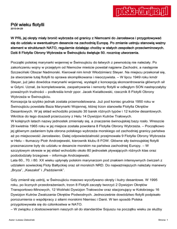 Pół wieku flotylli 2015-04-29 W PRL jej okręty miały bronić wybrzeża od granicy z Niemcami do Jarosławca i przygotowywać się do udziału w ewentualnym desancie na zachodnią Europę. Po zmianie ustroju stanowią ważny element w strukturach NATO, regularnie działając choćby w stałych zespołach przeciwminowych. Dziś 8 Flotylla Obrony Wybrzeża w Świnoujściu świętuje 50. rocznicę utworzenia. Początki polskiej marynarki wojennej w Świnoujściu do łatwych z pewnością nie należały. Po zakończeniu wojny w przejętym od Niemców mieście powstał najpierw Zachodni, a następnie Szczeciński Obszar Nadmorski. Kierował nim kmdr Włodzimierz Steyer. Na miejscu przekonał się, że stworzenie tutaj flotylli to sprawa skomplikowana i nieoczywista. – W lipcu 1949 roku kmdr Steyer, już jako dowódca marynarki wojennej, wystąpił z koncepcją skoncentrowania głównych sił w Gdyni. Uznał, że kompletowanie, zaopatrywanie i remonty flotylli w odległym SON nastręczałyby poważnych trudności – podkreśla kmdr ppor. Jacek Kwiatkowski, rzecznik 8 Flotylli Obrony Wybrzeża w Świnoujściu. Koncepcja ta szybko jednak została przemodelowana. Już pod koniec grudnia 1950 roku w Świnoujściu powstała Baza Marynarki Wojennej, której trzon stanowiła Flotylla Okrętów Desantowych. W jej skład wchodziło przeszło 30 barek różnych typów i 12 kutrów desantowych. Wkrótce do tego doszedł przerzucony z Helu 14 Dywizjon Kutrów Trałowych. W kolejnych latach nazwy jednostek zmieniały się, a znaczenie świnoujskiej bazy rosło. Wreszcie 29 kwietnia 1965 roku w jej miejsce została powołana 8 Flotylla Obrony Wybrzeża. – Początkowo jej głównym zadaniem była obrona polskiego wybrzeża morskiego od zachodniej granicy państwa aż po miejscowość Jarosławiec. Dalej odpowiedzialność przejmowała 9 Flotylla Obrony Wybrzeża w Helu – tłumaczy Piotr Andrzejewski, kierownik klubu 8 FOW. Główne siły świnoujskiej flotylli przeznaczone były do udziału w desancie morskim na państwa zachodniej Europy. – W szczytowym okresie w jej skład wchodziło około 80 jednostek pływających różnych klas oraz podododziały brzegowe – informuje Andrzejewski. Lata 60., 70. i 80. XX wieku upłynęły polskim marynarzom pod znakiem intensywnych ćwiczeń z udziałem sowieckiej Floty Bałtyckiej oraz sił morskich NRD. Do najważniejszych należały manewry „Bryza”, „Kaszalot” i „Październik”. Gdy zmienił się ustrój, w Świnoujściu masowo wycofywano okręty i kutry desantowe. W 1995 roku, po licznych przeobrażeniach, trzon 8 Flotylli zaczęły tworzyć 2 Dywizjon Okrętów Transportowo-Minowych, 12 Woliński Dywizjon Trałowców oraz stacjonujący w Kołobrzegu 16 Dywizjon Kutrów Zwalczania Okrętów Podwodnych. Jednocześnie dowództwo flotylli podpisało porozumienia o współpracy z siłami morskimi Niemiec i Danii. W ten sposób Polska przygotowywała się do członkostwa w NATO. – W związku z dostosowaniem naszych sił do standardów Sojuszu na początku wieku ze służby Autor: Łukasz Zalesiński Strona: 1 wycofano kilkanaście jednostek pływających starszych typów. Jednocześnie do linii wszedł okręt wsparcia logistycznego ORP „Kontradmirał Xawery Czernicki” – wspomina kmdr ppor. Kwiatkowski. Okręt ten brał udział m.in. w wojnie irackiej. – Ważnym dla nas wydarzeniem było też rozformowanie 9 Flotylli z Helu. Wówczas to został nam podporządkowany 13 Dywizjon Trałowców – mówi kmdr ppor. Kwiatkowski. W tym czasie przeobrażenie przeszedł świnoujski port wojenny. W latach 2004–2010 wzbogacił się o nowoczesne nabrzeże, drogi dojazdowe i lądowisko dla śmigłowców. Pogłębiono baseny portowe i odcinek toru wodnego oraz wyremontowano falochrony. – Tym samym nasz port stał się bazą morską NATO – podkreśla kmdr ppor. Kwiatkowski. Obecnie w skład 8 Flotylli wchodzą trzy dywizjony okrętów (jeden transportowo-minowych oraz dwa trałowców, które dysponują grupami nurków minerów), 8 Kołobrzeski Batalion Saperów z pododdziałem chemicznym oraz 8 Dywizjon Przeciwlotniczy. Świnoujscy marynarze regularnie biorą udział w międzynarodowych ćwiczeniach, należące do flotylli niszczyciele min zaś od lat wchodzą w skład Stałego Zespołu Sił Obrony Przeciwminowej NATO (SNMCMG1). Rolę okrętu flagowego zespołu dwukrotnie pełnił ORP „Kontradmirał Xawery Czernicki”. Dziś 8 FOW świętuje swoje półwiecze. Z tej okazji w porcie wojennym odbędą się uroczystości dla oficjeli i zaproszonych gości. Natomiast 2 maja marynarze zapraszają mieszkańców Świnoujścia i turystów na wielki festyn, podczas którego będzie można m.in. obejrzeć wybrane okręty, a także przejść specjalnie zbudowanym mostem pontonowym z centrum miasta na Półwysep Zieliny, gdzie mieści się port wojenny. Autor: Łukasz Zalesiński Strona: 2