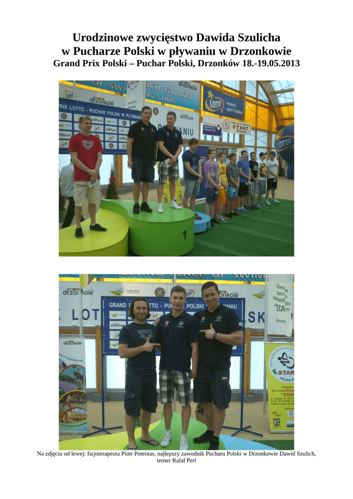 Urodzinowe zwycięstwo Dawida Szulicha w Pucharze Polski w pływaniu w Drzonkowie Grand Prix Polski – Puchar Polski, Drzonków 18.-19.05.2013 Na zdjęciu od lewej: fizjoterapeuta Piotr Potentas, najlepszy zawodnik Pucharu Polski w Drzonkowie Dawid Szulich, trener Rafał Perl W dniach 18.-19. maja 2013 roku odbyły się siódme zawody z cyklu Grand Prix Polski – Puchar Polski w sezonie 2012/2013. Na 50 metrowej krytej pływalni Wojewódzkiego Ośrodka Sportu i Rekreacji w Drzonkowie wystartowało 333 zawodniczek i zawodników z 48 klubów z całej Polski. UKS „Delfin” Legionowo reprezentował Dawid Szulich startujący w konkurencjach w stylu klasycznym. Na dystansach 50 i 100 metrów stylem klasycznym nasz najlepszy legionowianin był bezkonkurencyjny zwyciężając w swojej koronnej konkurencji na 100m uzyskując czas 1:02,13 oraz na dystansie 50 metrów stylem klasycznym uzyskując czas 28,23 sekundy, a także zajmując 2. miejsce na 200 metrów stylem klasycznym z czasem 2:17,25. Dawid za osiągnięte wyniki na 50 i 100 metrów stylem klasycznym w punktacji ogólnej osiągnął 1681 punktów zajmując 1. miejsce. Dotychczas to najlepszy start w tej edycji Grand Prix Polski – Puchar Polski w sezonie 2012/2013. Dawid o zawodach: "Po raz kolejny mogę zaliczyć te zawody do bardzo udanych. Niezwykle miła atmosfera, jaka towarzyszyła nam przez ten weekend nie była spowodowana tylko bardzo dobrymi wynikami ale również zwycięstwem w punktacji generalnej i jednocześnie był to najlepszy prezent jaki mogłem sobie sam sprawić na moje 23-cie urodziny. Tym razem najbardziej wartościowym wynikiem był czas na 50m stylem klasycznym, gdzie do minimum na Mistrzostwa Świata zabrakło tylko 0,23 sekundy a przecież jeszcze ponad trzy tygodnie do kwalifikacji. Satysfakcjonujące było również pokonanie w punktacji ogólnej Mistrza Świata w stylu grzbietowym Radka Kawęckiego, który startował u siebie w "domu". Kolejne zawody i kolejne postępy. Za dwa tygodnie ostatnie z cyklu Grand Prix Polski w tym sezonie a w połowie czerwca Mistrzostwa Polski, także najbliższe tygodnie zapowiadają się bardzo pracowicie." /rp/, /tk/