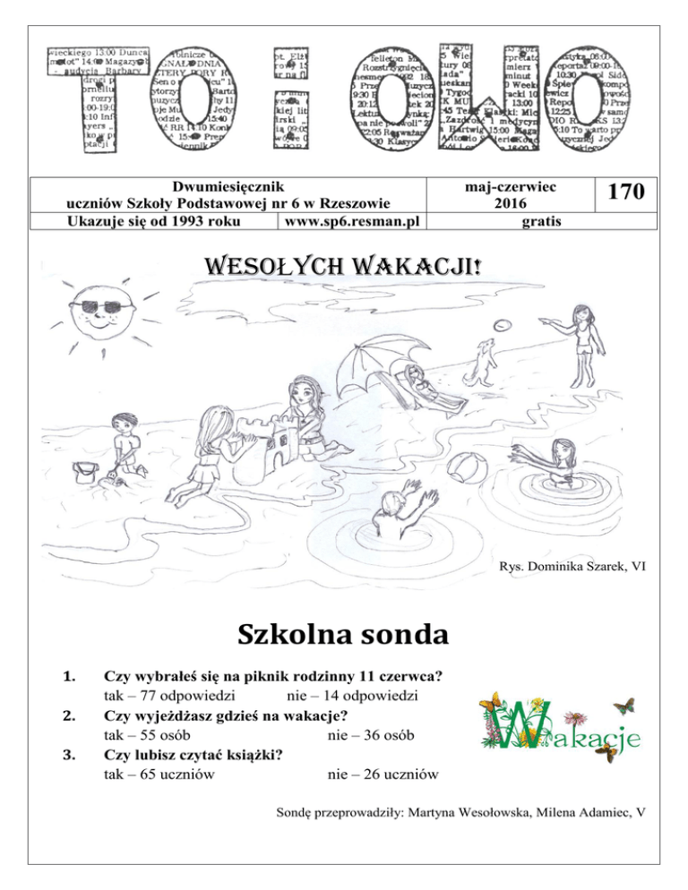 Dwumiesięcznik uczniów Szkoły Podstawowej nr 6 w Rzeszowie Ukazuje się od 1993 roku www.sp6.resman.pl maj-czerwiec 2016 gratis 170 WESOŁYCH WAKACJI! Rys. Dominika Szarek, VI Szkolna sonda 1. 2. 3. Czy wybrałeś się na piknik rodzinny 11 czerwca? tak – 77 odpowiedzi nie – 14 odpowiedzi Czy wyjeżdżasz gdzieś na wakacje? tak – 55 osób nie – 36 osób Czy lubisz czytać książki? tak – 65 uczniów nie – 26 uczniów Sondę przeprowadziły: Martyna Wesołowska, Milena Adamiec, V Wywiad numeru Zapraszamy Czytelników do przeczytania rozmowy z Kajetanem Ostrowskim z klasy VI, który w bieżącym roku szkolnym uzyskał tytuł laureata Konkursu Historycznego, organizowanego przez Kuratorium Oświaty w Rzeszowie. - Kajtuś, serdecznie gratuluję ci tytułu laureata Konkursu Historycznego. Jak długo przygotowywałeś się do tego konkursu? - Dziękuję bardzo! Przygotowania do konkursu rozpocząłem już w czasie wakacji. Moja siostra pomogła mi w nauce najważniejszych faktów. W ciągu roku szkolnego chodziłem na kółko historyczne, gdzie przygotowywała mnie pani Monika Grędziak. Z kolei w domu dużo czasu poświęcała mi moja mama, która przepytywała mnie albo wspólnie robiliśmy notatki. - Co było dla ciebie najtrudniejsze w tych przygotowaniach? - Najtrudniejszy był dla mnie zakres wiedzy na ostatni – wojewódzki etap, gdyż obejmował najdłuższy okres. - Jakie masz wrażenia z samego konkursu? Czy bardzo się denerwowałeś? - Członkowie komisji konkursowej byli zawsze mili, dzięki temu łatwiej było mi pokonać stres i zdenerwowanie. Chociaż wiedziałem, że jestem dobrze przygotowany, to jednak bałem się trudnych, podchwytliwych zadań i obawiałem się, czy nie popełnię „głupich” błędów. - Czy w gimnazjum także będziesz brał udział w konkursach historycznych? - Myślę, że tak. Historia bardzo mnie interesuje. Z tą dziedziną wiąże się też moje hobby: turystyka i krajoznawstwo. - Jesteś bardzo dobrym uczniem. Jakie jeszcze sukcesy masz na swoim koncie? - Jak już wspomniałem, lubię podróżować i poznawać historie różnych miejsc. W tym roku, podobnie jak w poprzednim, wraz z Maksem Wilkiem i Rafałem Frącem wziąłem udział w ogólnopolskim konkursie organizowanym przez PTTK. Zajęliśmy drugie miejsce w Polsce. Miałem osiągniecia także w konkursach międzyszkolnych: frazeologicznym, biblijnym czy w konkursie „Matematyczne Origami”. - A jaki wynik uzyskałeś na sprawdzianie szóstoklasisty? - Z obu części zdobyłem po 100% punktów. - Do którego gimnazjum się wybierasz? - Zdecydowałem się wybrać Gimnazjum nr 9 w Rzeszowie. - Czy będziesz tęsknił za swoją klasą i naszą szkołą? - Na pewno. Spędziłem tu cztery lata, poznałem wiele koleżanek i wielu kolegów. Mogłem także liczyć na pomoc i wsparcie nauczycieli. - Dziękuję za rozmowę. Życzę ci wspaniałych wakacji i powodzenia w gimnazjum! - Dziękuję! Tobie i wszystkim Koleżankom i Kolegom również życzę udanych wakacji! Opr. Aleksandra Tomasik, V SUKCESY W ROKU SZKOLNYM 2015/2016 W mijającym roku szkolnym uczniowie Szkoły Podstawowej nr 6 w Rzeszowie startowali w wielu konkursach i zawodach szkolnych oraz międzyszkolnych. Na łamach gazetki przypominamy sukcesy odniesione podczas konkursów i zawodów międzyszkolnych, w których nasi uczniowie rywalizowali z rówieśnikami z innych szkół. Konkurs przedmiotowy z historii Kajetan Ostrowski (kl. VI) – laureat Konkurs przedmiotowy z języka angielskiego Piotr Kuźniar (kl. VI) – finalista Międzyszkolny konkurs „Rzeszów – moje miasto” Maciej Wilk (kl. V) – laureat, Mateusz Sikora (kl. III) - laureat XXXIX Ogólnopolski Turniej Bezpieczeństwa w Ruchu Drogowym Drużyna (Agnieszka Chołody, Wiktoria Chłanda, Tomasz Cisek, Witold Dereń) - I miejsce w eliminacjach powiatowych, I miejsce w finale wojewódzkim, VII miejsce w finale krajowym VI edycja Międzyszkolnego Konkursu Frazeologicznego „Zostań Mistrzem Słowa” pod honorowym patronatem prof. Jana Miodka oraz Uniwersytetu Rzeszowskiego Maciej Wilk (kl. V) - I miejsce Aleksandra Rudyk (kl. V) – II miejsce XII edycja Wojewódzkiego Konkursu Plastycznego „Tradycje i zwyczaje Podkarpacia… I Ty jesteś cząstką mojej małej Ojczyzny” pod hasłem „Podkarpackie kwiaty w rękodziele artystycznym” Dominika Szarek (kl. VI) - nagroda Aleksandra Żelazko (kl. VI) - wyróżnienie XLIV Ogólnopolski Młodzieżowy Turniej Turystyczno-Krajoznawczego PTTK Drużyna w składzie: Rafał Frąc, Kajetan Ostrowski, Maksymilian Wilk (kl. VI) – I miejsce w finale wojewódzkim, II miejsce w finale krajowym Kajetan Ostrowski – I miejsce w teście wiedzy Maksymilian Wilk – II miejsce w teście wiedzy Międzyszkolny Konkurs Języka Angielskiego „As Podstawówki” dla uczniów klas szóstych Piotr Kuźniar (kl. VI) – laureat Międzyszkolny Konkurs Języka Polskiego „Czy znasz język ojczysty?” Miłosz Ramski (kl. VI) - II miejsce Piotr Kuźniar (kl. VI) - III miejsce Turniej Orlik Volleymania Drużyna siatkarzy z klasy V i VI – I miejsce w eliminacjach wojewódzkich Wojewódzkie Igrzyska Młodzieży Szkolnej w siatkówce Drużyna chłopców - I miejsce w eliminacjach rejonowych, I miejsce w półfinale wojewódzkim, II miejsce w finale wojewódzkim XV Międzyszkolny Konkurs Literacko-Teatralny „Bohaterowie naszych lektur” Oliwia Leśko (II b) – III miejsce Turniej Pierwszej Pomocy „Uczeń Ratowniczek” Drużyna z klasy VI - II miejsce, drużyna z klasy II b - III miejsce Konkurs Kangur Matematyczny dla uczniów klas II-VI Radosław Bereś (kl. III) - wyróżnienie Półfinał wojewódzki Igrzysk Młodzieży Szkolnej w pływaniu Miłosz Ramski (kl. VI) - III miejsce w na dystansie 50 m stylem dowolnym VIII Międzyszkolny Konkurs Artystyczny „Święty Jan Paweł II – Papież Miłosierdzia” Daria Konefał (kl. I b) – I miejsce w kategorii klas I-III Jagoda Wojdyło (kl. II b) – II miejsce w kate
