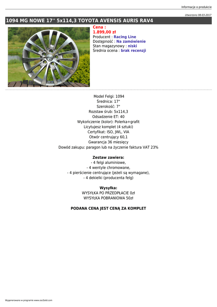 1094 MG NOWE 17`` 5x114,3 TOYOTA AVENSIS AURIS RAV4