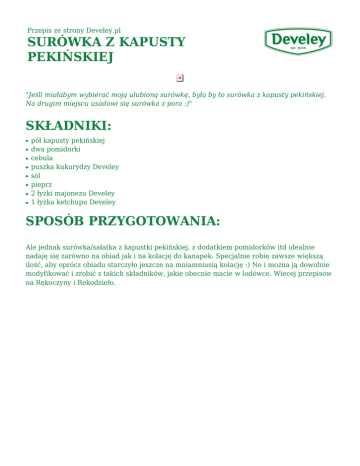 Przepis ze strony Develey.pl SURÓWKA Z KAPUSTY PEKIŃSKIEJ "Jeśli miałabym wybierać moją ulubioną surówkę, była by to surówka z kapusty pekińskiej. Na drugim miejscu usadowi się surówka z pora :)" SKŁADNIKI: ● ● ● ● ● ● ● ● pół kapusty pekińskiej dwa pomidorki cebula puszka kukurydzy Develey sól pieprz 2 łyżki majonezu Develey 1 łyżka ketchupu Develey SPOSÓB PRZYGOTOWANIA: Ale jednak surówka/sałatka z kapustki pekińskiej, z dodatkiem pomidorków itd idealnie nadaję się zarówno na obiad jak i na kolację do kanapek. Specjalnie robię zawsze większą ilość, aby oprócz obiadu starczyło jeszcze na mniamniusią kolację :) No i można ją dowolnie modyfikować i zrobić z takich składników, jakie obecnie macie w lodówce. Wiecej przepisow na Rękoczyny i Rekodzieło.