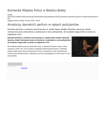 Komenda Miejska Policji w Bielsku-Białej Źródło: http://www.bielsko.slaska.policja.gov.pl/ka2/informacje/wiadomosci/5123,Amatorzy-damskich-perfum-w-rekach-policjantow.h tml Wygenerowano: Środa, 8 marca 2017, 16:15 Amatorzy damskich perfum w rękach policjantów Damskie perfumy o wartości ponad tysiąca zł. padły łupem dwójki rabusiów. Sprawcy zostali zatrzymani przez ochroniarzy i przekazani w ręce policjantów. Za kradzież mogą trafić za kraty na najbliższe 5 lat. Damskie perfumy o wartości ponad tysiąca zł. padły łupem dwójki rabusiów. Sprawcy zostali zatrzymani przez ochroniarzy i przekazani w ręce policjantów. Za kradzież mogą trafić za kraty na najbliższe 5 lat. Do kradzieży doszło wczoraj w perfumerii przy ul. Bohaterów Monte Cassino. Dwaj tyszanie w wieku 19 i 20 lat skradli ze sklepowej półki damskie perfumy. Złodzieje zostali szybko ujęci przez pracowników ochrony i przekazani w ręce mundurowych. Trafili do policyjnego aresztu. Usłyszeli już zarzuty przestępstwa, za które grozi im do 5 lat więzienia. Ocena: 0/5 (0) Tweetnij
