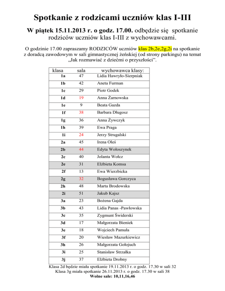Spotkanie z rodzicami uczniów klas I-III W piątek 15.11.2013 r. o godz. 17.00. odbędzie się spotkanie rodziców uczniów klas I-III z wychowawcami. O godzinie 17.00 zapraszamy RODZICÓW uczniów klas 2b,2e,2g,2i na spotkanie z doradcą zawodowym w sali gimnastycznej żeńskiej (od strony parkingu) na temat „Jak rozmawiać z dziećmi o przyszłości”. klasa sala wychowawca klasy: 1a 47 Lidia Hawryło-Sierpniak 1b 42 Aneta Furman 1c 29 Piotr Godek 1d 19 Anna Żarnowska 1e 9 Beata Gazda 1f 38 Barbara Długosz 1g 36 Anna Żywczyk 1h 39 Ewa Praga 1i 24 Jerzy Strugalski 2a 45 Irena Oleś 2b 44 Edyta Wołoszynek 2c 40 Jolanta Wołcz 2e 31 Elżbieta Komsa 2f 13 Ewa Wierzbicka 2g 32 Bogusława Gorczyca 2h 48 Marta Brodowska 2i 51 Jakub Kajsz 3a 23 Bożena Gajda 3b 43 Lidia Panas -Pawłowska 3c 35 Zygmunt Świderski 3d 17 Małgorzata Bieniek 3e 18 Wojciech Pamuła 3f 20 Wiesław Mazurkiewicz 3h 26 Małgorzata Gołojuch 3i 25 Stanisław Strzałka 3j 37 Elżbieta Drobny Klasa 2d będzie miała spotkanie 19.11.2013 r. o godz. 17.30 w sali 32 Klasa 3g miała spotkanie 26.11.2013 r. o godz. 17.30 w sali 38 Wolne sale: 10,11,16,46 Lidia Hawryło-Sierpniak Aneta Furman Piotr Godek Anna Żarnowska Beata Gazda Barbara Długosz Anna Żywczyk Ewa Praga Jerzy Strugalski aszica.