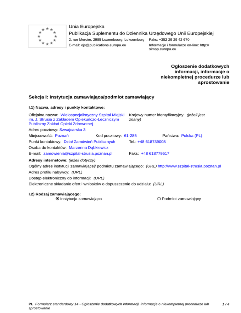 Unia Europejska Publikacja Suplementu do Dziennika Urzędowego Unii Europejskiej 2, rue Mercier, 2985 Luxembourg, Luksemburg Faks: +352 29 29 42 670 E-mail: [email protected] Informacje i formularze on-line: http:// simap.europa.eu Ogłoszenie dodatkowych informacji, informacje o niekompletnej procedurze lub sprostowanie Sekcja I: Instytucja zamawiająca/podmiot zamawiający I.1) Nazwa, adresy i punkty kontaktowe: Oficjalna nazwa: Wielospecjalistyczny Szpital Miejski im. J. Strusia z Zakładem Opiekuńczo-Leczniczym Publiczny Zakład Opieki Zdrowotnej Krajowy numer identyfikacyjny: (jeżeli jest znany) _____ Adres pocztowy: Szwajcarska 3 Miejscowość: Poznań Kod pocztowy: 61-285 Punkt kontaktowy: Dział Zamówień Publicznych Państwo: Polska (PL) Tel.: +48 618739008 Osoba do kontaktów: Marzenna Dąbkiewicz E-mail: [email protected] Faks: +48 618779517 Adresy internetowe: (jeżeli dotyczy) Ogólny adres instytucji zamawiającej/ podmiotu zamawiającego: (URL) http://www.szpital-strusia.poznan.pl Adres profilu nabywcy: (URL) _____ Dostęp elektroniczny do informacji: (URL) _____ Elektroniczne składanie ofert i wniosków o dopuszczenie do udziału: (URL) _____ I.2) Rodzaj zamawiającego: Instytucja zamawiająca Podmiot zamawiający PL Formularz standardowy 14 - Ogłoszenie dodatkowych informacji, informacje o niekompletnej procedurze lub sprostowanie 1/4 Sekcja II: Przedmiot zamówienia II.1.1) Nazwa nadana zamówieniu: Dostawa endoprotez stawu kolanowego, biodrowego, barkowego dla potrzeb Wielospecjalistycznego Szpitala Miejskiego im. J. Strusia w Poznaniu II.1.2) Krótki opis zamówienia lub zakupu: (podano w pierwotnym ogłoszeniu) Przedmiot zamówienia stanowi dostawa endoprotez stawu kolanowego, biodrowego i barkowego, w asortymencie i ilościach wyszczególnionych w załączonym do niniejszej specyfikacji formularzu ofertowym. Przedmiot zamówienia został podzielony na 6 pakietów (części) Przedmiot zamówienia obejmuje również: a) dostawę endoprotez objętych zamówieniem, przez wykonawcę, do Apteki Zakładowej szpitala przy ul. Szwajcarskiej 3 w Poznaniu transportem własnym lub zorganizowanym we własnym zakresie na własny koszt i ryzyko b) użyczenie zamawiającemu na czas trwania umowy, po jednym kompletnym instrumentarium dla każdego rodzaju endoprotez, będących przedmiotem zamówienia w pakietach 1-6, dla wykonywania zabiegów operacyjnych przy użyciu przedmiotu zamówienia wraz z nieodpłatnym serwisem i nieodpłatną wymianą uszkodzonych elementów; Po wygaśnięciu umowy zamawiający zwróci wykonawcy użyczone instrumentaria w stanie niepogorszonym, z uwzględnieniem normalnego zużycia. c) oddanie zamawiającemu w depozyt po dwie kompletne „linie” endoprotez objętych zamówieniem w pakietach 1-6, do wykorzystania wg bieżących potrzeb. „Linia” obejmuje pełen zestaw elementów poszczególnych systemów z uwzględnieniem wszystkich oferowanych/wymaganych rozmiarów i przez okres trwania umowy jest niezmienna ilościowo. Każde zwiększenie ilościowe „linii” bez uzgodnienia i akceptacji Apteki Zakładowej skutkować będzie odesłaniem asortymentu do Wykonawcy. Zamawiający zapłaci za każdy element przedmiotu zamówienia zaimplantowany pacjentowi, na podstawie kopii raportów lub protokołów zużycia po przeprowadzonych zabiegach operacyjnych. Raporty/protokóły, które Zamawiający przekaże Wykonawcy muszą być opatrzone pieczęcią Apteki Zakładowej Zamawiającego i stanowić będą podstawę wystawienia faktury oraz do uzupełnienia wykorzystanego elementu „linii” w terminie nie dłuższym niż 3 dni robocze od daty otrzymania raportu/protokółu. Uzupełnienie „linii” na podstawie niepodpisanego i bez pieczęci Apteki Zakładowej raportu/ protokółu skutkować będzie odesłaniem sprzętu do wykonawcy. d) Instrumentarium oraz kompletne „linie” implantów oddawanych Zamawiającemu w depozyt należy dostarczyć do Apteki Zakładowej w terminie 7 dni od zawarcia umowy, gdzie w obecności przedstawicieli Wykonawcy i Zamawiającego zostanie sporządzony protokół przekazania sprzętu. Protokół musi być podpisany czytelnie i opatrzony pieczątką Apteki Zakładowej. Zamawiający nie bierze odpowiedzialności za dostarczony sprzęt w inne miejsce niż Apteka Zakładowa, nie potwierdzone protokółem podpisanym przez przedstawiciela Apteki. e) Zamawiający będzie dokonywał przy udziale Wykonawcy kontrolnego spisu „linii”, sprzętu znajdującego się na Bloku Operacyjnym nie rzadziej, niż co 3 miesiące. Końcowa liczba poszczególnych pozycji stanu bieżącego nie może przekroczyć liczby wynikającej z protokółu przekazania „linii”. f) Wykonawca winien zapewnić bezpłatne szkolenia w zakresie oferowanego przedmiotu zamówienia w terminie uprzednio uzgodnionym z Zamawiającym, zakończone protokołem szkolenia II.1.3) Wspólny Słownik Zamówień (CPV) Główny przedmiot Słownik główny 33183200 Słownik uzupełniający (jeżeli dotyczy) PL Formularz standardowy 14 - Ogłoszenie dodatkowych informacji, informacje o niekompletnej procedurze lub sprostowanie 2/4 Sekcja IV: Procedura IV.1)Rodzaj procedury (podano w pierwotnym ogłoszeniu) Otwarta Ograniczona Ograniczona przyspieszona Negocjacyjna Negocjacyjna przyspieszona Dialog konkurencyjny Negocjacyjna z uprzednim ogłoszeniem Negocjacyjna bez uprzedniego ogłoszenia Negocjacyjna z publikacją ogłoszenia o zamówieniu Negocjacyjna bez publikacji ogłoszenia o zamówieniu Udzielenie zamówienia bez uprzedniej publikacji ogłoszenia o zamówieniu w Dzienniku Urzędowym Unii Europejskiej IV.2)Informacje administracyjne IV.2.1)Numer referencyjny: (podano w pierwotnym ogłoszeniu) WSM/DZP/381/34/N/2016 IV.2.2)Dane referencyjne ogłoszenia w przypadku ogłoszeń przesłanych drogą elektroniczną: Pierwotne ogłoszenie przesłane przez eNotices TED eSender Login: ENOTICES_marzenna Dane referencyjne ogłoszenia: 2016-007903 rok i numer dokumentu IV.2.3)Ogłosze