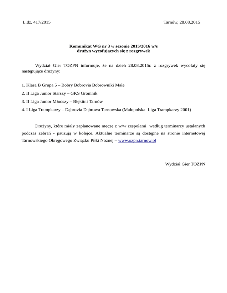 L.dz. 417/2015 Tarnów, 28.08.2015 Komunikat WG nr 3 w sezonie 2015/2016 w/s drużyn wycofujących się z rozgrywek Wydział Gier TOZPN informuje, że na dzień 28.08.2015r. z rozgrywek wycofały się następujące drużyny: 1. Klasa B Grupa 5 – Bobry Bobrovia Bobrowniki Małe 2. II Liga Junior Starszy – GKS Gromnik 3. II Liga Junior Młodszy – Błękitni Tarnów 4. I Liga Trampkarzy – Dąbrovia Dąbrowa Tarnowska (Małopolska Liga Trampkarzy 2001) Drużyny, które miały zaplanowane mecze z w/w zespołami według terminarzy ustalanych podczas zebrań - pauzują w kolejce. Aktualne terminarze są dostępne na stronie internetowej Tarnowskiego Okręgowego Związku Piłki Nożnej – www.ozpn.tarnow.pl Wydział Gier TOZPN