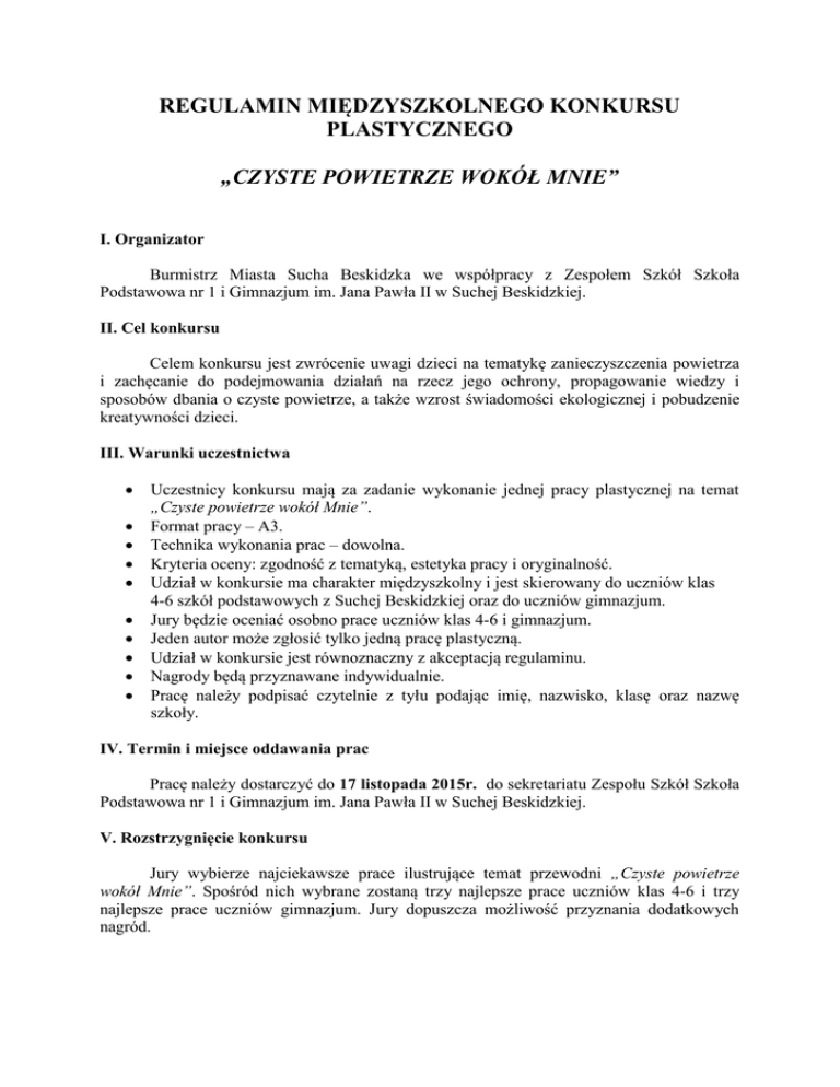 REGULAMIN MIĘDZYSZKOLNEGO KONKURSU PLASTYCZNEGO „CZYSTE POWIETRZE WOKÓŁ MNIE” I. Organizator Burmistrz Miasta Sucha Beskidzka we współpracy z Zespołem Szkół Szkoła Podstawowa nr 1 i Gimnazjum im. Jana Pawła II w Suchej Beskidzkiej. II. Cel konkursu Celem konkursu jest zwrócenie uwagi dzieci na tematykę zanieczyszczenia powietrza i zachęcanie do podejmowania działań na rzecz jego ochrony, propagowanie wiedzy i sposobów dbania o czyste powietrze, a także wzrost świadomości ekologicznej i pobudzenie kreatywności dzieci. III. Warunki uczestnictwa Uczestnicy konkursu mają za zadanie wykonanie jednej pracy plastycznej na temat „Czyste powietrze wokół Mnie”. Format pracy – A3. Technika wykonania prac – dowolna. Kryteria oceny: zgodność z tematyką, estetyka pracy i oryginalność. Udział w konkursie ma charakter międzyszkolny i jest skierowany do uczniów klas 4-6 szkół podstawowych z Suchej Beskidzkiej oraz do uczniów gimnazjum. Jury będzie oceniać osobno prace uczniów klas 4-6 i gimnazjum. Jeden autor może zgłosić tylko jedną pracę plastyczną. Udział w konkursie jest równoznaczny z akceptacją regulaminu. Nagrody będą przyznawane indywidualnie. Pracę należy podpisać czytelnie z tyłu podając imię, nazwisko, klasę oraz nazwę szkoły. IV. Termin i miejsce oddawania prac Pracę należy dostarczyć do 17 listopada 2015r. do sekretariatu Zespołu Szkół Szkoła Podstawowa nr 1 i Gimnazjum im. Jana Pawła II w Suchej Beskidzkiej. V. Rozstrzygnięcie konkursu Jury wybierze najciekawsze prace ilustrujące temat przewodni „Czyste powietrze wokół Mnie”. Spośród nich wybrane zostaną trzy najlepsze prace uczniów klas 4-6 i trzy najlepsze prace uczniów gimnazjum. Jury dopuszcza możliwość przyznania dodatkowych nagród. VI. Ogłoszenie wyników konkursu Rozdanie nagród będzie miało miejsce 20 listopada 2015r. w Zespole Szkół Szkoła Podstawowa nr 1 i Gimnazjum im. Jana Pawła II w Suchej Beskidzkiej. VII. Publikacja prac Wybrane przez jury prace umieszczone zostaną na wystawie. Nagrodzone prace mogą zostać wykorzystane do wykonania plakatu, który będzie rozwieszony w środowisku lokalnym. Z chwilą nadesłania prace przechodzą na własność Organizatora. Udział w konkursie jest jednoznaczny z wyrażeniem zgody na bezpłatne wykorzystywania nadesłanych prac konkursowych w ramach działalności Organizatora. VIII. Uwagi dodatkowe • • • • Prace niezgodne z regulaminem nie będą brane pod uwagę. Rozstrzygnięcie jury jest ostateczne (od werdyktu nie przysługuje odwołanie). Nagrodzeni uczniowie zostaną powiadomione za pośrednictwem swojej szkoły o godzinie uroczystego rozdania nagród. Wszelkie sprawy nie uwzględnione w regulaminie rozstrzyga Organizator. IX. Kontakt Pani Magdalena Matysiak – kierownik Referatu Gospodarki Komunalnej i Ochrony Środowiska, Panie Magdalena Świerkosz i Anna Ostruszka - Waryło – nauczycielki z Zespołu Szkół Szkoła Podstawowa nr 1 i Gimnazjum im. Jana Pawła II.