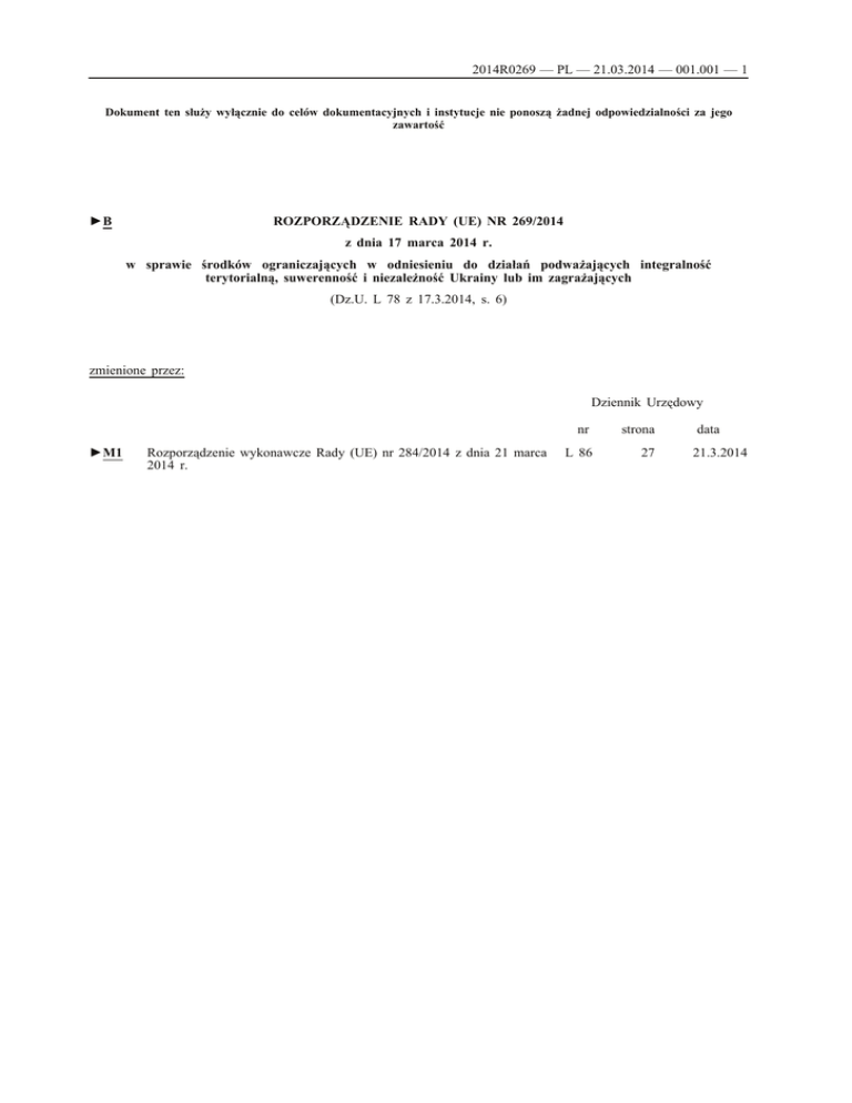 2014R0269 — PL — 21.03.2014 — 001.001 — 1 Dokument ten służy wyłącznie do celów dokumentacyjnych i instytucje nie ponoszą żadnej odpowiedzialności za jego zawartość ROZPORZĄDZENIE RADY (UE) NR 269/2014 ►B z dnia 17 marca 2014 r. w sprawie środków ograniczających w odniesieniu do działań podważających integralność terytorialną, suwerenność i niezależność Ukrainy lub im zagrażających (Dz.U. L 78 z 17.3.2014, s. 6) zmienione przez: Dziennik Urzędowy ►M1 Rozporządzenie wykonawcze Rady (UE) nr 284/2014 z dnia 21 marca 2014 r. nr strona L 86 27 data 21.3.2014 2014R0269 — PL — 21.03.2014 — 001.001 — 2 ▼B ROZPORZĄDZENIE RADY (UE) NR 269/2014 z dnia 17 marca 2014 r. w sprawie środków ograniczających w odniesieniu do działań podważających integralność terytorialną, suwerenność i niezależność Ukrainy lub im zagrażających RADA UNII EUROPEJSKIEJ, uwzględniając Traktat o funkcjonowaniu Unii Europejskiej, w szczegól ności jego art. 215, uwzględniając decyzję Rady 2014/145/WPZiB z dnia 17 marca 2014 r. w sprawie środków ograniczających w związku z działaniami podważa jącymi integralność terytorialną, suwerenność i niezależność Ukrainy lub im zagrażającymi (1), uwzględniając wspólny wniosek Wysokiego Przedstawiciela Unii do Spraw Zagranicznych i Polityki Bezpieczeństwa oraz Komisji Europej skiej, a także mając na uwadze, co następuje: (1) W dniu 6 marca 2014 r. szefowie państw lub rządów państw członkowskich Unii stanowczo potępili niesprowokowane pogwałcenie przez Federację Rosyjską suwerenności i integral ności terytorialnej Ukrainy i wezwali Federację Rosyjską do natychmiastowego wycofania swoich sił zbrojnych do miejsc ich stałego stacjonowania zgodnie ze stosownymi umowami. Wezwali Federację Rosyjską do umożliwienia międzynarodowym obserwatorom natychmiastowego dostępu. Szefowie państw lub rządów uznali, że decyzja Rady Najwyższej Autonomicznej Republiki Krymu o przeprowadzeniu referendum w sprawie przy szłego statusu tego terytorium jest sprzeczna z konstytucją Ukrainy i w związku z tym – nielegalna. (2) Szefowie państw lub rządów postanowili podjąć działania, w tym te przewidziane przez Radę w dniu 3 marca 2014 r., a w szcze gólności zawiesić rozmowy dwustronne z Federacją Rosyjską w kwestiach wizowych, a także rozmowy z Federacją Rosyjską w sprawie nowej, kompleksowej umowy, która zastąpi obecną umowę o partnerstwie i współpracy. (3) Szefowie państw i rządów podkreślili, że rozwiązanie kryzysu należy znaleźć w drodze negocjacji między rządami Ukrainy i Federacji Rosyjskiej, w tym przy wykorzystaniu ewentualnych mechanizmów wielostronnych, oraz że przy braku rezultatów w bliskim terminie Unia postanowi o dodatkowych środkach, takich jak zakaz podróżowania, zamrożenie aktywów oraz odwo łanie szczytu UE – Rosja. (4) W dniu 17 marca 2014 r. Rada przyjęła decyzję 2014/145/WPZiB, w której przewidziano ograniczenia dotyczące podróżowania oraz zamrożenie środków finansowych i zasobów gospodarczych niektórych osób odpowiedzialnych za działania (1) Zob. s. 16 niniejszego Dziennika Urzędowego. 2014R0269 — PL — 21.03.2014 — 001.001 — 3 ▼B podważające integralność terytorialną, suwerenność i niezależność Ukrainy lub im zagrażające, w tym działania dotyczące przy szłego statusu dowolnej części jej terytorium, które są sprzeczne z konstytucją Ukrainy, oraz osób fizycznych lub prawnych, podmiotów lub organów z nimi powiązanych. Osoby fizyczne lub prawne, podmioty i organy, o których mowa, zostały wymie nione w załączniku do tej decyzji. (5) Niektóre z tych środków objęte są zakresem stosowania Traktatu, zatem do ich wdrożenia niezbędne jest działanie regulacyjne na szczeblu unijnym, w szczególności, aby zapewnić jednolite stoso wanie tych środków we wszystkich państwach członkowskich. (6) Niniejsze rozporządzenie nie narusza praw podstawowych i jest zgodne z zasadami określonymi w szczególności w Karcie praw podstawowych Unii Europejskiej, a w szczególności z prawem do skutecznego środka prawnego i dostępu do bezstronnego sądu oraz z prawem do ochrony danych osobowych. Niniejsze rozporządzenie powinno być stosowane z uwzględnieniem tych praw i zasad. (7) Uprawnienie do zmiany wykazu znajdującego się w załączniku I do niniejszego rozporządzenia powinno być wykonywane przez Radę ze względu na poważną sytuację polityczną na Ukrainie oraz w celu zapewnienia spójności z procedurą zmian i dokony wania przeglądu załącznika do decyzji 2014/145/WPZiB. (8) Procedura zmiany wykazu znajdującego się w załączniku I do niniejszego rozporządzenia powinna obejmować powiadomienie osób fizycznych lub prawnych, podmiotów lub organów o powo dach umieszczenia ich w wykazie, tak by umożliwić im zgło szenie uwag. W przypadku gdy zostaną zgłoszone uwagi lub przedstawione istotne nowe dowody, Rada powinna dokonać weryfikacji swojej decyzji w świetle tych uwag i poinformować odpowiednio daną osobę, dany podmiot lub dany organ. (9) Na potrzeby wdrożenia niniejszego rozporządzenia oraz w celu zagwarantowania jak największej pewności prawa w Unii nazwiska i inne istotne dane dotyczące osób fizycznych i praw nych, podmiotów i organów, których środki finansowe i zasoby gospodarcze powinny zostać zamrożone zgodnie z niniejszym rozporządzeniem, powinny zostać podane do wiadomości publicznej. Wszelkie operacje przetwarzania danych osobowych powinny odbywać się zgodnie z rozporządzeniem Parlamentu Europejskiego i Rady (WE) nr 45/2001 (1) i dyrektywą Parla mentu Europejskiego i Rady 95/46/WE (2). (10) W celu zapewnienia skuteczności środków przewidzianych w niniejszym rozporządzeniu, powinno ono wejść w życie w trybie natychmiastowym, (1) Rozporządzenie (WE) nr 45/2001 Parlamentu Europejskiego i Rady z dnia 18 grudnia 2000 r. o ochronie