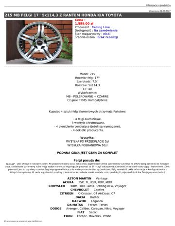 Informacje o produkcie Utworzono 08-03-2017 215 MB FELGI 17'' 5x114,3 Z RANTEM HONDA KIA TOYOTA Cena : 1.899,00 zł Producent : Racing Line Dostępność : Na zamówienie Stan magazynowy : niski Średnia ocena : brak recenzji Model: 215 Rozmiar felg: 17'' Szerokość: 7.5'' Rozstaw: 5x114.3 ET: 40 Wykończenie: MB - POLEROWANE + CZARNE Czujniki TPMS: Kompatybilne Kupując 4 sztuki felg aluminiowych otrzymają Państwo: - 4 felgi aluminiowe, - 4 wentyle chromowane, - 4 pierścienie centrujące (jeżeli są wymagane), - 4 dekielki producenta. Wysyłka: WYSYŁKA PO PRZEDPŁACIE 0zł WYSYŁKA POBRANIOWA 50zł PODANA CENA JEST CENĄ ZA KOMPLET Felgi pasują do: (pasują* - jeśli chodzi o rozstaw szpilek. Po podaniu modelu auta, roku prod, pojemności silnika sprawdzimy czy felgi na 100% będą pasować do Twojego auta. Dodatkowe parametry które mają wpływ na to czy felga będzie pasować to ET - czyli odsadzenie, szerokość oraz otwór centrujący. Warunkiem 100% pewności jest to czy dany rozmiar felgi występował fabrycznie w danym aucie lub czy producenci felg zamieścili takie informacje w konfiguratorach z których korzystamy. W razie wątpliwości prosimy o kontakt oraz podanie marki, modelu, roku produkcji i pojemności silnika Twojego samochodu.) ASTON MARTIN Vantage ACURA TSX, TL, RSX, RDX, MDX CHRYSLER 300M, 300C 4WD, Sebring new, Voyager CHEVROLET Captiva CITROEN C-Crosser, C4 AirCross, C7 DACIA Duster DAEWOO Leganza DAIHATSU Feroza, Terios DODGE Avenger, Caliber, Caravan, Nitro, Voyager FIAT Sedici FORD Escape, Maverick, Probe Wygenerowano w programie www.oscGold.com HONDA Accord (>03), Accord Coupe (>98) + Type R, Civic, Civic Sport (>04) + TypeR, Civic Tourer (2014-), CR-V, CR-Z, HR-V, FR-V, Integra Type-R, NSX, S200, Odyssey, Prelude (4WS, BB6, BB8) (97-02), Shuttle, Stream HYUNDAI Coupe Tiburon (>02), Elantra, Genesis Coupe, Grandeur, I30, I30 Coupe, I40, IX20, IX35, IX35 Facelift, IX55, Santa Fe, Grand Santa Fe, Sonata new, Trajet, Tucson, XG25/XG30, Veloster INFINITI FX35, FX45, EX35, G35, G37, I30, M35, M45, Q45, Q50 JEEP Grand Cherokee (92-99), Patriot, Compass KIA Carnival, Carens, Ceed, Ceed SW, Magentis new, Opirus, Optima, Pro Ceed, Sedeona, Soul, Sorento II (09-), Sorento III, Sprotage II, Sportage III, Venga LANCIA Flavia LAND ROVER Freelander LEXUS GS 300/430 (>98), IS 200/300 (>98), IS250, IS220d, LS 400, LS 430, RX300, SC 430 MAZDA 3, 5, 6, CX5, CX7, CX9, 323 F (>00), 626 (97-03), MPV, MX-6, Premacy, RX8, Tribute, Xedos 6, Xedos 9 MITSUBISHI ASX, Eclipse (D20, D30), Grandis, Lancer neu, Outlander, Pajero Pinin, Sigma, Space Gear NISSAN 200SX (97-00), 350Z, Almera Tino, Altima, e-NV200, Juke, Maxima (95-00), Maxima QX (>00), Murano, Primera (02-), Qashqai, Primastar (15-), Pulsar, X-Trail, Opel Antara, Cascada, Sintra, Vivaro B PEUGEOT 4007, 4008, RENAULT Fluence, Koleos, Laguna III, Latitute, Megane III(cabrio), Scenic III, Grand Scenic III, Trafic III SUBARU Impreza STI, Tribeca SUZUKI Grand Vitara new, Kizashi, Swift Sport, SX 4 TOYOTA Auris, Auris Touring Sports, Avensis Verso, Camry (>96), Corolla Verso new, Hiace, Picnic (XM1), Previa, Prius+, RAV4, Supra, Verso Zgodnie z Kodeksem PWP art.156 ust 3, emblematy widoczne na felgach mają charakter wyłącznie informacyjny i nie należy się tym sugerować, że jest to produkt oryginalny danego producenta samochodu. Alufelgi dobieramy wg parametrów katalogowych producentów. W przypadku niektórych modeli aut lub felg zachodzi konieczność zastosowania dystansów, śrub/nakrętek ampułkowych. Ponieważ, zawsze może zajść taka sytuacja w której katalog/konfigurator wprowadzi w błąd sprzedawcę zaleca się przed montażem opon przyłożyć felgę na piastę i sprawdzić czy felga nigdzie nie będzie obcierać. Po założeniu opon zwrot felg będzie nie możliwy.