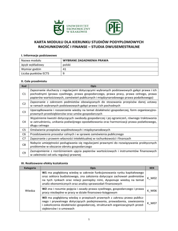 KARTA MODUŁU DLA KIERUNKU STUDIÓW PODYPLOMOWYCH RACHUNKOWOŚĆ I FINANSE – STUDIA DWUSEMESTRALNE I. Informacje podstawowe Nazwa modułu Język wykładowy Wymiar godzin Liczba punktów ECTS WYBRANE ZAGADNIENIA PRAWA polski 41 9 II. Cele przedmiotu Kod C1 C2 C3 C4 C5 C6 C7 C8 C9 Opis Zapoznanie słuchaczy z regulacjami dotyczącymi wybranych podstawowych gałęzi prawa i ich pochodnymi (prawa cywilnego, prawa gospodarczego, prawa pracy, prawa celnego, prawa papierów wartościowych, zamówień publicznych i międzynarodowego prawa podatkowego) Zapoznanie z zakresem podmiotów obowiązanych do stosowania przepisów danej ustawy w ramach wybranych podstawowych gałęzi prawa i ich pochodnych Uporządkowanie i rozszerzenie wiedzy na temat działalności gospodarczej, form organizacyjnoprawnych przedsiębiorców oraz umów gospodarczych Wyjaśnienie kwestii dotyczących swobody gospodarczej i jej ograniczeń, równego traktowania w zatrudnieniu, unikania podwójnego opodatkowania oraz harmonizacji prawa podatkowego, długu celnego Omówienie przepisów wspólnotowych i międzynarodowych Przedstawienie procedur celnych i w sprawie zamówienia publicznego Zapoznanie z prawem własności intelektualnej w rachunkowości i finansach Nabycie umiejętności posługiwania się regulacjami prawnymi do rozwiązywania praktycznych problemów w obszarze obrotu gospodarczego Zaznajomienie z rozróżnieniem ujęcia papierów wartościowych i instrumentów finansowych w zależności od celu regulacji prawnej III. Realizowane efekty kształcenia Kategoria Opis KEK W1 ma pogłębioną wiedzę w zakresie funkcjonowania rynku kapitałowego oraz sektora budżetowego, zna założenia dotyczące zachowań podmiotów K_W02 na tych rynkach oraz relacji pomiędzy nimi, dysponuje wiedzą na temat analiz ekonomicznych oraz analizy sprawozdań finansowych Wiedza W2 zna i rozumie pojęcia i zasady prawa cywilnego, gospodarczego i prawa K_W06 pracy niezbędne w pracy w dziale finansowo-księgowym W3 ma pogłębioną wiedzę o przepisach prawnych z zakresu prawa publicznego i prywatnego dotyczących podejmowania, prowadzenia, zawieszenia K_W07 i zakończenia działalności gospodarczej, strukturach organizacyjnych przedsiębiorców i o umowach 1 W4 ma pogłębioną wiedzę o przepisach dotyczących obowiązkowych danin K_W08 publicznych Wiedza W5 ma pogłębioną wiedze o zasadach prawa własności przemysłowej i prawa autorskiego, oraz zasady przenoszenia, udostępniania, dysponowania K_W09 oraz zasady ochrony własności intelektualnej w rachunkowości i finansach W6 ma rozszerzoną wiedzę o celach, narzędziach polityki finansowej państwa (monetarnej, fiskalnej, walutowej) w wymiarze krajowym i ponadna- K_W12 rodowym Umiejętności U1 potrafi posługiwać się systemami normatywnymi, normami i regułami (prawnymi, zawodowymi, etycznymi) w celu rozwiązywania konkretnych problemów z zakresu ukończonych studiów podyplomowych K_U02 U2 potrafi ustalić wysokość zobowiązań publiczno-prawnych K_U04 U3 potrafi uczyć się samodzielnie, analizować obowiązujące akty prawne i ma umiejętność wykorzystania zdobytej wiedzy przy podejmowaniu decyzji wywierających wpływ na sytuacje majątkową, finansową oraz wynik finansowy jednostki K_U06 U4 sprawnie posługuje się przepisami prawnymi w celu rozwiązania konkretnego problemu dotyczącego finansów i rachunkowości K_U07 K1 prawidłowo identyfikuje i rozstrzyga problemy związane z wykonywaniem zawodu księgowego, audytora oraz biegłego rewidenta K_K01 K2 umie uczestniczyć w przygotowaniu projektów ekonomiczno-finansowych, przeprowadzaniu analiz i wykorzystaniu ich dla celów zarządczych oraz potrafi przewidywać skutki społeczne i ekonomiczne swojej działalności K_K02 K3 potrafi samodzielnie i krytycznie uzupełniać wiedzę i umiejętności, rozszerzone o wymiar interdyscyplinarny, w szczególności w zakresie nowelizacji Kompetencje obowiązujących krajowych przepisów prawnych oraz harmonizacji i standaryzacji przepisów międzynarodowych społeczne K4 potrafi wykorzystać wiedzę w zakresie indywidualnej przedsiębiorczości, zwłaszcza dotycząca możliwych form prowadzenia działalności gospodarczej oraz związanych z tym możliwości prowadzenia ewidencji księgowej K_K04 K5 ma świadomość ekonomicznych i etycznych konsekwencji uchylania się od opodatkowania lub unikania obciążeń publiczno-prawnych K_K06 K6 rozumie potrzebę zdobywania wiedzy prawniczej związanej z problematyką finansów i rachunkowości K_K07 IV. Sposoby oceny Lp. 1 2 K_K03 Opis Egzamin testowy Egzamin ustny 2 V. Macierz realizacji modułu Lp. Przedmioty wchodzące w skład modułu Wymiar godzin Punkty ECTS Cele kształcenia Efekty kształcenia 1 Elementy prawa cywilnego 5 1 C1, C2, C3, C7, C8 K_W06, K_W07, K_W09, K_U02, K_U06, K_U07, K_K03, K_K04, K_K07 2 Prawo gospodarcze 10 2 C1, C2, C3, C4, C8 K_W06, K_W07, K_U06, K_U07, K_K03, K_K04, K_K07 3 Elementy prawa pracy 5 1 C1, C2 C3, C4, C8 K_W06, K_U02, K_U06, K_K01, K_K04, K_K07 4 Prawo celne 4 1 C1, C2, C4, C5, C6, C8 K_W08, K_W12, K_U02, K_U04, K_U06, K_K03, K_K04, K_K06 5 Prawo papierów wartościowych 5 1 C1, C2, C8, C9 K_W02, K_W06, K_U02, K_U07, K_K03, K_K07 6 Międzynarodowe prawo podatkowe 6 1 C1, C2, C4, C5, C8 K_W06, K_W08, K_U02, K_U06, K_U07, K_K01, K_K03, K_K07 7 Zamówienia publiczne 6 2 C1, C2, C6, C8 K_W02, K_W06, K_W07, K_U02, K_U06, K_U07, K_K02, K_K03, K_K07 3 VI. Kryteria oceny Uzyskanie przez Słuchacza pozytywnej oceny końcowej z modułu możliwe jest w przypadku zrealizowania wszystkich efektów kształcenia w stopniu co najmniej dostatecznym. 4