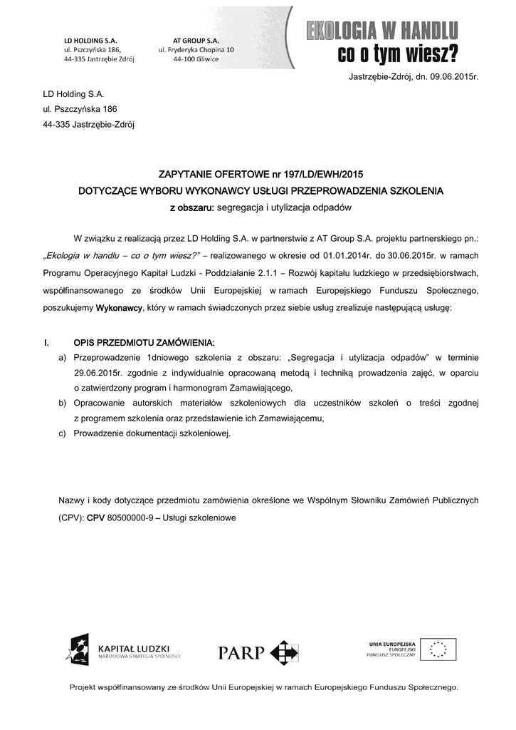Jastrzębie-Zdrój, dn. 09.06.2015r. LD Holding S.A. ul. Pszczyńska 186 44-335 Jastrzębie-Zdrój ZAPYTANIE OFERTOWE nr 197/LD/EWH/2015 DOTYCZĄCE WYBORU WYKONAWCY USŁUGI PRZEPROWADZENIA SZKOLENIA z obszaru: segregacja i utylizacja odpadów W związku z realizacją przez LD Holding S.A. w partnerstwie z AT Group S.A. projektu partnerskiego pn.: „Ekologia w handlu – co o tym wiesz?” – realizowanego w okresie od 01.01.2014r. do 30.06.2015r. w ramach Programu Operacyjnego Kapitał Ludzki - Poddziałanie 2.1.1 – Rozwój kapitału ludzkiego w przedsiębiorstwach, współfinansowanego ze środków Unii Europejskiej w ramach Europejskiego Funduszu Społecznego, poszukujemy Wykonawcy, który w ramach świadczonych przez siebie usług zrealizuje następującą usługę: I. OPIS PRZEDMIOTU ZAMÓWIENIA: a) Przeprowadzenie 1dniowego szkolenia z obszaru: „Segregacja i utylizacja odpadów” w terminie 29.06.2015r. zgodnie z indywidualnie opracowaną metodą i techniką prowadzenia zajęć, w oparciu o zatwierdzony program i harmonogram Zamawiającego, b) Opracowanie autorskich materiałów szkoleniowych dla uczestników szkoleń o treści zgodnej z programem szkolenia oraz przedstawienie ich Zamawiającemu, c) Prowadzenie dokumentacji szkoleniowej. Nazwy i kody dotyczące przedmiotu zamówienia określone we Wspólnym Słowniku Zamówień Publicznych (CPV): CPV 80500000-9 – Usługi szkoleniowe Wymagania dotyczące osoby trenera: 1) Doświadczenie w prowadzeniu szkoleń dla właścicieli i pracowników placówek handlu detalicznego – minimum 50 godzin lekcyjnych 2) Znajomość zasad dot. rodzajów i utylizacji odpadów w sklepie – opracowanie zasad gospodarowania odpadami w sklepie lub doradztwo w tym zakresie dla minimum 2 placówek handlu detalicznego 3) Doświadczenie w prowadzeniu zajęć (modułów) z zakresu segregacji i utylizacji odpadów – minimum 70 godzin lekcyjnych 4) Umiejętność analizy dokumentów księgowych dotyczących odpadów, oraz umów z odbiorcami 5) Znajomość podstawowych przepisów Krajowych i Unijnych dotyczących ochrony środowiska oraz gospodarowania odpadami. Wymagania dotyczące realizacji usługi: 1. Szkolenia skierowane są do właścicieli i pracowników firm handlowych z sektora mikro, małych i średnich przedsiębiorstw i organizowane są w ramach projektu „Ekologia w handlu – co o tym wiesz?”, którego celem jest zwiększenie świadomości i wdrożenie rozwiązań proekologicznych 120 przedsiębiorstw poprzez zwiększenie wiedzy i umiejętności pracowników w zakresie gospodarowania energią elektryczną, cieplną i odpadami. Grupa szkoleniowa liczy średnio 6 os. 2. Szkolenie odbędzie się w woj. śląskim – Jastrzębie-Zdrój. Dokładny adres zostanie przekazany Wykonawcy na 3 dni przed planowanym terminem szkolenia. 3. Czas trwania szkolenia wynosi 8 godzin lekcyjnych. 4. Zamawiający ze zgłoszonych ofert utworzy listę rankingową. Usługa zostanie zlecona Wykonawcy, który zajmie na niej pierwsze miejsce. 5. Materiały szkoleniowe w wersji elektronicznej (wzorzec do powielenia) powinny być przygotowane najpóźniej na 3 dni przed realizacją usługi i przekazane do Zamawiającego celem weryfikacji ich zgodności z programem szkolenia i celami projektu. Materiały szkoleniowe muszą być przygotowane zgodnie ze wzorem zatwierdzonym przez PARP, który wybrany Wykonawca otrzyma od Zamawiającego. Zamawiający dokona na swój koszt powielenia materiałów szkoleniowych odpowiednio do liczby uczestników szkolenia. 6. Zamawiający zapewni trenerowi salę szkoleniową wyposażoną w rzutnik multimedialny, Flip-chart, flamastry, notesy i przybory do pisania dla uczestników. 7. Zamawiający nie zapewnia dla trenera laptopa podczas szkoleń. 8. Zamawiający gwarantuje trenerowi wyżywienie podczas trwania zajęć (lunch i przerwy kawowe). 9. Z wybranym Wykonawcą Zamawiający podpisze umowę. Przed podpisaniem umowy Wykonawca, jeśli zażąda tego Zamawiający, będzie zobowiązany dostarczyć dokumenty, które potwierdzają jego wykształcenie i doświadczenie zawodowe opisane w Formularzu ofertowym. Zamawiający może odstąpić od podpisania umowy w przypadku niedostarczenia przez Oferenta powyższych dokumentów. 10. Płatność za wykonaną usługę zostanie zrealizowana na podstawie faktury/rachunku wystawionego przez Wykonawcę po zrealizowaniu usługi, zgodnie z terminem płatności wskazanym przez Wykonawcę w formularzu oferty, pod warunkiem dostępności środków na wyodrębnionym dla projektu rachunku bankowym. II. TERMIN REALIZACJI ZAMÓWIENIA: 29.06.2015r. III. ZAMAWIAJĄCY: LD Holding S.A. 44-335 Jastrzębie-Zdrój ul. Pszczyńska 186 IV. OFERTA POWINNA ZAWIERAĆ: 1. Cenę brutto za przeprowadzenie 1 edycji szkolenia (8 godz. lekcyjnych), termin płatności oraz informacje o trenerze, wskazane w wypełnionym formularzu (Załącznik nr 1). Cena brutto obejmuje całość usługi – w tym również przygotowanie materiałów szkoleniowych oraz dojazd na szkolenie 2. CV trenera wraz z klauzulą „Wyrażam zgodę na przetwarzanie moich danych osobowych dla potrzeb projektu „Ekologia w handlu – co o tym wiesz?” (zgodnie z Ustawą z dnia 29.08.1997 roku o Ochronie Danych Osobowych; tekst jednolity: Dz. U. z 2002r. Nr 101, poz. 926 ze zm.).” 3. Oświadczenie o braku powiązań kapitałowych lub osobowych między Wykonawcą a zamawiającym (Załącznik nr 2) 4. Program szkolenia wg wzoru (Załącznik nr 3) zawierający m.in. poniższe zagadnienia: Obszar tematyczny którego dotyczy oferta 3. Segregacja i utylizacja odpadów V. 1. Konieczne zagadnienia Ochrona środowiska, przepisy prawne, decyzje administracyjne w zakresie ochrony środowiska i gospodarki odpadami, ewidencja i sprawozdawczość odpadowa, opłaty środowiskowe. Forma szkolenia ZAKRES PODSTAWOWY KRYTERIA OCENY OFERT: Kryterium ceny: Cena brutto za przeprowadzenie 1 edycji szkolenia (8 godzin lekcyjnych) - 50% (maksymalna liczba punktów jakie może