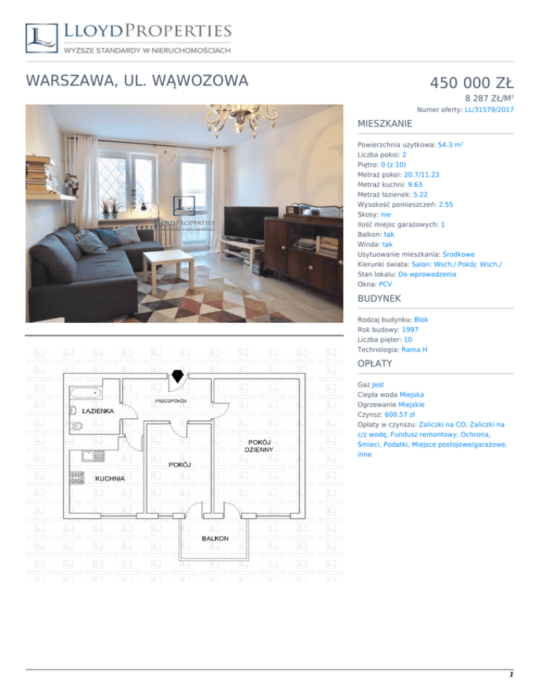 WARSZAWA, UL. WĄWOZOWA 450 000 ZŁ 8 287 ZŁ/M2 Numer oferty: LL/31579/2017 MIESZKANIE Powierzchnia użytkowa: 54.3 m2 Liczba pokoi: 2 Piętro: 0 (z 10) Metraż pokoi: 20.7/11.23 Metraż kuchni: 9.63 Metraż łazienek: 5.22 Wysokość pomieszczeń: 2.55 Skosy: nie Ilość miejsc garażowych: 1 Balkon: tak Winda: tak Usytuowanie mieszkania: Środkowe Kierunki świata: Salon: Wsch./ Pokój: Wsch./ Stan lokalu: Do wprowadzenia Okna: PCV BUDYNEK Rodzaj budynku: Blok Rok budowy: 1997 Liczba pięter: 10 Technologia: Rama H OPŁATY Gaz Jest Ciepła woda Miejska Ogrzewanie Miejskie Czynsz: 600.57 zł Opłaty w czynszu: Zaliczki na CO, Zaliczki na c/z wodę, Fundusz remontowy, Ochrona, Śmieci, Podatki, Miejsce postojowe/garażowe, inne 1 Michał Ebert Property Advisor +48 533 340 316 [email protected] OPIS Prezentowane mieszkanie o powierzchni 54,3 m2 składa się z dwóch pokojów (20,70 i 11,23 m2), odzielnej i widnej kuchni (9,63 m2), łazienki (5,22 m2), oraz przedpokoju i balkonu (6 m2). W 2016 roku wymieniane były okna i drzwi. Mieszkanie jest gotowe do wprowadzenia, ustawne ze względu na rokład i widne dzięki wchodniej ekspozycji okien. Do mieszkania przynależy miejsce postojowe naziemne. Forma własności - spółdzielcze własnościowe prawo do lokalu z założoną Księgą Wieczystą. Osiedle, na którym znajduje się mieszkanie, oddalone jest od stacji metra Kabaty o cztery minut spacerem, w bliskim sąsiedztwie Lasu Kabackiego i całodobowego supermarketu Tesco. Osiedle, na którym znajduje się budynek, jest ogrodzone i strzeżone przez ochronę, mieszkanie jest więc całkowicie bezpieczne. W bezpośredniej okolicy szkoły i przedszkola, liczne punkty usługowe (pralnia, biuro podróży, apteka), sklepy (m.in. warzywniak, cukiernia, winiarnia) oraz bary i restauracje. Budynek wybudowany w technologii Rama H w 1996 roku, ocieplony, poddawany regularnym remontom i bardzo zadbany. Na terenie zamkniętego osiedla znajduje się bardzo duże patio. Blok położony jest na terenie z nieuregulowanym prawem własności (możliwy zakup wyłącznie za gotówkę). 2