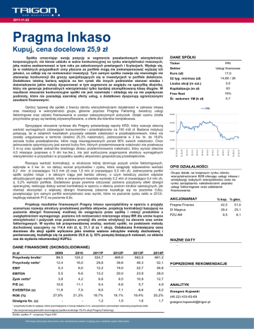 2011-11-23 Pragma Inkaso Kupuj, cena docelowa 25,9 zł Spółka umacniając swoją pozycję w segmencie pozabankowych wierzytelności korporacyjnych, nie bierze udziału w walce konkurencyjnej na rynku wierzytelności masowych, jaką można zaobserwować w tym roku po zakończonych przetargach i licytacjach. Wydaje się, że w niektórych przypadkach ceny płacone za portfele mogą nie zrekompensować wyższej ich jakości, co odbije się na rentowności inwestycji. Tym samym spółka rozwija się równolegle nie stanowiąc konkurencji dla graczy specjalizujących się w inwestycjach w portfele detaliczne. Dodatkowo istotną barierą wejścia na ten rynek dla innych podmiotów stanowi wiedza i doświadczenie jakim należy dysponować w tym segmencie ze względu na specyfikę dłużnika, który nie generuje jednorodnych wierzytelności tylko bardziej skomplikowaną klasę długów. W rezultacie otoczenie konkurencyjne spółki nie jest rozwinięte i składają się na nie pojedyncze podmioty, które nie posiadają szerokiej oferty usług, a dodatkowo dysponują ograniczonymi zasobami finansowymi. Oprócz typowej dla spółek z branży obrotu wierzytelnościami działalności w zakresie inkasa oraz inwestycji w wierzytelności grupa, głównie poprzez Pragmę Faktoring, świadczy usługi faktoringowe oraz udziela finansowania w postaci zabezpieczonych pożyczek. Dzięki czemu źródła przychodów grupy są bardziej zdywersyfikowane, a oferta dla klientów kompleksowa. DANE SPÓŁKI Ticker PRI Sektor Usługi finansowe 17,0 Kurs (zł) 52 tyg. min/max (zł) 14,66 / 26 Liczba akcji (m szt.) 3,0 63 Kapitalizacja (m zł) 19% Free float 0,7 Śr. wolumen 1M (k zł) PRI 30,00 25,00 Rosnąca wartość kontraktacji, w strukturze której dominuje pozysk umów faktoringowych, wpłynęła w 3 kw. br. na dalszy wzrost przychodów i zysku, które osiągnęły odpowiednio wartość 8,2 mln zł (narastająco 14,5 mln zł) oraz 1,8 mln zł (narastająco 5,0 mln zł). Jednocześnie portfel spółki szybko rotuje i w dalszym ciągu jest bardzo zdrowy, o czym świadczy poziom odpisów aktualizujących jego wartość, które w omawianym kwartale wyniosły 0,2 mln zł (narastająco 0,4 mln zł), tj. 0,2% wartości portfela. Dodatkowo grupa powinna odczuwać zarówno pozytywny efekt dźwigni operacyjnej, realizując dalszy wzrost kontraktacji w oparciu o obecny poziom struktur operacyjnych, jak również skorzystać z większej dźwigni finansowej (obecnie kształtuje się na poziomie 0,8x), powiększając tym samym portfel wierzytelności oraz wyniki, które na poziomie zysku netto w 2012r. implikują wskaźnik P/ E na poziomie 6,6x. Projekcję rezultatów finansowych Pragmy Inkaso sporządziliśmy w oparciu o przyjęty scenariusz rozwoju struktury produktowej portfela aktywów, projekcję kontraktacji bazującej na poziomie dźwigni finansowej możliwej do osiągnięcia przez spółkę i rotacji produktów z uwzględnieniem wymaganego poziomu ich rentowności mierzonego stopą IRR dla umów kupna wierzytelności i pożyczek oraz poziomu prowizji dla umów windykacji na zlecenie oraz umów faktoringowych. W wyniku tak przeprowadzonej analizy, wartość spółki, na podstawie metody dochodowej szacujemy na 114,4 mln zł, tj. 31,1 zł za 1 akcję. Ostateczna 9-miesięczna cena docelowa dla akcji spółki wyliczona jako średnia ważona odczytów metody dochodowej i porównawczej, kształtuje się na poziomie 25,9 zł, tj. 53% powyżej bieżących notowań, co skłania nas do wydania rekomendacji KUPUJ. 20,00 15,00 m zł Przychody brutto¹ 2009 88,0 2010 124,2 2011P 324,7 2012P 469,0 2013P 562,5 2014P 661,2 Przychody netto¹ 12,4 16,0 29,8 39,6 46,3 52,1 EBIT 5,3 6,0 12,2 19,0 22,7 26,8 EBITDA 5,5 6,6 13,2 20,0 23,9 28,0 AKCJONARIAT 25,1 9,5 8,1 PZU AM WAŻNE DATY POPRZEDNIE REKOMENDACJE - 4,2 6,6 9,5 10,9 12,7 9,4 6,6 5,7 4,9 ANALITYK EV/EBITDA (x) 11,8 7,5 9,0 7,1 6,6 6,2 Grzegorz Kujawski 27,8% 21,3% 18,7% 19,1% 19,4% 20,2% - - 1,2 1,5 1,6 1,7 ² dla akcjonariuszy jednostki dominującej (spółka kontroluje 79,4% akcji Pragmy Faktoring) Informacje dotyczące dokumentu oraz zastrzeżenia prawne znajdują się w ostatniej części dokumentu. 22-11-11 51,0 29,4 11,1 Źródło: spółka, P - prognozy Trigon DM 22-9-11 42,5 DI Magnus 3,8 ¹ przychody brutto to wpływy, które pomniejszone o kwoty należne m.in. wierzycielom pierwotnym stanowią przychody netto 22-10-11 22-8-11 22-7-11 % kap. % głos. Pragma Finanse 10,6 Dźwignia fin. (x) 22-6-11 Grupa działa na krajowym rynku obrotu wierzytelnościami B2B oferując usługi inkasa i windykację nabytych wierzytelności oraz na rynku zarządzania należnościami poprzez usługi faktoringowe oraz udzielanie finansowania. P/E (x) ROE (%) 22-5-11 OPIS DZIAŁALNOŚCI - DANE FINANSOWE (SKONSOLIDOWANE) Zysk netto² 22-4-11 22-3-11 22-2-11 22-1-11 22-12-10 10,00 22-11-10 Sprzyjające otoczenie rynkowe dla Pragmy potwierdzają raporty KRD, który szacuje obecną wartość wymagalnych zobowiązań konsumentów i przedsiębiorstw na 100 mld zł. Badania instytucji pokazują, że w ostatnich kwartałach przyrasta odsetek należności w przedsiębiorstwach, które nie zostały uregulowane w terminie (średnio 25,3% należności). Jednocześnie w 3 kw. br. do 18,6% wzrosła liczba przedsiębiorstw, które mają nieuregulowanych ponad 50% swoich należności. Choć jednocześnie optymistyczny jest wzrost liczby firm, których przeterminowanie należności nie przekracza 3 m-cy oraz spadek wskaźnika średniego okresu przeterminowania należności, który wynosi obecnie 4,0 miesiące (poprawa o 9 dni kw./kw.), nie jest wykluczone pogorszenie struktury wymagalnych wierzytelności w przyszłości w przypadku spadku aktywności gospodarczej przedsiębiorstw. (48 22) 433-83-69 [email protected] Pragma Inkaso Wycena Wycena DCF Wartość Pragmy Inkaso na podstawie metody dochodowej szacujemy na 114,4 mln zł, tj. 31,1 zł za jedną akcję. Model DCF został sporządzony przy zachowaniu p