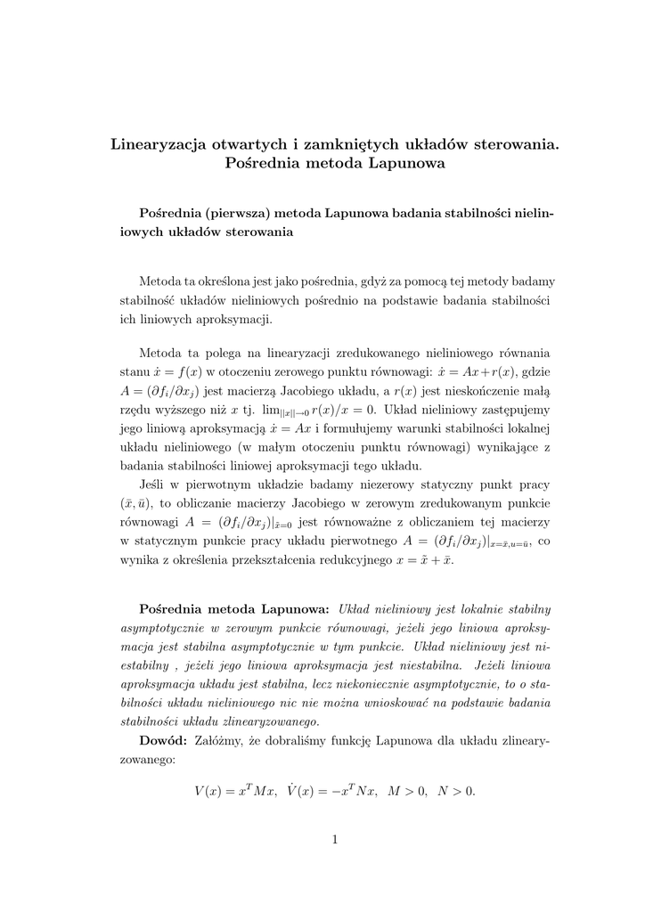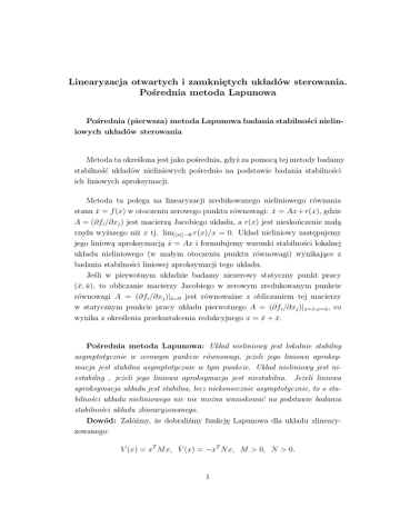 Linearyzacja otwartych i zamkniȩtych ukÃladów sterowania. Pośrednia metoda Lapunowa Pośrednia (pierwsza) metoda Lapunowa badania stabilności nieliniowych ukÃladów sterowania Metoda ta określona jest jako pośrednia, gdyż za pomoca̧ tej metody badamy stabilność ukÃladów nieliniowych pośrednio na podstawie badania stabilności ich liniowych aproksymacji. Metoda ta polega na linearyzacji zredukowanego nieliniowego równania stanu ẋ = f (x) w otoczeniu zerowego punktu równowagi: ẋ = Ax + r(x), gdzie A = (∂fi /∂xj ) jest macierza̧ Jacobiego ukÃladu, a r(x) jest nieskończenie maÃla̧ rzȩdu wyższego niż x tj. lim||x||→0 r(x)/x = 0. UkÃlad nieliniowy zastȩpujemy jego liniowa̧ aproksymacja̧ ẋ = Ax i formuÃlujemy warunki stabilności lokalnej ukÃladu nieliniowego (w maÃlym otoczeniu punktu równowagi) wynikaja̧ce z badania stabilności liniowej aproksymacji tego ukÃladu. Jeśli w pierwotnym ukÃladzie badamy niezerowy statyczny punkt pracy (x̄, ū), to obliczanie macierzy Jacobiego w zerowym zredukowanym punkcie równowagi A = (∂fi /∂xj )|x̃=0 jest równoważne z obliczaniem tej macierzy w statycznym punkcie pracy ukÃladu pierwotnego A = (∂fi /∂xj )|x=x̄,u=ū , co wynika z określenia przeksztaÃlcenia redukcyjnego x = x̃ + x̄. Pośrednia metoda Lapunowa: UkÃlad nieliniowy jest lokalnie stabilny asymptotycznie w zerowym punkcie równowagi, jeżeli jego liniowa aproksymacja jest stabilna asymptotycznie w tym punkcie. UkÃlad nieliniowy jest niestabilny , jeżeli jego liniowa aproksymacja jest niestabilna. Jeżeli liniowa aproksymacja ukÃladu jest stabilna, lecz niekoniecznie asymptotycznie, to o stabilności ukÃladu nieliniowego nic nie można wnioskować na podstawie badania stabilności ukÃladu zlinearyzowanego. Dowód: ZaÃlóżmy, że dobraliśmy funkcjȩ Lapunowa dla ukÃladu zlinearyzowanego: V (x) = xT M x, V̇ (x) = −xT N x, M > 0, N > 0. 1 Uwzglȩdniamy resztȩ z liniowej aproksymacji V̇ (x) = xT (A + r(x))T M + M (A + r(x)) = xT (AT M + M A)x + xT (rT M + M r(x))x = −xT N x + 2r(x)x. Dla maÃlych x wyrażenie 2r(x)x jest maÃle w porównaniu z wyrażeniem x N x i o znaku wyrażenia V̇ (x) decyduje czÃlon −xT N x. Ponieważ jest on ujemny, wiȩc ukÃlad nieliniowy jest lokalnie asymptotycznie stabilny (lokalnie w obszarze, w którym ||2r(x)x|| < ||xT N x||. Podobnie dla dodatniego wyrażenia −xT N x (ukÃlad zlinearyzowany jest niestabilny) o znaku pochodnej V̇ (x) decyduje lokalnie dodatnie wyrażenie −xT N x a zatem ukÃlad nieliniowy jest niestabilny w maÃlym otoczeniu punktu równowagi. Jeżeli liniowa aproksymacja ukÃladu jest stabilna, lecz niekoniecznie asymptotycznie, to wyrażenie −xT N x może przyjmować niezerowe wartości dla stanów niezerowych i o znaku wyrażenia −xT N x + 2r(x)x nic nie można powiedzieć. PrzykÃlad: Proces mieszania substancji prowadzony jest w mieszalniku, do którego doprowadzany jest strumień substancji o dużym stȩżeniu skÃladnika użytecznego c1 z natȩżeniem u1 (t) oraz strumień substancji o maÃlym stȩżeniu skÃladnika użytecznego c2 z natȩżeniem u2 (t). Wyróżniaja̧c w charakterze zmiennych stanu zapeÃlnienie mieszalnika x1 (t) w chwili t oraz ilość substancji użytecznej x2 (t) w mieszalniku w chwili t można równania stanu procesu przedstawić w postaci T ẋ1 (t) = u1 (t) + u2 (t) − αx0.5 1 (t), ẋ2 (t) = c1 u1 (t) + c2 u2 (t) − αx2 (t)/x0.5 1 (t). ZakÃladamy,że proces prowadzony jest w statycznym punkcie pracy ukÃladu speÃlniaja̧cym równania 0 = ū1 + ū2 − αx̄10.5 , 0 = c1 ū1 + c2 ū2 − αx̄2 /x̄0.5 1 . Linearyzujemy ukÃlad sterowania obliczaja̧c macierz Jacobiego w statycznym punkcie pracy ∂f1 (x̄, ū)/∂x1 = − α , ∂f1 (x̄, ū)/∂x2 = 0, 2x̄0.5 1 2 ∂f2 (x̄, ū)/∂x1 = Tak wiȩc A= − 2x̄α0.5 1 αx̄2 3/2 2x̄1 αx̄2 3/2 2x̄1 , ∂f2 (x̄, ū)/∂x2 = − α . x̄0.5 1 s + 2x̄α0.5 0 1 , sI − A = 2 − x̄α0.5 − αx̄3/2 s + x̄α0.5 0 2x̄1 1 1 i α α )(s + 0.5 ). 0.5 2x̄1 x̄1 Wartości wÃlasne ukÃladu zlinearyzowanego s1 = − 2x̄α0.5 i s2 = − x̄α0.5 leża̧ 1 1 w lewej póÃlpÃlaszczyźnie zmiennej zespolonej, a zatem ukÃlad zlinearyzowany jest asymptotycznie stabilny dla dowolnych dodatnich wartości parametru α. Oznacza to, że ukÃlad nieliniowy jest lokalnie asymtotycznie stabilny dla dowolnych dodatnich wartości parametru α. PrzykÃlad: Chemiczny proces produkcyjny A + B− > C polegaja̧cy na syntezie substancji użytecznej C ze skÃladników surowcowych A i B opisywany jest za pomoca̧ równań stanu det(sI − A) = (s + ẋ1 (t) = u1 (t) − x1 (t) − x1 (t)xα2 (t), ẋ2 (t) = u2 (t) − x2 (t) − xβ1 (t)x2 (t). ZakÃladamy, że proces prowadzony jest w statycznym punkcie pracy ukÃladu (x̄1 , x̄2 ) = (1, 1) wymuszanym przez statyczne sterowanie (ū1 , ū2 ) = (2, 2). Równania punktu pracy ukÃladu przybieraja̧ postać 0 = ū1 − x̄1 − x̄1 x̄α2 , 0 = ū2 − x̄2 − x̄β1 x̄2 . Linearyzujemy ukÃlad sterowania obliczaja̧c macierz Jacobiego w statycznym punkcie pracy ∂f1 (x̄, ū)/∂x1 = −1 − x̄α2 = −2, ∂f1 (x̄, ū)/∂x2 = −x̄1 αx̄α−1 = −α, 2 ∂f2 (x̄, ū)/∂x1 = −β x̄β−1 x̄2 , ∂f2 (x̄, ū)/∂x2 = −1 − x̄β1 = −2. 1 Tak wiȩc à A= ! à ! −2 −α s+2 α , sI − A = −β −2 β s+2 3 i det(sI − A) = (s + 2)2 − αβ = s2 + 4s + 4 − αβ. Stosuja̧c kryterium Hurwitza stabilności ukÃladów liniowych uzyskujemy warunek stabilności parametrycznej αβ < 4. Dla poprawy wÃlasności stabilnościowych procesu wprowadzamy sprzȩżenie zwrotne u1 (t) = ū1 − κ1 (x1 (t) − x̄1 ), u2 (t) = ū2 − κ2 (x2 (t) − x̄2 ), gdzie κ1 i κ2 sa̧ dodatnimi wspóÃlczynnikami sprzȩżenia zwrotnego Jeśli stȩżenie skÃladnika xi jest wiȩksze od zadanego poziomu, to sprzȩżenie zwrotne zapewni jego zmniejszenie, jeśli zaś stȩżenie to jest mniejsze od zadanego poziomu, to sprzȩżenie zwrotne z