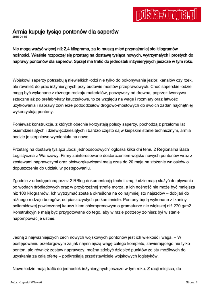 Armia kupuje tysiąc pontonów dla saperów 2015-04-15 Nie mogą ważyć więcej niż 2,4 kilograma, za to muszą mieć przynajmniej sto kilogramów nośności. Właśnie rozpoczął się przetarg na dostawę tysiąca nowych, wytrzymałych i prostych do naprawy pontonów dla saperów. Sprzęt ma trafić do jednostek inżynieryjnych jeszcze w tym roku. Wojskowi saperzy potrzebują niewielkich łodzi nie tylko do pokonywania jezior, kanałów czy rzek, ale również do prac inżynieryjnych przy budowie mostów przeprawowych. Choć saperskie łodzie mogą być wykonane z różnego rodzaju materiałów, począwszy od drewna, poprzez tworzywa sztuczne aż po prefabrykaty kauczukowe, to ze względu na wagę i rozmiary oraz łatwość użytkowania i naprawy żołnierze pododdziałów drogowo-mostowych do swoich zadań najchętniej wykorzystują pontony. Ponieważ konstrukcje, z których obecnie korzystają polscy saperzy, pochodzą z przełomu lat osiemdziesiątych i dziewięćdziesiątych i bardzo często są w kiepskim stanie technicznym, armia będzie je stopniowo wymieniała na nowe. Przetarg na dostawę tysiąca „łodzi jednoosobowych” ogłosiła kilka dni temu 2 Regionalna Baza Logistyczna z Warszawy. Firmy zainteresowane dostarczeniem wojsku nowych pontonów wraz z zestawami naprawczymi oraz płetworękawicami mają czas do 20 maja na złożenie wniosków o dopuszczenie do udziału w postępowaniu. Zgodnie z udostępnioną przez 2 RBlog dokumentacją techniczną, łodzie mają służyć do pływania po wodach śródlądowych oraz w przybrzeżnej strefie morza, a ich nośność nie może być mniejsza niż 100 kilogramów. Ich wytrzymać została określona na co najmniej sto najazdów – dobijań do różnego rodzaju brzegów, od piaszczystych po kamieniste. Pontony będą wykonane z tkaniny poliamidowej powleczonej kauczukiem chloroprenowym o gramaturze nie większej niż 270 g/m2. Konstrukcyjnie mają być przygotowane do tego, aby w razie potrzeby żołnierz był w stanie napompować je ustnie. Jedną z najważniejszych cech nowych wojskowych pontonów jest ich wielkość i waga. – W postępowaniu przetargowym za jak najmniejszą wagę całego kompletu, zawierającego nie tylko ponton, ale również zestaw naprawczy, można zdobyć dziesięć punktów ze stu możliwych do uzyskania za całą ofertę – podkreślają przedstawiciele wojskowych logistyków. Nowe łodzie mają trafić do jednostek inżynieryjnych jeszcze w tym roku. Z racji miejsca, do Autor: Krzysztof Wilewski Strona: 1 którego zdobywca wartego kilkaset tysięcy złotych kontraktu będzie musiał je dostarczyć, czyli do składu w Dęblinie, można przypuszczać, że jako pierwsi zostaną w nie wyposażeni saperzy z batalionu drogowo-mostowego z tego miasta. Autor: Krzysztof Wilewski Strona: 2