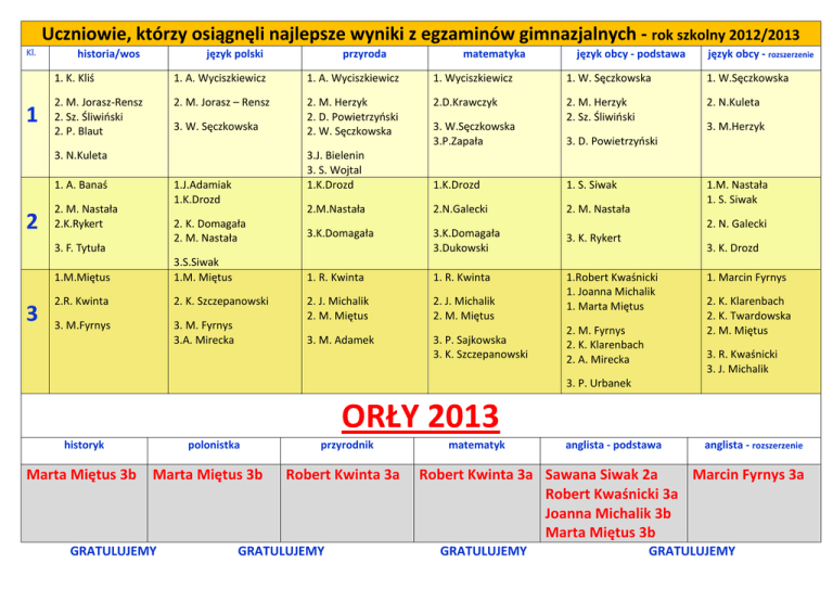Uczniowie, którzy osiągnęli najlepsze wyniki z egzaminów gimnazjalnych - rok szkolny 2012/2013 Kl. 1 historia/wos język polski język obcy - podstawa język obcy - rozszerzenie 1. A. Wyciszkiewicz 1. A. Wyciszkiewicz 1. Wyciszkiewicz 1. W. Sęczkowska 1. W.Sęczkowska 2. M. Jorasz-Rensz 2. Sz. Śliwiński 2. P. Blaut 2. M. Jorasz – Rensz 2. M. Herzyk 2. D. Powietrzyński 2. W. Sęczkowska 2.D.Krawczyk 2. M. Herzyk 2. Sz. Śliwiński 2. N.Kuleta 3. W. Sęczkowska 3. W.Sęczkowska 3.P.Zapała 3. M.Herzyk 3. D. Powietrzyński 3.J. Bielenin 3. S. Wojtal 1.K.Drozd 1.K.Drozd 1. S. Siwak 2.M.Nastała 2.N.Galecki 2. M. Nastała 2. K. Domagała 2. M. Nastała 3.K.Domagała 3.K.Domagała 3.Dukowski 3. K. Rykert 1.M.Miętus 3.S.Siwak 1.M. Miętus 1. R. Kwinta 1. R. Kwinta 2.R. Kwinta 2. K. Szczepanowski 3. M.Fyrnys 3. M. Fyrnys 3.A. Mirecka 2. J. Michalik 2. M. Miętus 2. J. Michalik 2. M. Miętus 1.Robert Kwaśnicki 1. Joanna Michalik 1. Marta Miętus 3. M. Adamek 3. P. Sajkowska 3. K. Szczepanowski 1. A. Banaś 1.J.Adamiak 1.K.Drozd 2. M. Nastała 2.K.Rykert 3. F. Tytuła 3 matematyka 1. K. Kliś 3. N.Kuleta 2 przyroda 1.M. Nastała 1. S. Siwak 2. N. Galecki 3. K. Drozd 2. M. Fyrnys 2. K. Klarenbach 2. A. Mirecka 1. Marcin Fyrnys 2. K. Klarenbach 2. K. Twardowska 2. M. Miętus 3. R. Kwaśnicki 3. J. Michalik 3. P. Urbanek ORŁY 2013 historyk Marta Miętus 3b polonistka Marta Miętus 3b GRATULUJEMY przyrodnik Robert Kwinta 3a GRATULUJEMY matematyk anglista - podstawa anglista - rozszerzenie Robert Kwinta 3a Sawana Siwak 2a Marcin Fyrnys 3a Robert Kwaśnicki 3a Joanna Michalik 3b Marta Miętus 3b GRATULUJEMY GRATULUJEMY