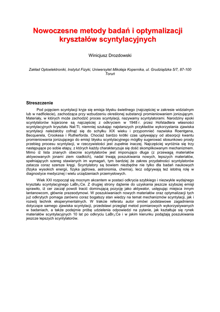 Nowoczesne metody badań i optymalizacji kryształów scyntylacyjnych Winicjusz Drozdowski Zakład Optoelektroniki, Instytut Fizyki, Uniwersytet Mikołaja Kopernika, ul. Grudziądzka 5/7, 87-100 Toruń Streszczenie Pod pojęciem scyntylacji kryje się emisja błysku świetlnego (najczęściej w zakresie widzialnym lub w nadfiolecie), zachodząca przy wzbudzeniu określonej substancji promieniowaniem jonizującym. Materiały, w których może zachodzić proces scyntylacji, nazywamy scyntylatorami. Narodziny epoki scyntylatorów kojarzone są najczęściej z odkryciem w 1948 r. przez Hofstadtera własności scyntylacyjnych kryształu NaI:Tl, niemniej szukając najstarszych przykładów wykorzystania zjawiska scyntylacji należałoby cofnąć się do schyłku XIX wieku i przypomnieć nazwiska Roentgena, Becquerela, Crookesa i Rutherforda. Chociaż bardzo krótki czas upływający od absorpcji kwantu promieniowania jonizującego do emisji błysku scyntylacyjnego mógłby sugerować stosunkowo prosty przebieg procesu scyntylacji, w rzeczywistości jest zupełnie inaczej. Najczęściej wyróżnia się trzy następujące po sobie etapy, z których każdy charakteryzuje się dość skomplikowanym mechanizmem. Mimo iż lista znanych obecnie scyntylatorów jest imponująco długa (z przewagą materiałów aktywowanych jonami ziem rzadkich), nadal trwają poszukiwania nowych, lepszych materiałów, spełniających szereg stawianych im wymagań, tym bardziej że zakres przydatności scyntylatorów zatacza coraz szersze kręgi. Scyntylatory są bowiem niezbędne nie tylko dla badań naukowych (fizyka wysokich energii, fizyka jądrowa, astronomia, chemia), lecz odgrywają też istotną rolę w diagnostyce medycznej i wielu urządzeniach przemysłowych. Wiek XXI rozpoczął się mocnym akcentem w postaci odkrycia szybkiego i niezwykle wydajnego kryształu scyntylacyjnego LaBr3:Ce. Z drugiej strony dążenie do uzyskania jeszcze szybszej emisji sprawiło, iż cer zaczął powoli tracić dominującą pozycję jako aktywator, ustępując miejsca innym lantanowcom, głównie prazeodymowi. W poszukiwaniach nowych materiałów oraz optymalizacji tych już odkrytych pomaga zarówno coraz bogatszy stan wiedzy na temat mechanizmów scyntylacji, jak i rozwój technik eksperymentalnych. W trakcie referatu autor omówi podstawowe zagadnienia dotyczące samego zjawiska scyntylacji, przedstawi przegląd metod pomiarowych wykorzystywanych w badaniach, a także podejmie próbę udzielenia odpowiedzi na pytanie, jak kształtuje się rynek materiałów scyntylacyjnych 10 lat po odkryciu LaBr3:Ce i w jakim kierunku podążają poszukiwania jeszcze lepszych scyntylatorów.