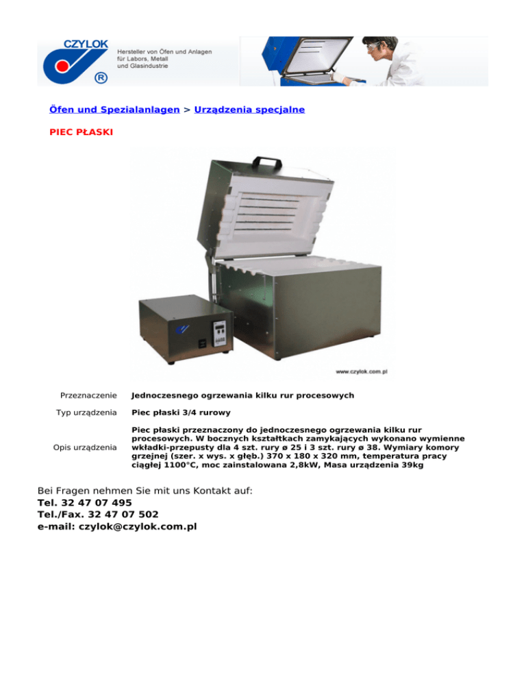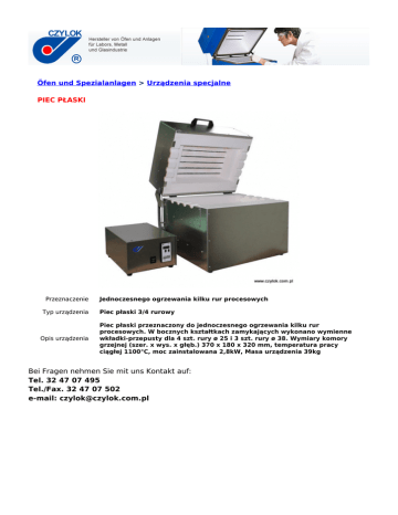 Öfen und Spezialanlagen > Urządzenia specjalne PIEC PŁASKI Przeznaczenie Typ urządzenia Opis urządzenia Jednoczesnego ogrzewania kilku rur procesowych Piec płaski 3/4 rurowy Piec płaski przeznaczony do jednoczesnego ogrzewania kilku rur procesowych. W bocznych kształtkach zamykających wykonano wymienne wkładki-przepusty dla 4 szt. rury ø 25 i 3 szt. rury ø 38. Wymiary komory grzejnej (szer. x wys. x głęb.) 370 x 180 x 320 mm, temperatura pracy ciągłej 1100°C, moc zainstalowana 2,8kW, Masa urządzenia 39kg Bei Fragen nehmen Sie mit uns Kontakt auf: Tel. 32 47 07 495 Tel./Fax. 32 47 07 502 e-mail: [email protected]
