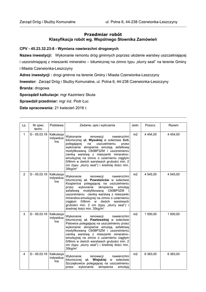 Zarząd Dróg i Służby Komunalne ul. Polna 6, 44-238 Czerwionka-Leszczyny Przedmiar robót Klasyfikacja robót wg. Wspólnego Słownika Zamówień CPV - 45.23.32.23-8 - Wymiana nawierzchni drogowych Nazwa inwestycji: Wykonanie remontu dróg gminnych poprzez ułożenie warstwy uszczelniającej i uszorstniającej z mieszanki mineralno – bitumicznej na zimno typu „slurry seal” na terenie Gminy i Miasta Czerwionka-Leszczyny Adres inwestycji : drogi gminne na terenie Gminy i Miasta Czerwionka-Leszczyny Inwestor: Zarząd Dróg i Służby Komunalne, ul. Polna 6, 44-238 Czerwionka-Leszczyny Branża: drogowa Sporządził kalkulacje: mgr Kazimierz Skuta Sprawdził przedmiar: mgr inż. Piotr Łuc Data opracowania: 21 kwiecień 2016 r. Lp. Nr spec. techn. Podstawa Zadanie, opis i wyliczenia Jedn. Poszcz. Razem 1 D - 05.03.19 Kalkulacja renowacji nawierzchni indywidua Wykonanie bitumicznej ul. Wysokiej w sołectwie Bełk lna polegającej na uszczelnieniu przez wykonanie skropienia emulsją asfaltową modyfikowaną C60BP3ZM i uszorstnieniu cienką warstwą z mieszanki mineralnoemulsyjnej na zimno o uziarnieniu ciągłym 0/8mm w dwóch warstwach grubości min. 2 cm (typu „slurry seal”) i średniej ilości min. 35kg/m2 m2 4 454,00 4 454,00 2 D - 05.03.19 Kalkulacja renowacji nawierzchni indywidua Wykonanie bitumicznej ul. Powstańców w sołectwie lna Książenice polegającej na uszczelnieniu przez wykonanie skropienia emulsją asfaltową modyfikowaną C60BP3ZM i uszorstnieniu cienką warstwą z mieszanki mineralno-emulsyjnej na zimno o uziarnieniu ciągłym 0/8mm w dwóch warstwach grubości min. 2 cm (typu „slurry seal”) i średniej ilości min. 35kg/m 2 m2 4 545,00 4 545,00 3 D - 05.03.19 Kalkulacja renowacji nawierzchni indywidua Wykonanie bitumicznej ul. Pawłowskiej w sołectwie lna Palowice polegającej na uszczelnieniu przez wykonanie skropienia emulsją asfaltową modyfikowaną C60BP3ZM i uszorstnieniu cienką warstwą z mieszanki mineralnoemulsyjnej na zimno o uziarnieniu ciągłym 0/8mm w dwóch warstwach grubości min. 2 cm (typu „slurry seal”) i średniej ilości min. 35kg/m2 m2 1 500,00 1 500,00 4 D - 05.03.19 Kalkulacja renowacji nawierzchni indywidua Wykonanie bitumicznej ul. Wiejskiej w sołectwie lna Szczejkowice polegającej na uszczelnieniu przez wykonanie skropienia emulsją m2 6 363,00 6 363,00 asfaltową modyfikowaną C60BP3ZM i uszorstnieniu cienką warstwą z mieszanki mineralno-emulsyjnej na zimno o uziarnieniu ciągłym 0/8mm w dwóch warstwach grubości min. 2 cm (typu „slurry seal”) i średniej ilości min. 35kg/m 2 5 D - 05.03.19 Kalkulacja renowacji nawierzchni indywidua Wykonanie bitumicznej ul. Powstańców Warszawskich lna w sołectwie Przegędza polegającej na uszczelnieniu przez wykonanie skropienia emulsją asfaltową modyfikowaną C60BP3ZM i uszorstnieniu cienką warstwą z mieszanki mineralno-emulsyjnej na zimno o uziarnieniu ciągłym 0/8mm w dwóch warstwach grubości min. 2 cm (typu „slurry seal”) i średniej ilości min. 35kg/m 2 m2 477,00 477,00 6 D - 05.03.19 Kalkulacja renowacji nawierzchni indywidua Wykonanie bitumicznej ul. Lompy w dzielnicy lna Leszczyny polegającej na uszczelnieniu przez wykonanie skropienia emulsją asfaltową modyfikowaną C60BP3ZM i uszorstnieniu cienką warstwą z mieszanki mineralno-emulsyjnej na zimno o uziarnieniu ciągłym 0/8mm w dwóch warstwach grubości min. 2 cm (typu „slurry seal”) i średniej ilości min. 35kg/m 2 m2 5 386,00 5 386,00 7 D - 05.03.19 Kalkulacja renowacji nawierzchni indywidua Wykonanie bitumicznej ul. Leśna w sołectwie lna Stanowice polegającej na uszczelnieniu przez wykonanie skropienia emulsją asfaltową modyfikowaną C60BP3ZM i uszorstnieniu cienką warstwą z mieszanki mineralno-emulsyjnej na zimno o uziarnieniu ciągłym 0/8mm w dwóch warstwach grubości min. 2 cm (typu „slurry seal”) i średniej ilości min. 35kg/m 2 m2 1 272,00 1 272,00 8 D - 05.03.19 Kalkulacja renowacji nawierzchni indywidua Wykonanie bitumicznej ul. Kruczkowskiego w lna dzielnicy Czerwionka polegającej na uszczelnieniu przez wykonanie skropienia emulsją asfaltową modyfikowaną C60BP3ZM i uszorstnieniu cienką warstwą z mieszanki mineralno-emulsyjnej na zimno o uziarnieniu ciągłym 0/8mm w dwóch warstwach grubości min. 2 cm (typu „slurry seal”) i średniej ilości min. 35kg/m 2 m2 1 772,00 1 772,00 Razem m2 25 769,00 25 769,00 Opracował: Zatwierdził: