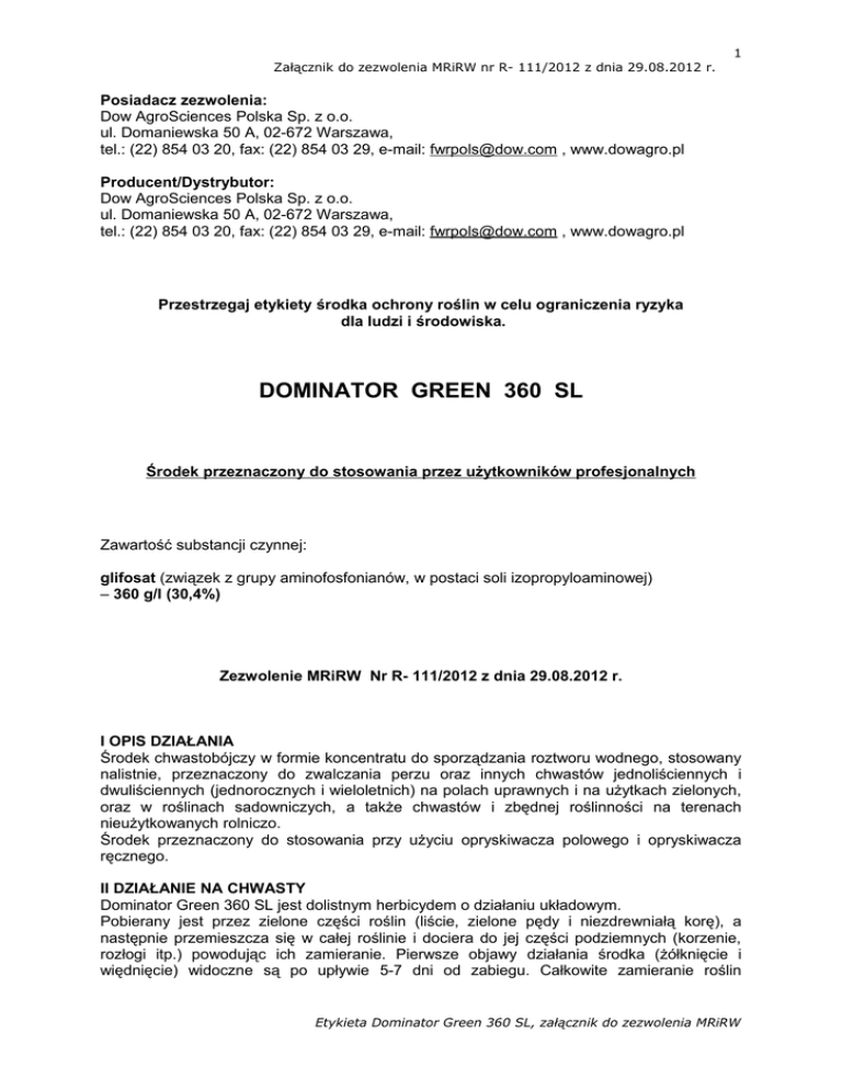 Załącznik do zezwolenia MRiRW nr R- 111/2012 z dnia 29.08.2012 r. 1 Posiadacz zezwolenia: Dow AgroSciences Polska Sp. z o.o. ul. Domaniewska 50 A, 02-672 Warszawa, tel.: (22) 854 03 20, fax: (22) 854 03 29, e-mail: [email protected] , www.dowagro.pl Producent/Dystrybutor: Dow AgroSciences Polska Sp. z o.o. ul. Domaniewska 50 A, 02-672 Warszawa, tel.: (22) 854 03 20, fax: (22) 854 03 29, e-mail: [email protected] , www.dowagro.pl Przestrzegaj etykiety środka ochrony roślin w celu ograniczenia ryzyka dla ludzi i środowiska. DOMINATOR GREEN 360 SL Środek przeznaczony do stosowania przez użytkowników profesjonalnych Zawartość substancji czynnej: glifosat (związek z grupy aminofosfonianów, w postaci soli izopropyloaminowej) – 360 g/l (30,4%) Zezwolenie MRiRW Nr R- 111/2012 z dnia 29.08.2012 r. I OPIS DZIAŁANIA Środek chwastobójczy w formie koncentratu do sporządzania roztworu wodnego, stosowany nalistnie, przeznaczony do zwalczania perzu oraz innych chwastów jednoliściennych i dwuliściennych (jednorocznych i wieloletnich) na polach uprawnych i na użytkach zielonych, oraz w roślinach sadowniczych, a także chwastów i zbędnej roślinności na terenach nieużytkowanych rolniczo. Środek przeznaczony do stosowania przy użyciu opryskiwacza polowego i opryskiwacza ręcznego. II DZIAŁANIE NA CHWASTY Dominator Green 360 SL jest dolistnym herbicydem o działaniu układowym. Pobierany jest przez zielone części roślin (liście, zielone pędy i niezdrewniałą korę), a następnie przemieszcza się w całej roślinie i dociera do jej części podziemnych (korzenie, rozłogi itp.) powodując ich zamieranie. Pierwsze objawy działania środka (żółknięcie i więdnięcie) widoczne są po upływie 5-7 dni od zabiegu. Całkowite zamieranie roślin Etykieta Dominator Green 360 SL, załącznik do zezwolenia MRiRW Załącznik do zezwolenia MRiRW nr R- 111/2012 z dnia 29.08.2012 r. 2 następuje po około 3 tygodniach. Wysoka temperatura i wilgotność powietrza oraz silne nasłonecznienie przyspieszają działanie środka. Chwasty wrażliwe: na środek w dawce 2-3 l/ha: chwastnica jednostronna, fiołek polny, gorczyca polna, gwiazdnica pospolita, jasnota purpurowa, jasnota różowa, komosa biała, kupkówka pospolita, maruna bezwonna, przytulia czepna, rumian polny, samosiewy rzepaku, tasznik pospolity, tobołki polne, wiechlina roczna, wiechlina łąkowa, życica trwała; na środek w dawce 4-5 l/ha: bylica pospolita, perz właściwy; na środek w dawce 8 l/ha: mniszek lekarski. Chwasty średnio wrażliwe na środek w dawce 8 l/ha: pokrzywa zwyczajna. Chwasty odporne: skrzyp polny. III ZASTOSOWANIE ŚRODKA Uwaga Stosując zalecaną ilość wody 100-150 l/ha używać rozpylaczy zapewniających opryskiwanie drobnokropliste, natomiast stosując ilość wody 200-300 l/ha używać rozpylaczy zapewniających opryskiwanie średniokropliste. POLA UPRAWNE 1. Pola uprawne wiosną przed wschodami rośliny uprawnej w celu zwalczania wschodzących chwastów. Burak cukrowy, kukurydza. Termin stosowania: Środek stosować po wschodach chwastów, ale nie później niż na 3 dni przed wschodami rośliny uprawnej. Maksymalna dawka dla jednorazowego zastosowania: 2 l/ha w 200-300 l wody Zalecana dawka dla jednorazowego zastosowania: 2 l/ha w 200-300 l wody Zalecane opryskiwanie: średniokropliste Maksymalna liczba zabiegów w sezonie wegetacyjnym – 1 UWAGI 1. Nie stosować na glebach bardzo lekkich i piaszczystych. 2. Nasiona rośliny uprawnej wysiewać na głębokość nie mniejszą niż 2 cm. 2. Pola uprawne przed zbiorem roślin, desykacja i zwalczanie perzu oraz innych chwastów, ułatwienie zbioru. Pszenica ozima Termin stosowania: Środek stosować w fazie dojrzałości woskowej ziarna, gdy wilgotność ziarna wynosi 20-30%, to jest na 10-14 dni przed przewidywanym zbiorem. W momencie wykonywania zabiegu chwasty powinny być zielone i znajdować się w fazie intensywnego rozwoju. Maksymalna dawka dla jednorazowego zastosowania: 4 l/ha w 200-300 l wody (opryskiwanie średniokropliste) Zalecana dawka dla jednorazowego zastosowania: 3 l/ha w 100-150 l wody (opryskiwanie drobnokropliste) lub 4 l/ha w 200-300 l wody (opryskiwanie średniokropliste). Etykieta Dominator Green 360 SL, załącznik do zezwolenia MRiRW Załącznik do zezwolenia MRiRW nr R- 111/2012 z dnia 29.08.2012 r. 3 Stosując Dominator Green 360 SL łącznie z siarczanem amonowym można obniżyć dawkę środka nie zmniejszając ilości wody: Dominator Green 360 SL 3 l/ha + siarczan amonowy 5 kg/ha w 200-300 l wody. Maksymalna liczba zabiegów w sezonie wegetacyjnym – 1 Rzepak ozimy Termin stosowania: Środek stosować gdy wilgotność nasion wynosi poniżej 30% to jest na około 7 dni przed przewidywanym terminem zbioru. Maksymalna dawka dla jednorazowego zastosowania: 4 l/ha w 200-300 l wody (opryskiwanie średniokropliste) Zalecana dawka dla jednorazowego zastosowania: 3 l/ha w 100-150 l wody (opryskiwanie drobnokropliste) lub 4 l/ha w 200-300 l wody (opryskiwanie średniokropliste). Stosując Dominator Green 360 SL łącznie z siarczanem amonowym można obniżyć dawkę środka nie zmniejszając ilości wody: Dominator Green 360 SL 3 l/ha + siarczan amonowy 5 kg/ha w 200-300 l wody. Maksymalna liczba zabiegów w sezonie wegetacyjnym – 1 UWAGI 1. W okresie występowania wysokich temperatur w ciągu dnia zabieg wykonać rano lub późnym popołudniem. 2. Zbiór kombajnowy wykonywać pod kątem prostym lub w kierunku przeciwnym do przejazdu opryskiwacza. 3. Nie stosować środka w zbożach z wsiewkami oraz w roślinach przeznaczonych na materiał siewny. 4. Słomy zbóż nie używać jako podłoża ani podściółki ogrodniczej; można jej używać jako paszy lub podściółki dla zwierząt. 3. Pola uprawne po zbiorze roślin uprawnych, przed rozpoczęciem upraw pożniwnych w celu zwalczania perzu właściwego i innych chwastów. Termin stosowania: Środek stosować od połowy sierpnia do późnej jesieni na zielone, intensy